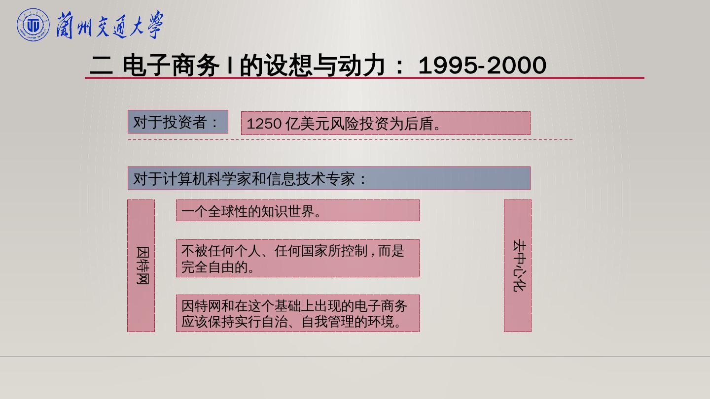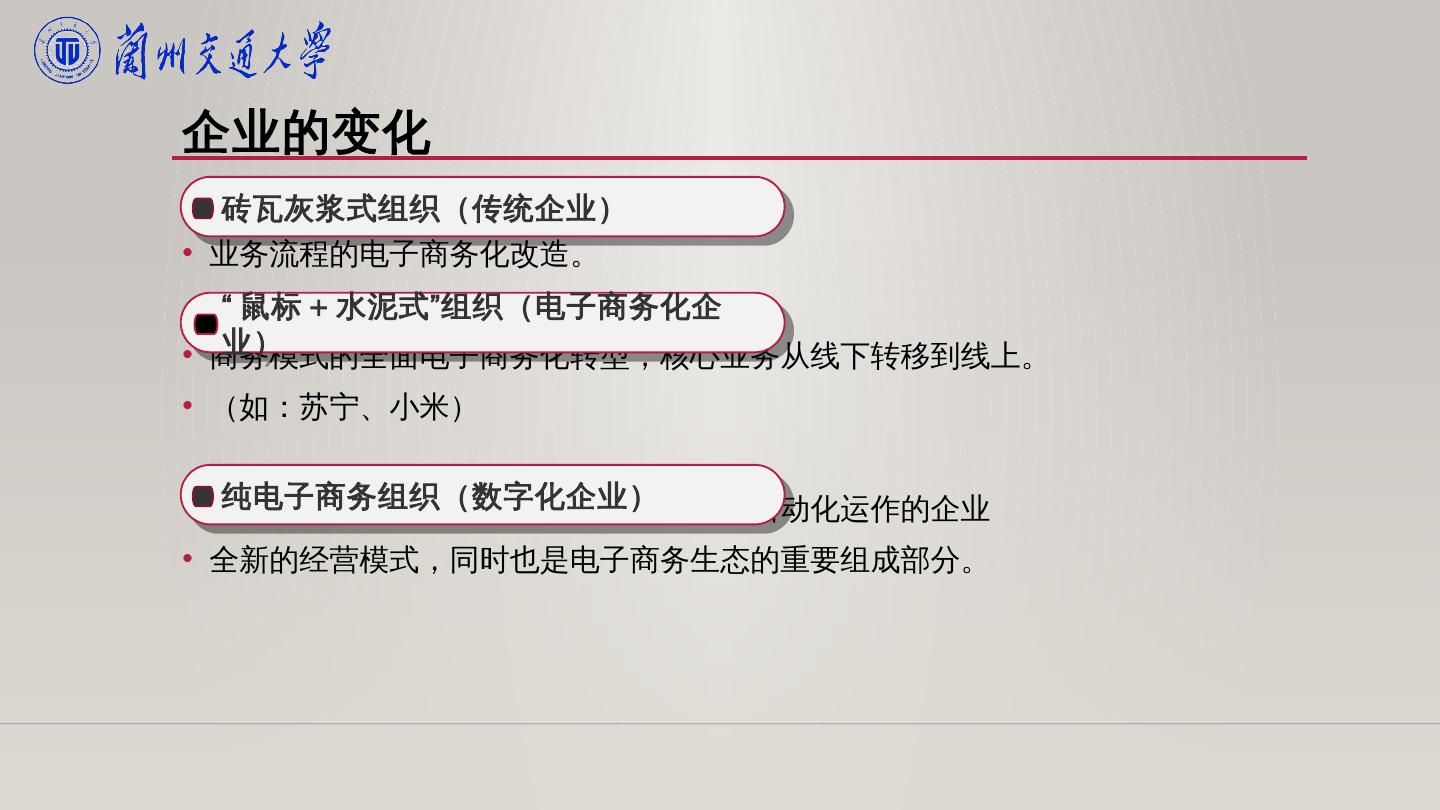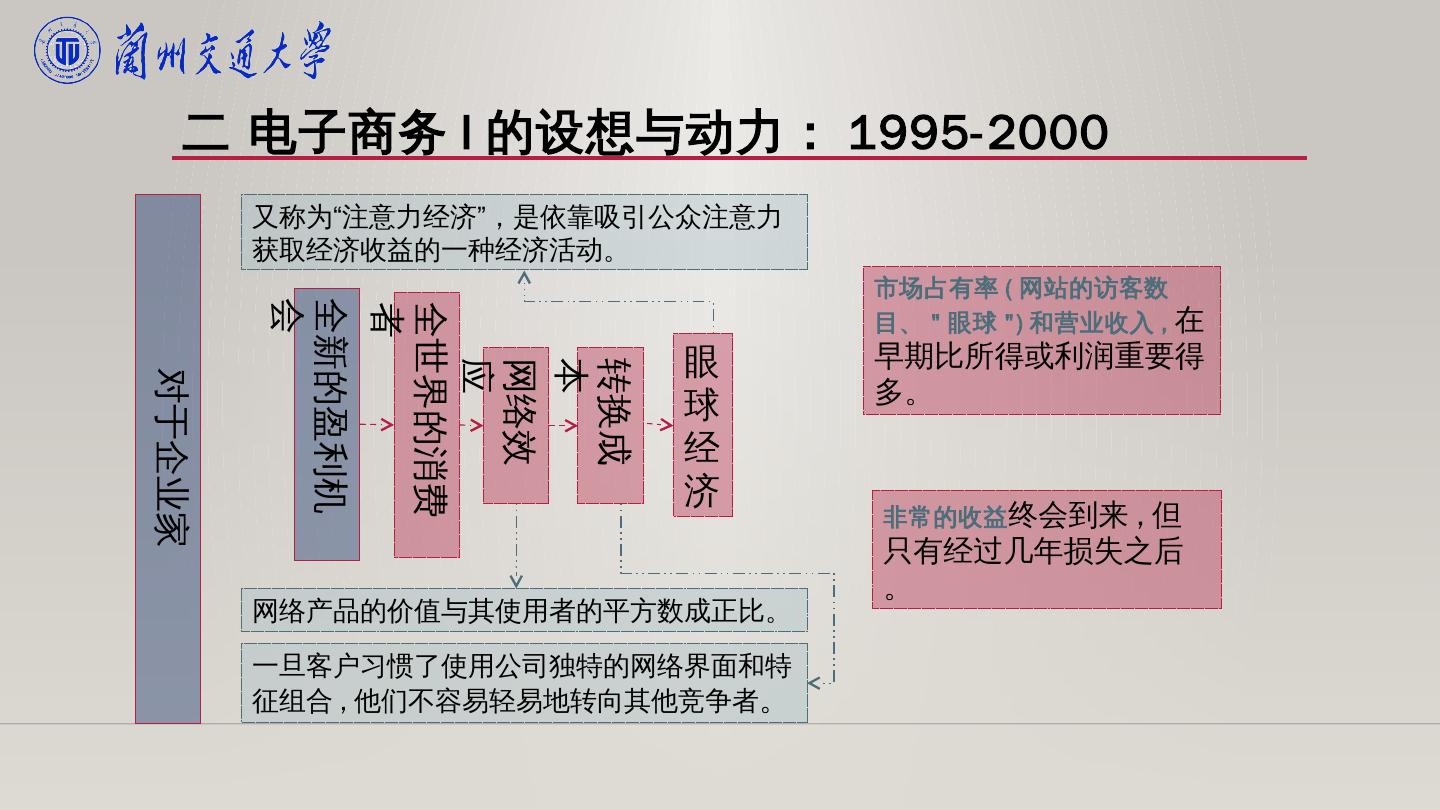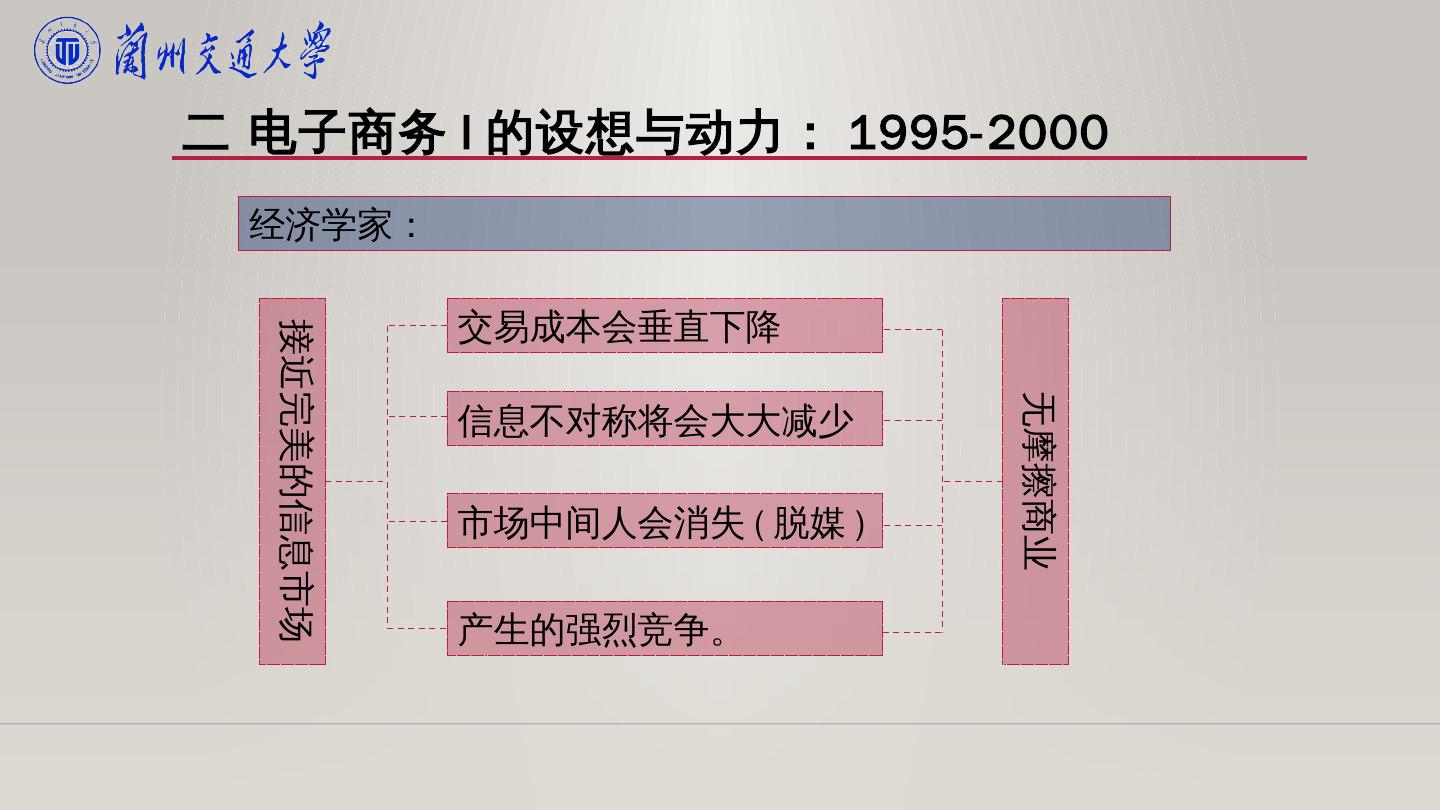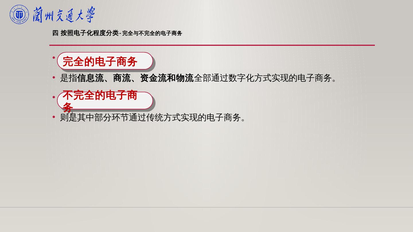 第一章 电子商务概论 ... 利用计算机和信息系统使大部分经营流程自动化运作的企业 ... 设施; (用于将商业信息与电子商务系统相结合的技术,数据库,网络服务,ERP).