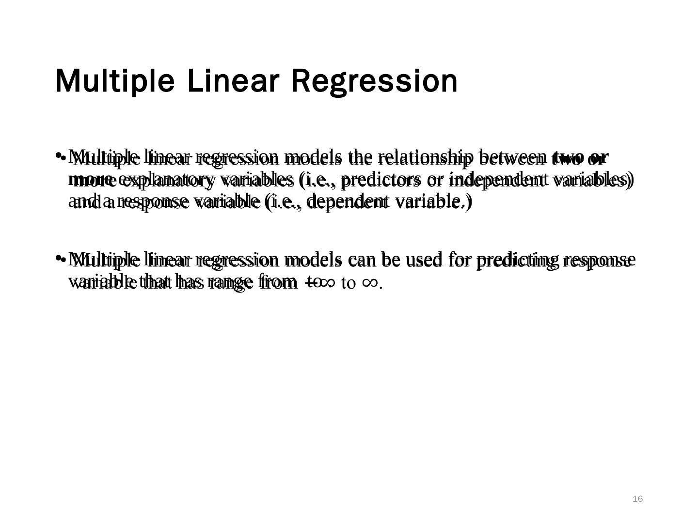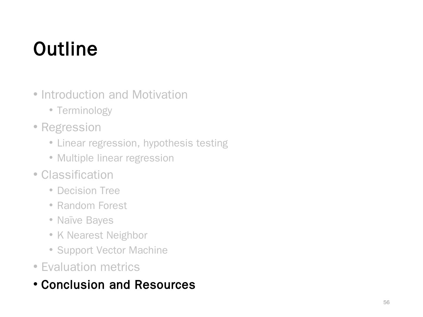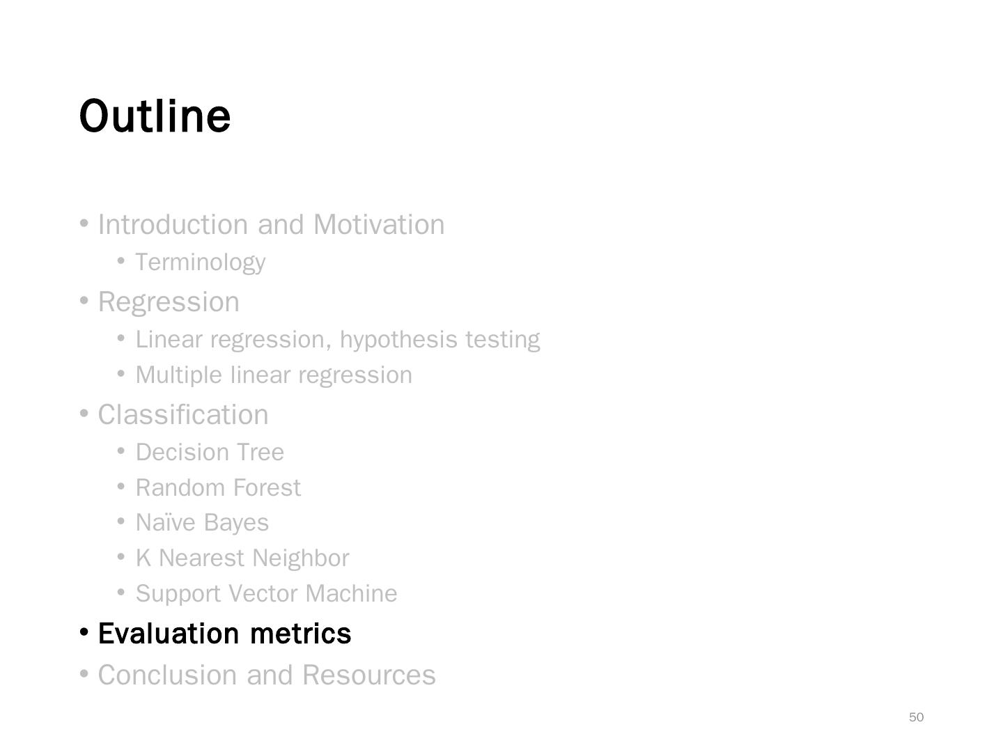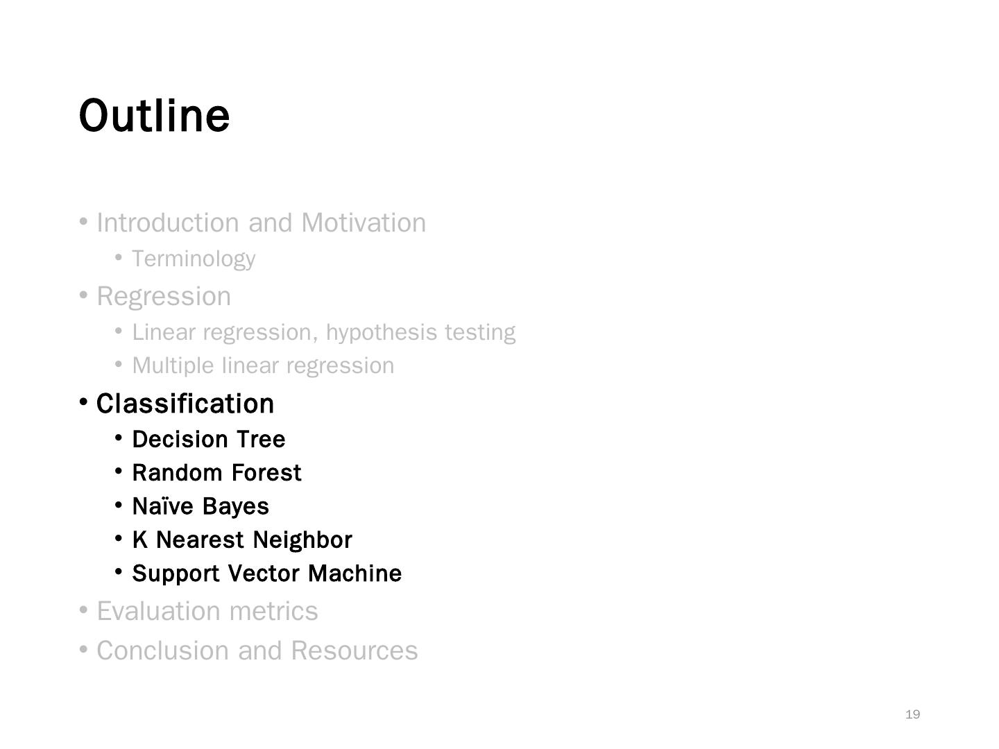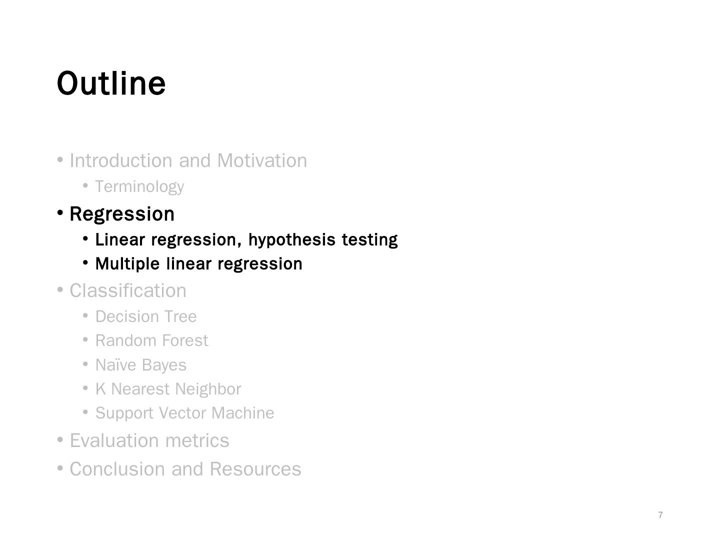 Regression. Linear regression, hypothesis testing; Multiple linear regression. Classification. Decision Tree; Random Forest; Naïve Bayes; K Nearest Neighbor ...