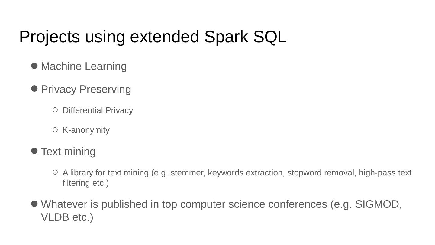 Projects on Extended Apache Spark. MapReduce. The Map function turns each input element into zero or more key-value pairs. A “key” in this sense is not ...