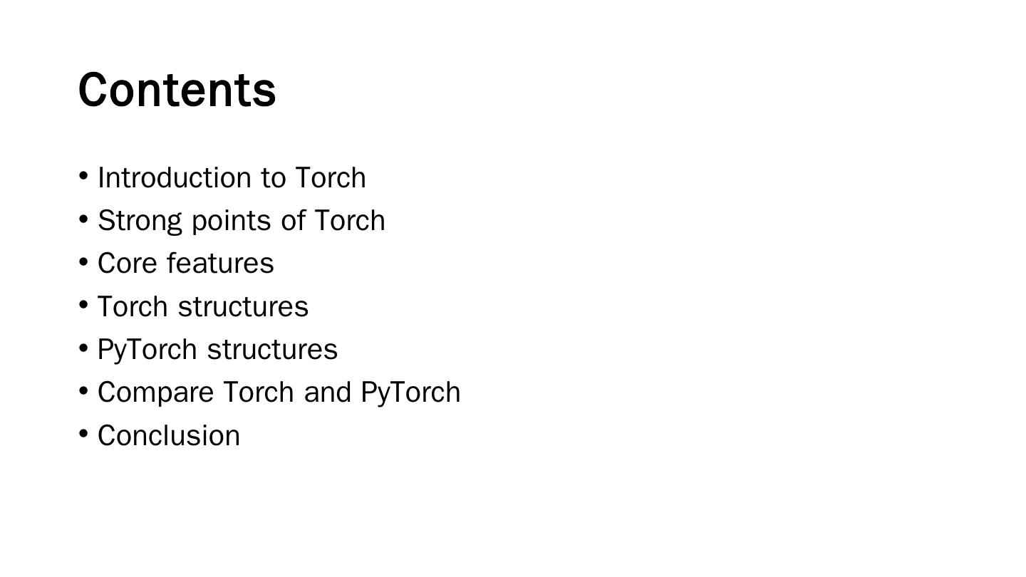 Introduction to Torch; Strong points of Torch; Core features; Torch structures; PyTorch structures; Compare Torch and PyTorch; Conclusion.