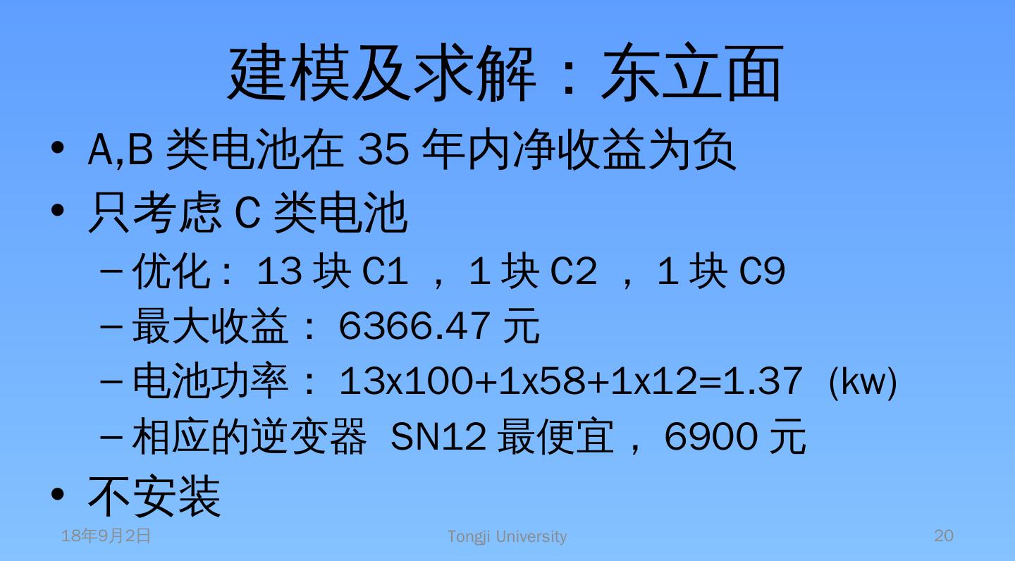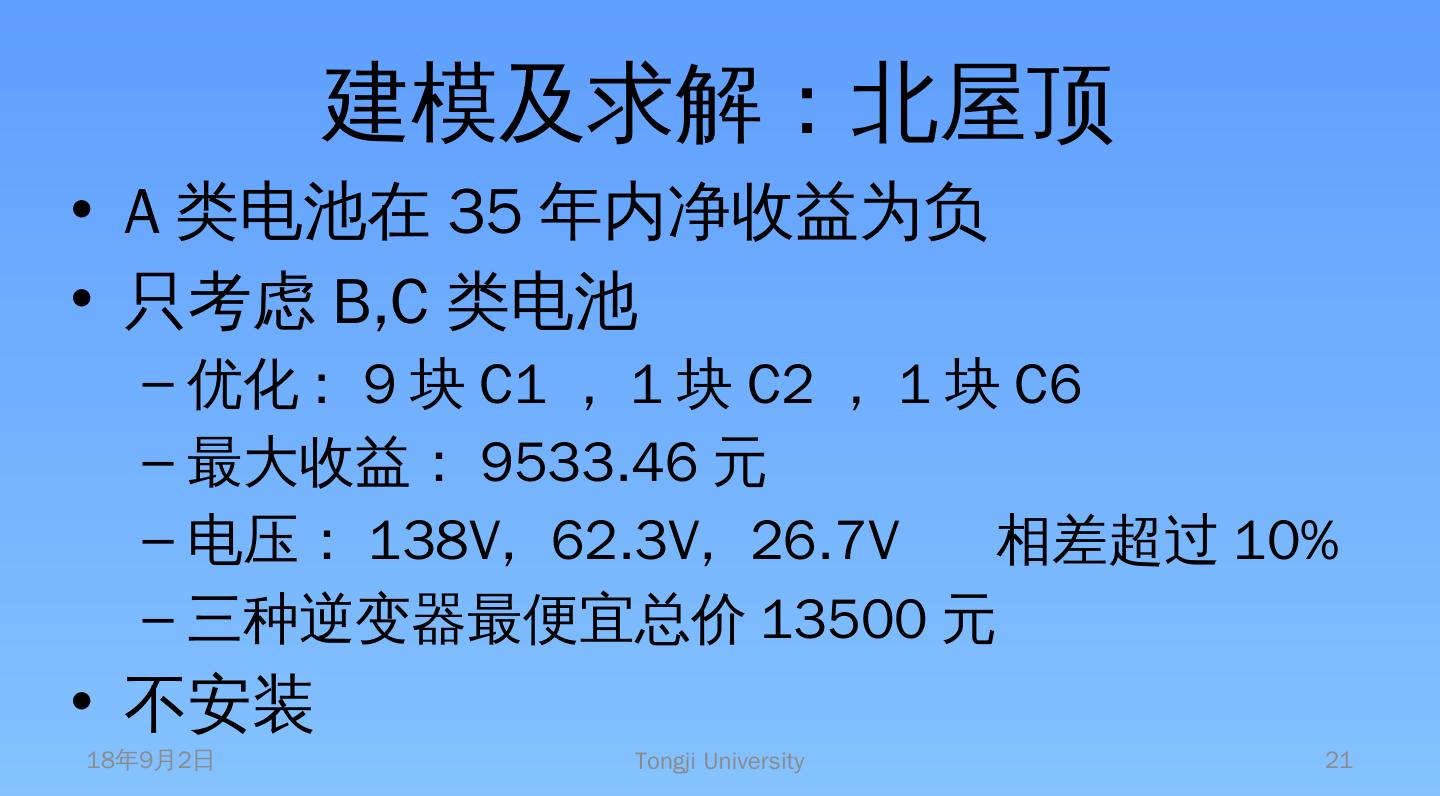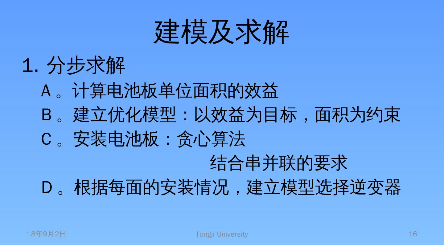 A。计算电池板单位面积的效益. B。建立优化模型:以效益为目标,面积为约束. C。 安装电池板:贪心算法. 结合串并联的要求. D。根据每面的安装情况,建立模型选择逆 ...