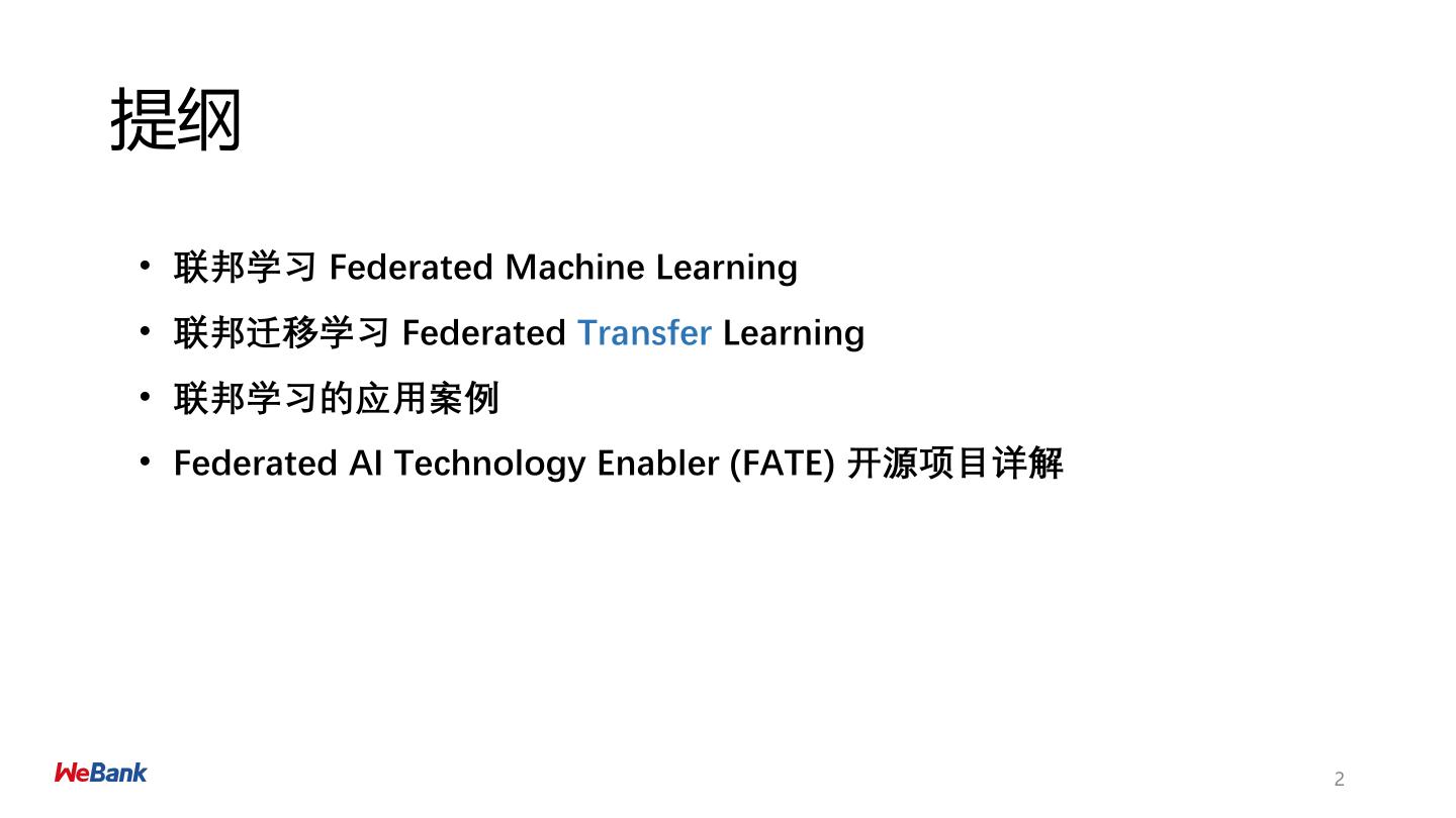 2 .提纲 • 联邦学习 Federated Machine Learning • 联邦迁移学习 Federated Transfer Learning • 联邦学习的应用案例 • Federated AI Technology Enabler (FATE) 开源项目详解 2