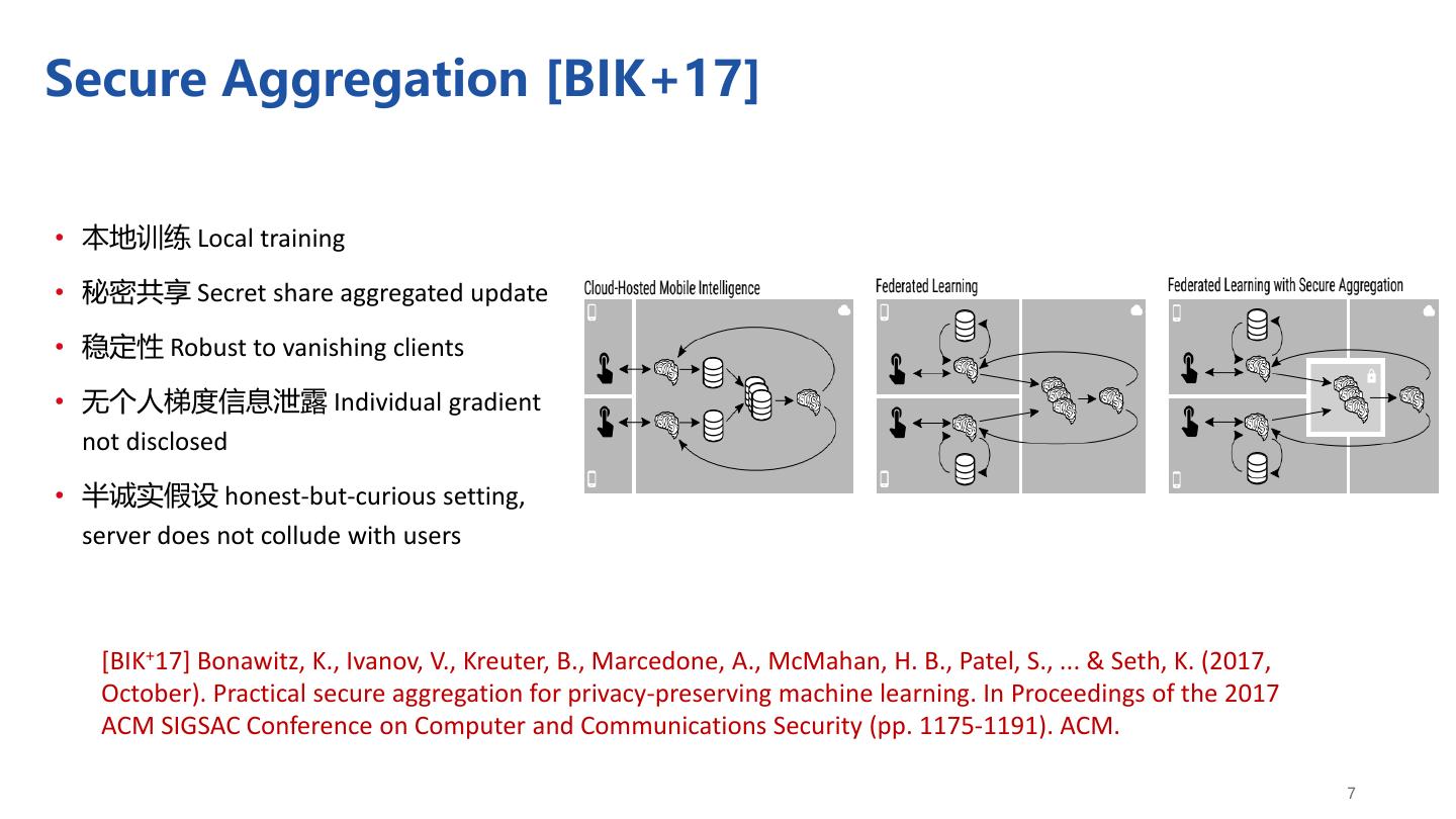7 .Secure Aggregation [BIK+17] • 本地训练 Local training • 秘密共享 Secret share aggregated update • 稳定性 Robust to vanishing clients • 无个人梯度信息泄露 Individual gradient not disclosed • 半诚实假设 honest-but-curious setting, server does not collude with users [BIK+17] Bonawitz, K., Ivanov, V., Kreuter, B., Marcedone, A., McMahan, H. B., Patel, S., ... & Seth, K. (2017, October). Practical secure aggregation for privacy-preserving machine learning. In Proceedings of the 2017 ACM SIGSAC Conference on Computer and Communications Security (pp. 1175-1191). ACM. 7