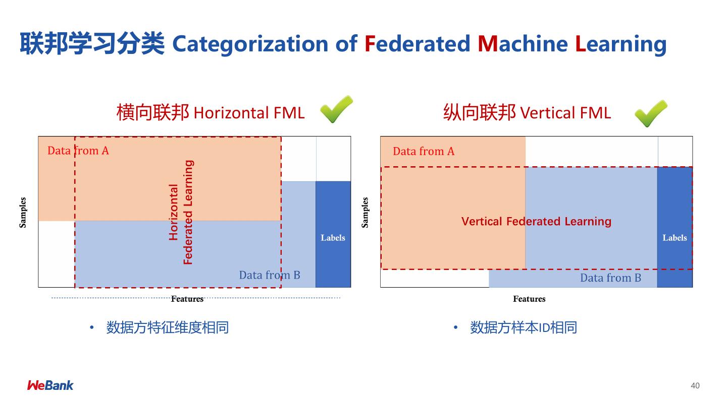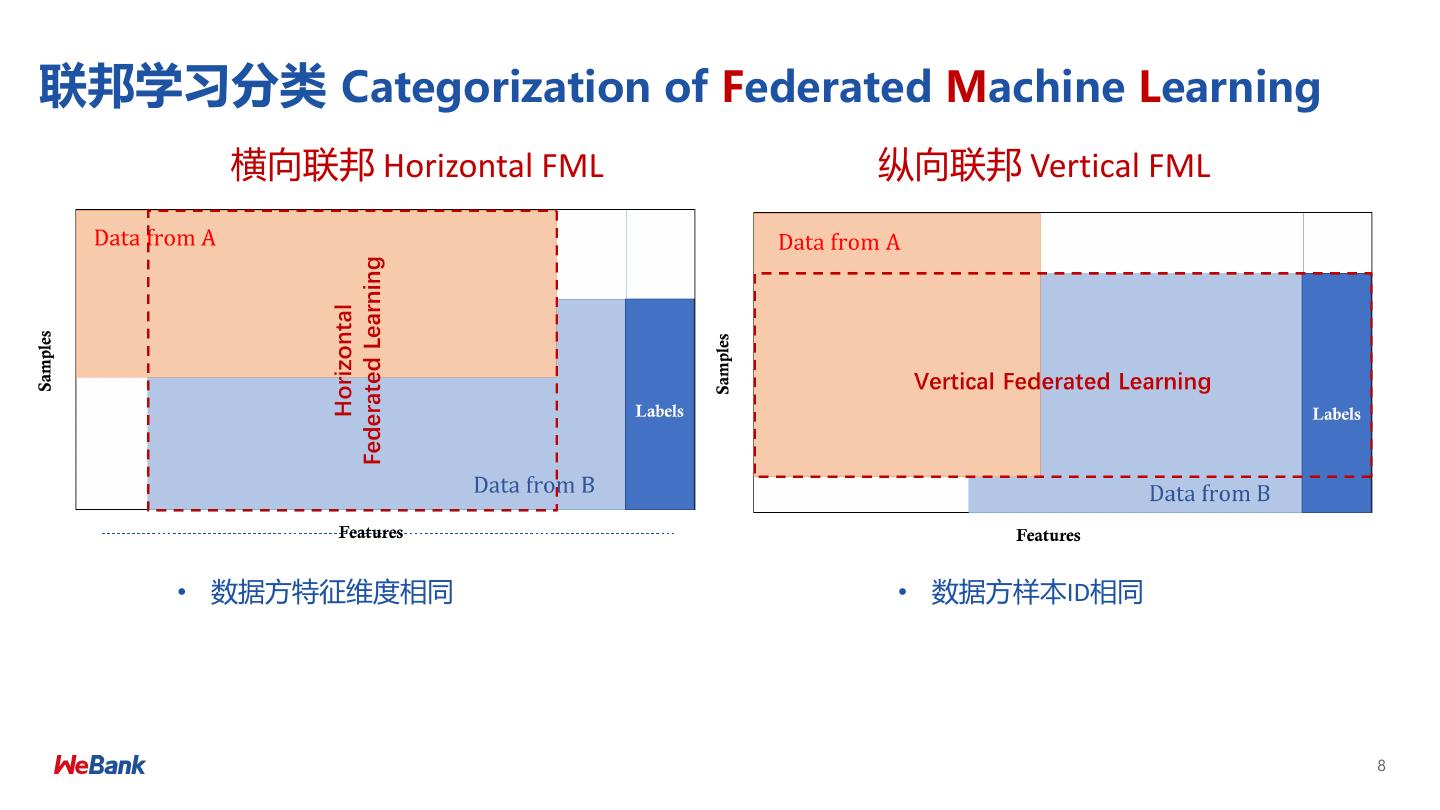 8 .联邦学习分类 Categorization of Federated Machine Learning 横向联邦 Horizontal FML 纵向联邦 Vertical FML • 数据方特征维度相同 • 数据方样本ID相同 8