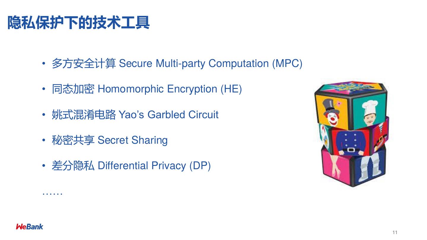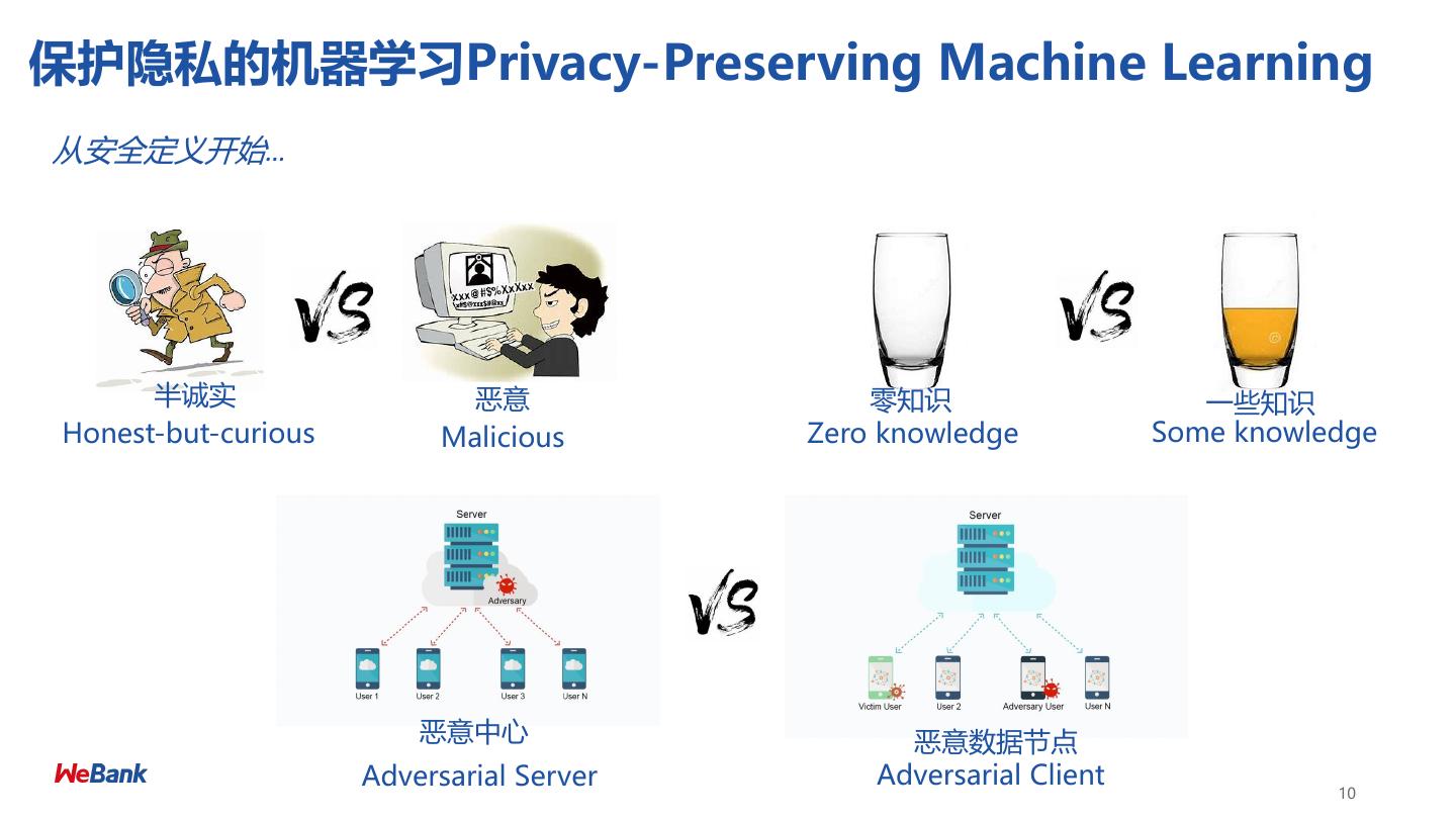 10 .保护隐私的机器学习Privacy-Preserving Machine Learning 从安全定义开始… 半诚实 恶意 零知识 一些知识 Honest-but-curious Malicious Zero knowledge Some knowledge 恶意中心 恶意数据节点 Adversarial Server Adversarial Client 10