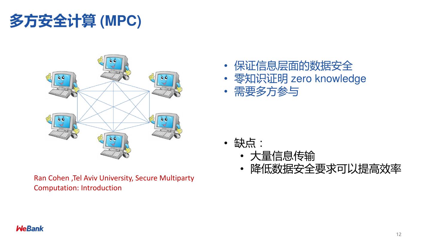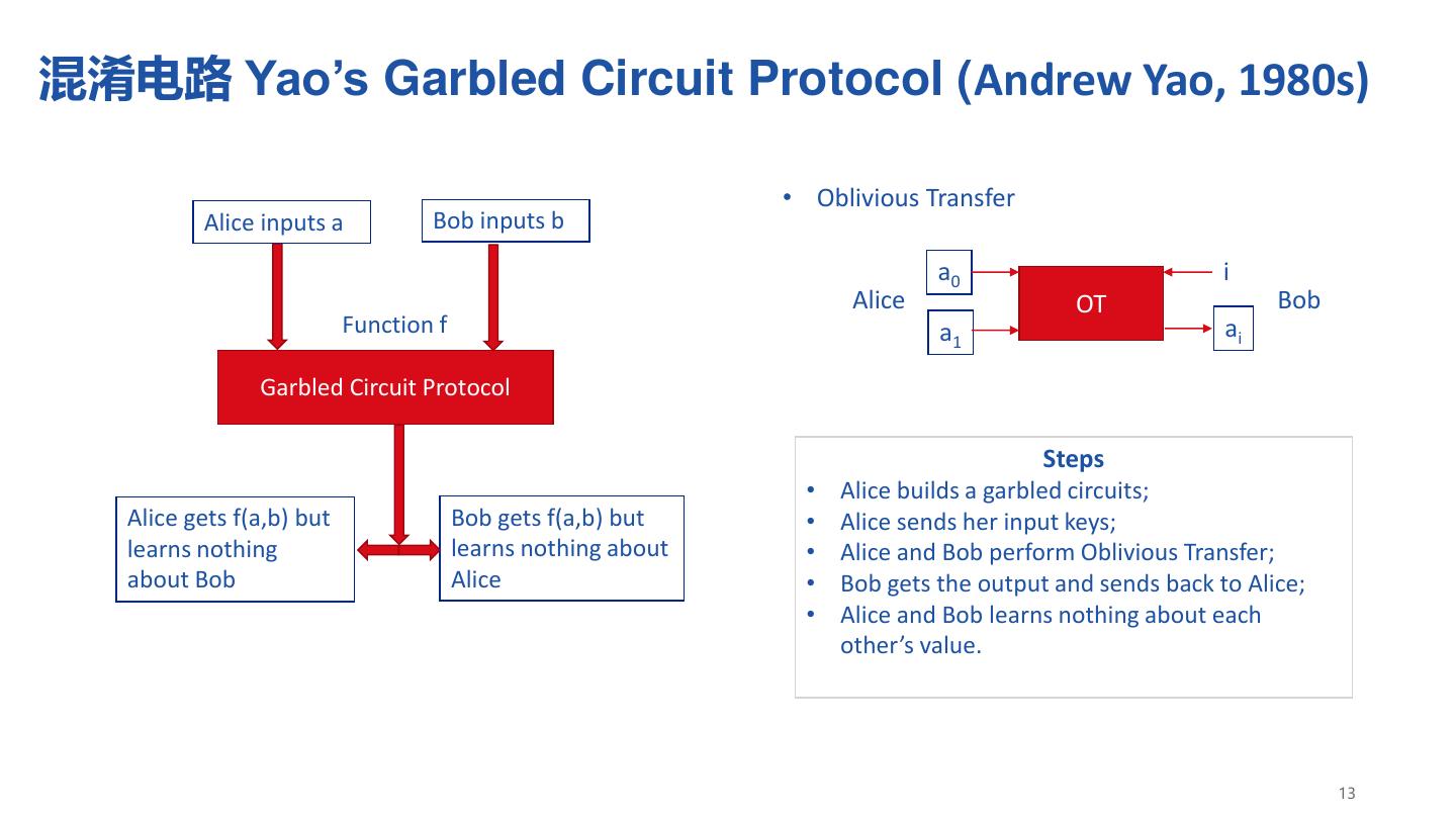 12 .多方安全计算 (MPC) • 保证信息层面的数据安全 • 零知识证明 zero knowledge • 需要多方参与 • 缺点: • 大量信息传输 • 降低数据安全要求可以提高效率 Ran Cohen ,Tel Aviv University, Secure Multiparty Computation: Introduction 12