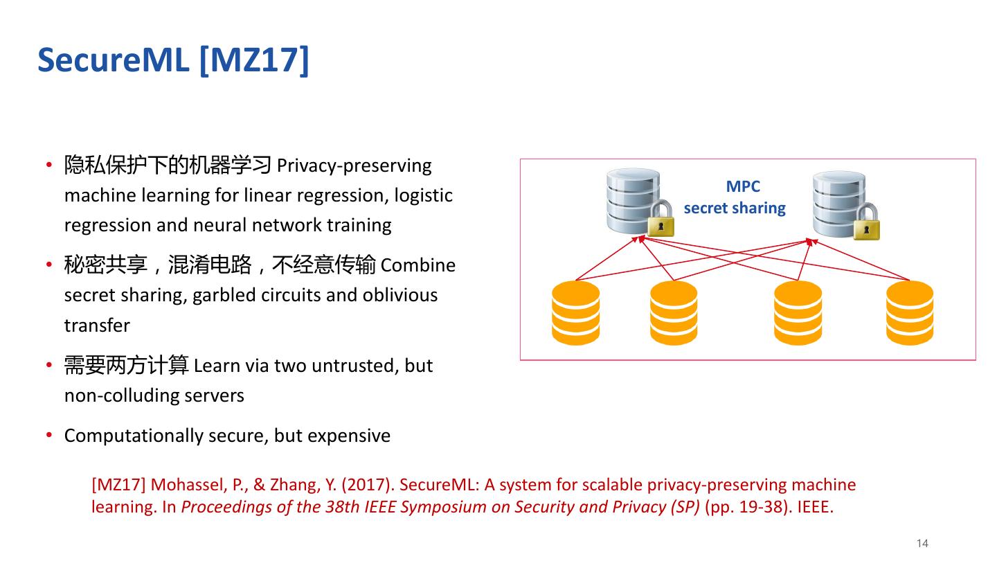 14 .SecureML [MZ17] • 隐私保护下的机器学习 Privacy-preserving MPC machine learning for linear regression, logistic secret sharing regression and neural network training • 秘密共享,混淆电路,不经意传输 Combine secret sharing, garbled circuits and oblivious transfer • 需要两方计算 Learn via two untrusted, but non-colluding servers • Computationally secure, but expensive [MZ17] Mohassel, P., & Zhang, Y. (2017). SecureML: A system for scalable privacy-preserving machine learning. In Proceedings of the 38th IEEE Symposium on Security and Privacy (SP) (pp. 19-38). IEEE. 14