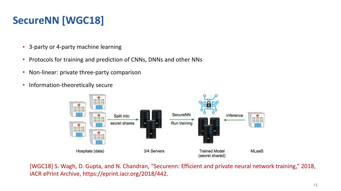 15 .SecureNN [WGC18] • 3-party or 4-party machine learning • Protocols for training and prediction of CNNs, DNNs and other NNs • Non-linear: private three-party comparison • Information-theoretically secure [WGC18] S. Wagh, D. Gupta, and N. Chandran, “Securenn: Efficient and private neural network training,” 2018, iACR ePrint Archive, https://eprint.iacr.org/2018/442. 15