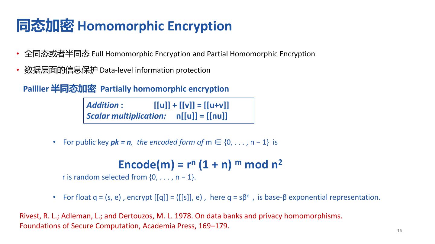 16 .同态加密 Homomorphic Encryption • 全同态或者半同态 Full Homomorphic Encryption and Partial Homomorphic Encryption • 数据层面的信息保护 Data-level information protection Paillier 半同态加密 Partially homomorphic encryption Addition : [[u]] + [[v]] = [[u+v]] Scalar multiplication: n[[u]] = [[nu]] • For public key pk = n, the encoded form of m ∈ {0, . . . , n − 1} is Encode(m) = rn (1 + n) m mod n2 r is random selected from {0, . . . , n − 1}. • For float q = (s, e) , encrypt [[q]] = ([[s]], e) , here q = sβe,is base-β exponential representation. Rivest, R. L.; Adleman, L.; and Dertouzos, M. L. 1978. On data banks and privacy homomorphisms. Foundations of Secure Computation, Academia Press, 169–179. 16