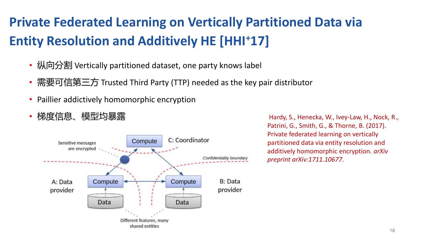 18 .Private Federated Learning on Vertically Partitioned Data via Entity Resolution and Additively HE [HHI+17] • 纵向分割 Vertically partitioned dataset, one party knows label • 需要可信第三方 Trusted Third Party (TTP) needed as the key pair distributor • Paillier addictively homomorphic encryption • 梯度信息、模型均暴露 Hardy, S., Henecka, W., Ivey-Law, H., Nock, R., Patrini, G., Smith, G., & Thorne, B. (2017). Private federated learning on vertically partitioned data via entity resolution and additively homomorphic encryption. arXiv preprint arXiv:1711.10677. 18