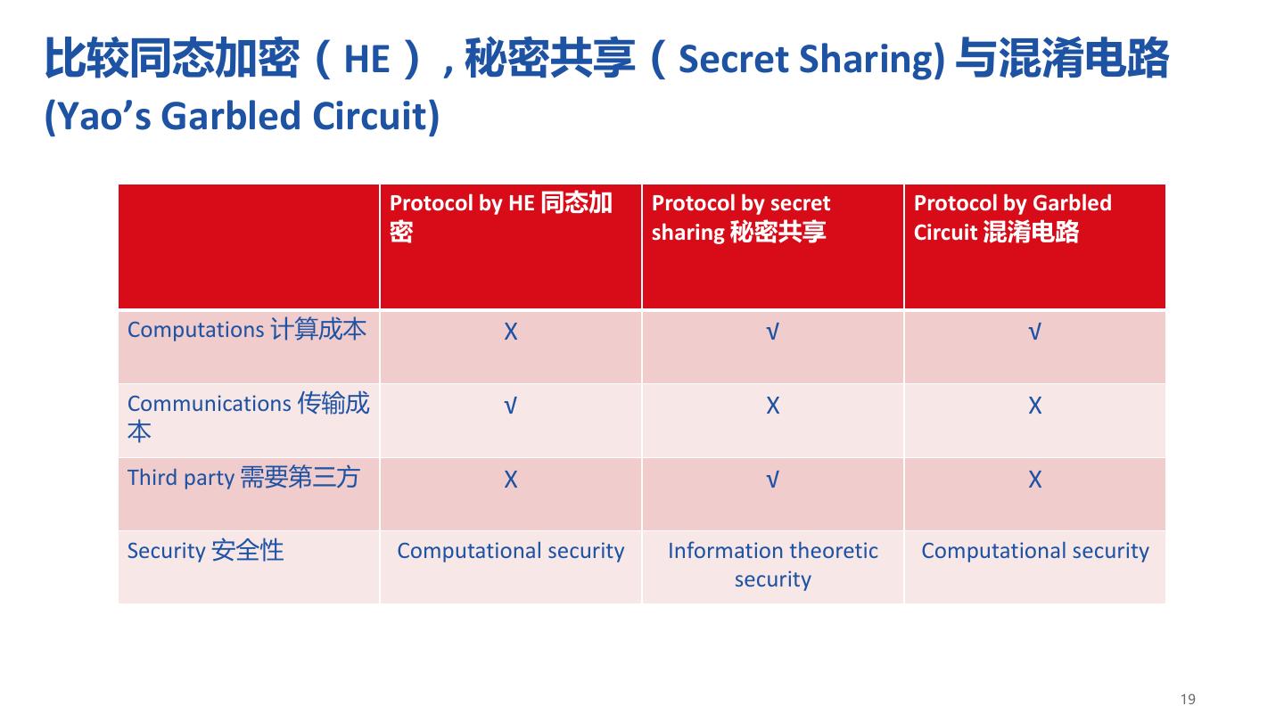 19 .比较同态加密(HE) , 秘密共享(Secret Sharing) 与混淆电路 (Yao’s Garbled Circuit) Protocol by HE 同态加 Protocol by secret Protocol by Garbled 密 sharing 秘密共享 Circuit 混淆电路 Computations 计算成本 X √ √ Communications 传输成 √ X X 本 Third party 需要第三方 X √ X Security 安全性 Computational security Information theoretic Computational security security 19