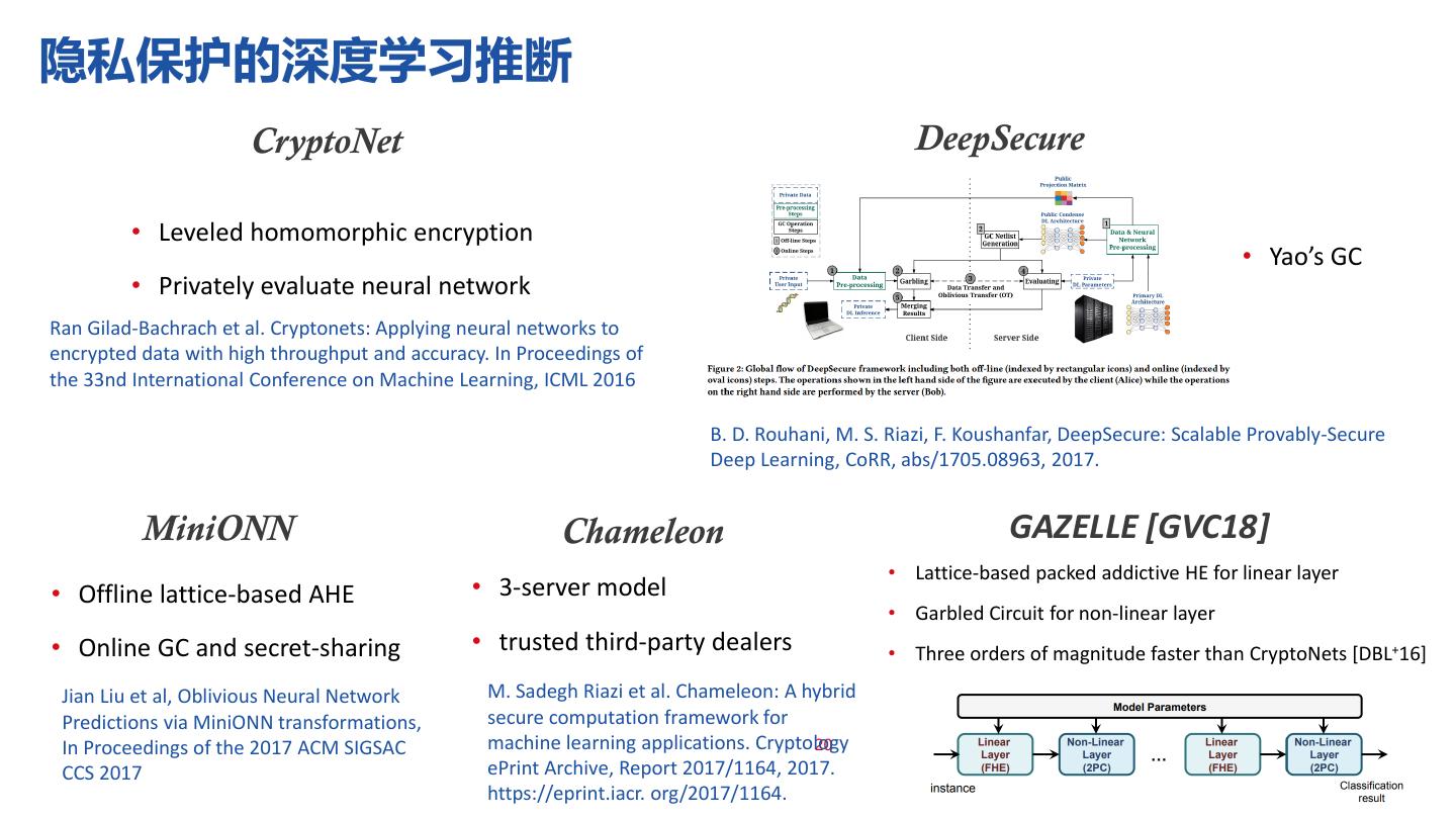 20 .隐私保护的深度学习推断 CryptoNet DeepSecure • Leveled homomorphic encryption • Yao’s GC • Privately evaluate neural network Ran Gilad-Bachrach et al. Cryptonets: Applying neural networks to encrypted data with high throughput and accuracy. In Proceedings of the 33nd International Conference on Machine Learning, ICML 2016 B. D. Rouhani, M. S. Riazi, F. Koushanfar, DeepSecure: Scalable Provably-Secure Deep Learning, CoRR, abs/1705.08963, 2017. MiniONN Chameleon GAZELLE [GVC18] • Lattice-based packed addictive HE for linear layer • Offline lattice-based AHE • 3-server model • Garbled Circuit for non-linear layer • Online GC and secret-sharing • trusted third-party dealers • Three orders of magnitude faster than CryptoNets [DBL+16] Jian Liu et al, Oblivious Neural Network M. Sadegh Riazi et al. Chameleon: A hybrid Predictions via MiniONN transformations, secure computation framework for In Proceedings of the 2017 ACM SIGSAC machine learning applications. Cryptology 20 CCS 2017 ePrint Archive, Report 2017/1164, 2017. https://eprint.iacr. org/2017/1164.