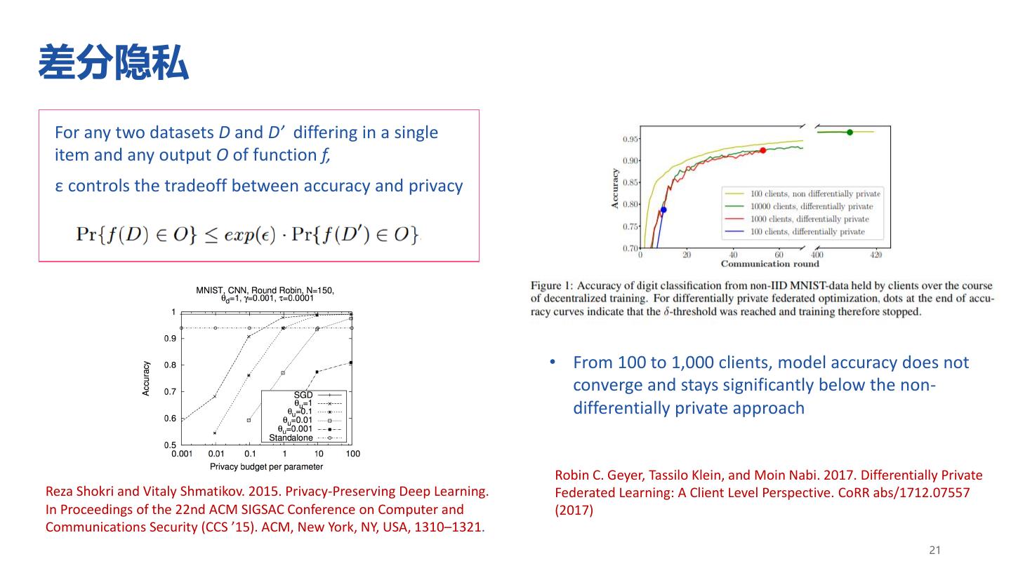 21 .差分隐私 For any two datasets D and D’ differing in a single item and any output O of function f, ε controls the tradeoff between accuracy and privacy • From 100 to 1,000 clients, model accuracy does not converge and stays significantly below the non- differentially private approach Robin C. Geyer, Tassilo Klein, and Moin Nabi. 2017. Differentially Private Reza Shokri and Vitaly Shmatikov. 2015. Privacy-Preserving Deep Learning. Federated Learning: A Client Level Perspective. CoRR abs/1712.07557 In Proceedings of the 22nd ACM SIGSAC Conference on Computer and (2017) Communications Security (CCS ’15). ACM, New York, NY, USA, 1310–1321. 21