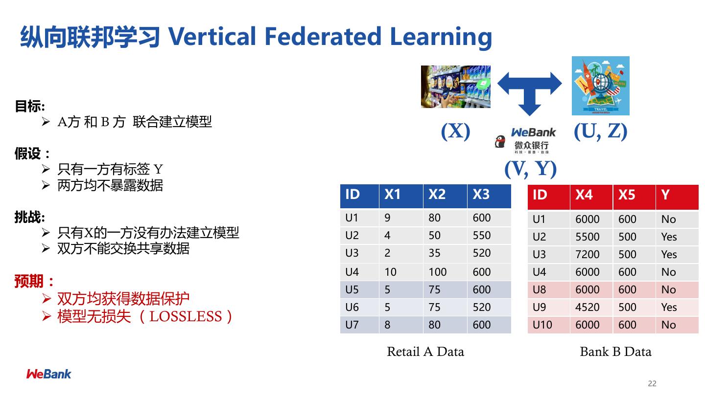 22 .纵向联邦学习 Vertical Federated Learning 目标: ➢ A方 和 B 方 联合建立模型 (X) (U, Z) 假设: ➢ 只有一方有标签 Y (V, Y) ➢ 两方均不暴露数据 ID X1 X2 X3 ID X4 X5 Y 挑战: U1 9 80 600 U1 6000 600 No ➢ 只有X的一方没有办法建立模型 U2 4 50 550 U2 5500 500 Yes ➢ 双方不能交换共享数据 U3 2 35 520 U3 7200 500 Yes U4 10 100 600 U4 6000 600 No 预期: U5 5 75 600 U8 6000 600 No ➢ 双方均获得数据保护 U6 5 75 520 U9 4520 500 Yes ➢ 模型无损失 (LOSSLESS) U7 8 80 600 U10 6000 600 No Retail A Data Bank B Data 22