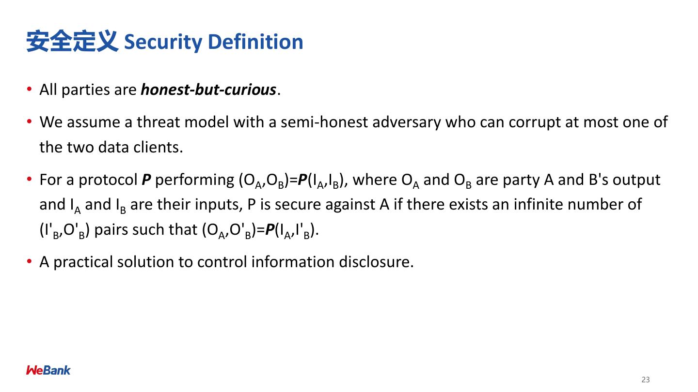 23 .安全定义 Security Definition • All parties are honest-but-curious. • We assume a threat model with a semi-honest adversary who can corrupt at most one of the two data clients. • For a protocol P performing (OA,OB)=P(IA,IB), where OA and OB are party A and B's output and IA and IB are their inputs, P is secure against A if there exists an infinite number of (I'B,O'B) pairs such that (OA,O'B)=P(IA,I'B). • A practical solution to control information disclosure. 23
