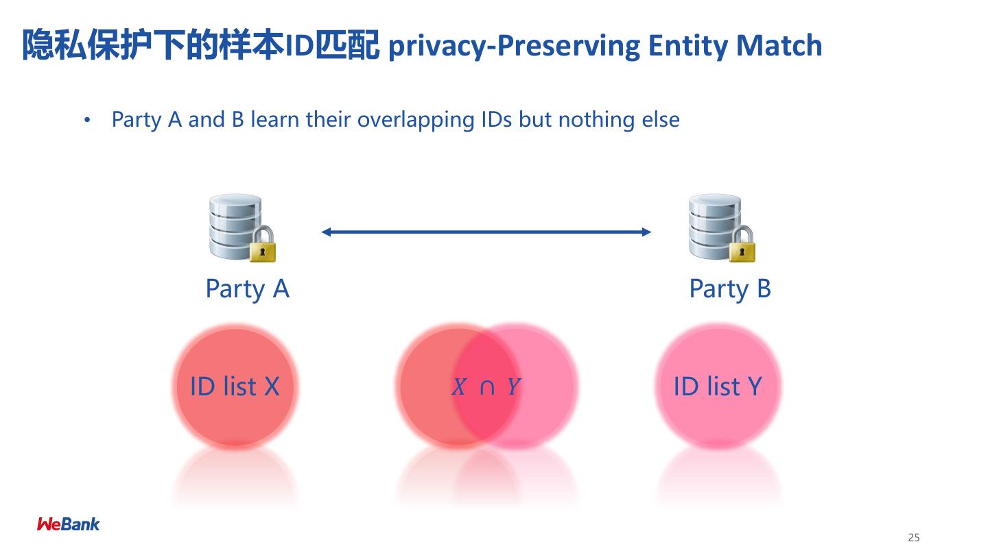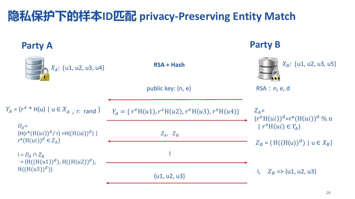 25 .隐私保护下的样本ID匹配 privacy-Preserving Entity Match • Party A and B learn their overlapping IDs but nothing else Party A Party B ID list X 𝑋 ∩ 𝑌 ID list Y 25