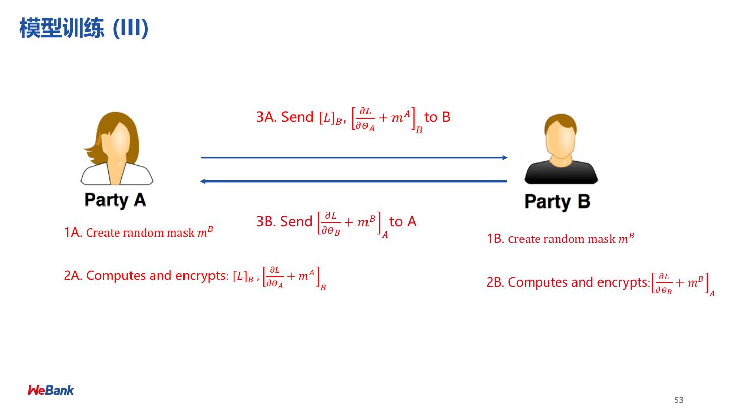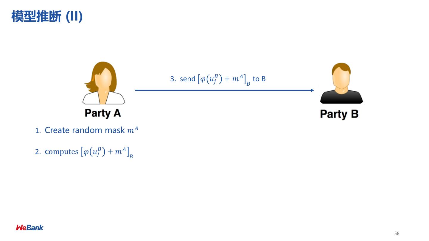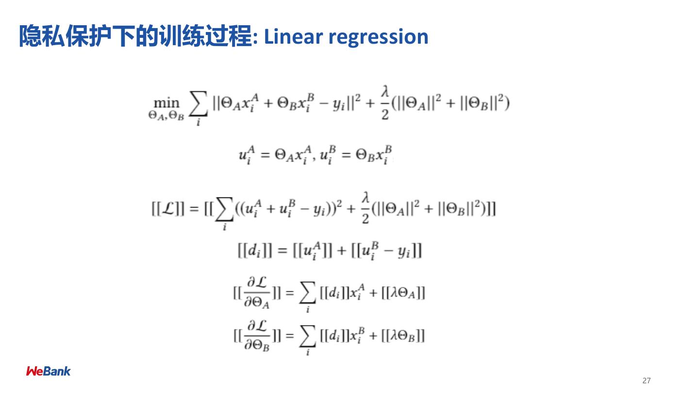 26 .隐私保护下的样本ID匹配 privacy-Preserving Entity Match Party A Party B RSA + Hash 𝑋𝐵 : {u1, u2, u3, u5} 𝑋𝐴 : {u1, u2, u3, u4} public key: (n, e) RSA:n, e, d 𝑌𝐴 = {𝑟 𝑒 * H(u) | u ∈ 𝑋𝐴,r: rand } 𝑌𝐴 = { 𝑟 𝑒 H 𝑢1 , 𝑟 𝑒 H 𝑢2 , 𝑟 𝑒 H 𝑢3 , 𝑟 𝑒 H 𝑢4 } 𝑍𝐴 = (𝑟 𝑒 H 𝑢𝑖 )𝑑 =r*(H 𝑢𝑖 )𝑑 % n 𝐷𝐴 = | 𝑟 𝑒 H 𝑢𝑖 ∈ 𝑌𝐴 } {H(r*(H 𝑢𝑖 )𝑑 / r) =H((H 𝑢i )𝑑 ) | 𝑍𝐴 , 𝑍𝐵 r*(H(𝑢𝑖))𝑑 ∈ 𝑍𝐴 } 𝑍𝐵 = { H((H(u))𝑑 ) | u ∈ 𝑋𝐵 } I = 𝐷𝐴 ∩ 𝑍𝐵 I = {H((H 𝑢1 )𝑑 ), H((H 𝑢2 )𝑑 ), H((H(𝑢3))𝑑 )} I, 𝑍𝐵 => {u1, u2, u3} {u1, u2, u3} 26