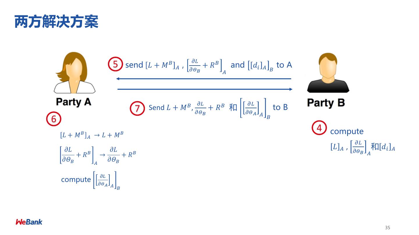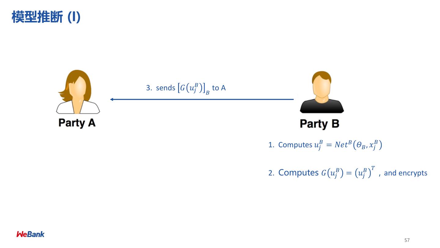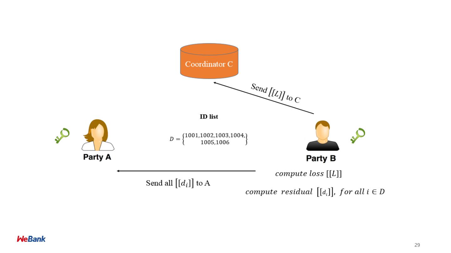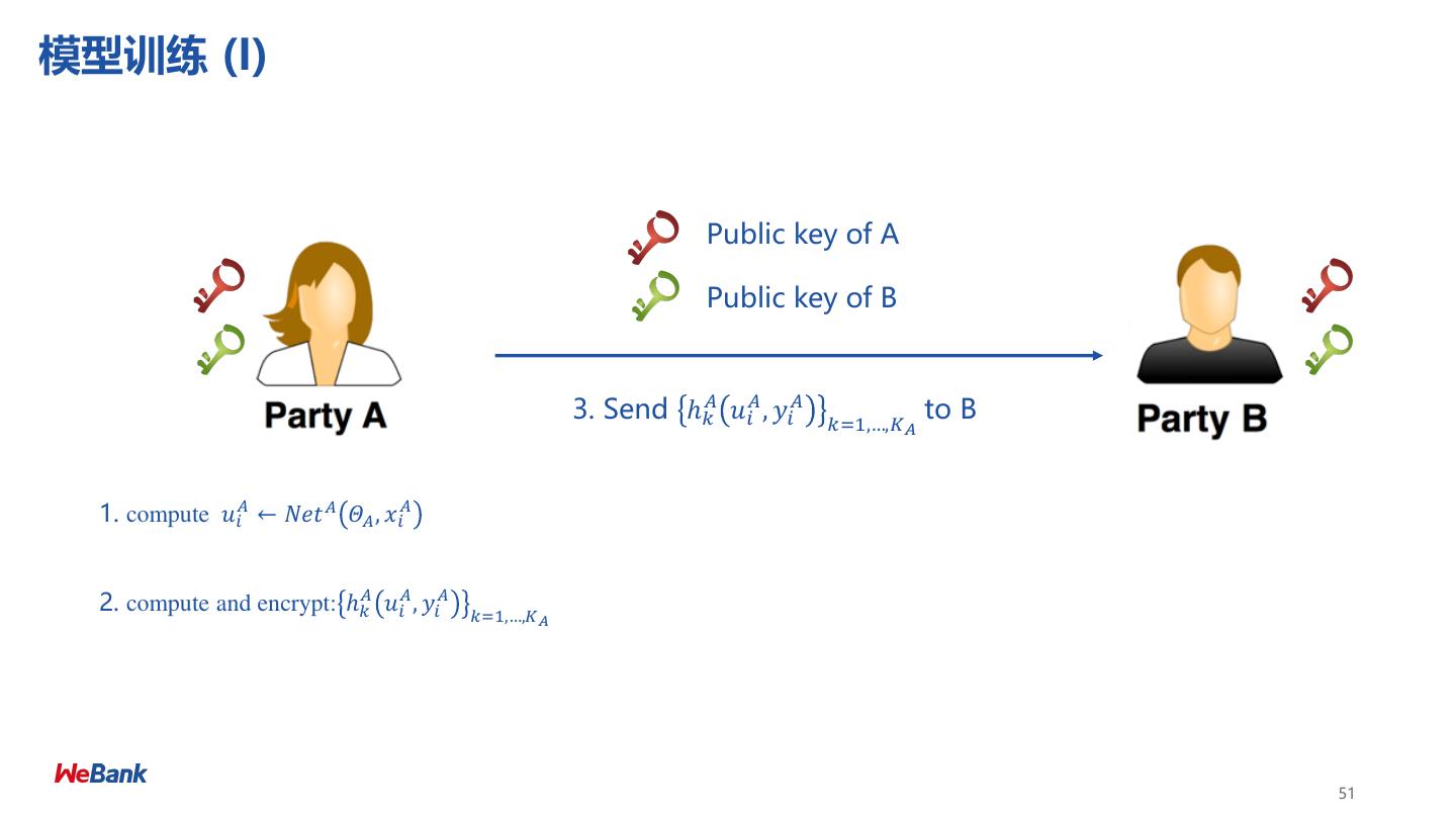 26 .隐私保护下的样本ID匹配 privacy-Preserving Entity Match Party A Party B RSA + Hash 𝑋𝐵 : {u1, u2, u3, u5} 𝑋𝐴 : {u1, u2, u3, u4} public key: (n, e) RSA:n, e, d 𝑌𝐴 = {𝑟 𝑒 * H(u) | u ∈ 𝑋𝐴,r: rand } 𝑌𝐴 = { 𝑟 𝑒 H 𝑢1 , 𝑟 𝑒 H 𝑢2 , 𝑟 𝑒 H 𝑢3 , 𝑟 𝑒 H 𝑢4 } 𝑍𝐴 = (𝑟 𝑒 H 𝑢𝑖 )𝑑 =r*(H 𝑢𝑖 )𝑑 % n 𝐷𝐴 = | 𝑟 𝑒 H 𝑢𝑖 ∈ 𝑌𝐴 } {H(r*(H 𝑢𝑖 )𝑑 / r) =H((H 𝑢i )𝑑 ) | 𝑍𝐴 , 𝑍𝐵 r*(H(𝑢𝑖))𝑑 ∈ 𝑍𝐴 } 𝑍𝐵 = { H((H(u))𝑑 ) | u ∈ 𝑋𝐵 } I = 𝐷𝐴 ∩ 𝑍𝐵 I = {H((H 𝑢1 )𝑑 ), H((H 𝑢2 )𝑑 ), H((H(𝑢3))𝑑 )} I, 𝑍𝐵 => {u1, u2, u3} {u1, u2, u3} 26