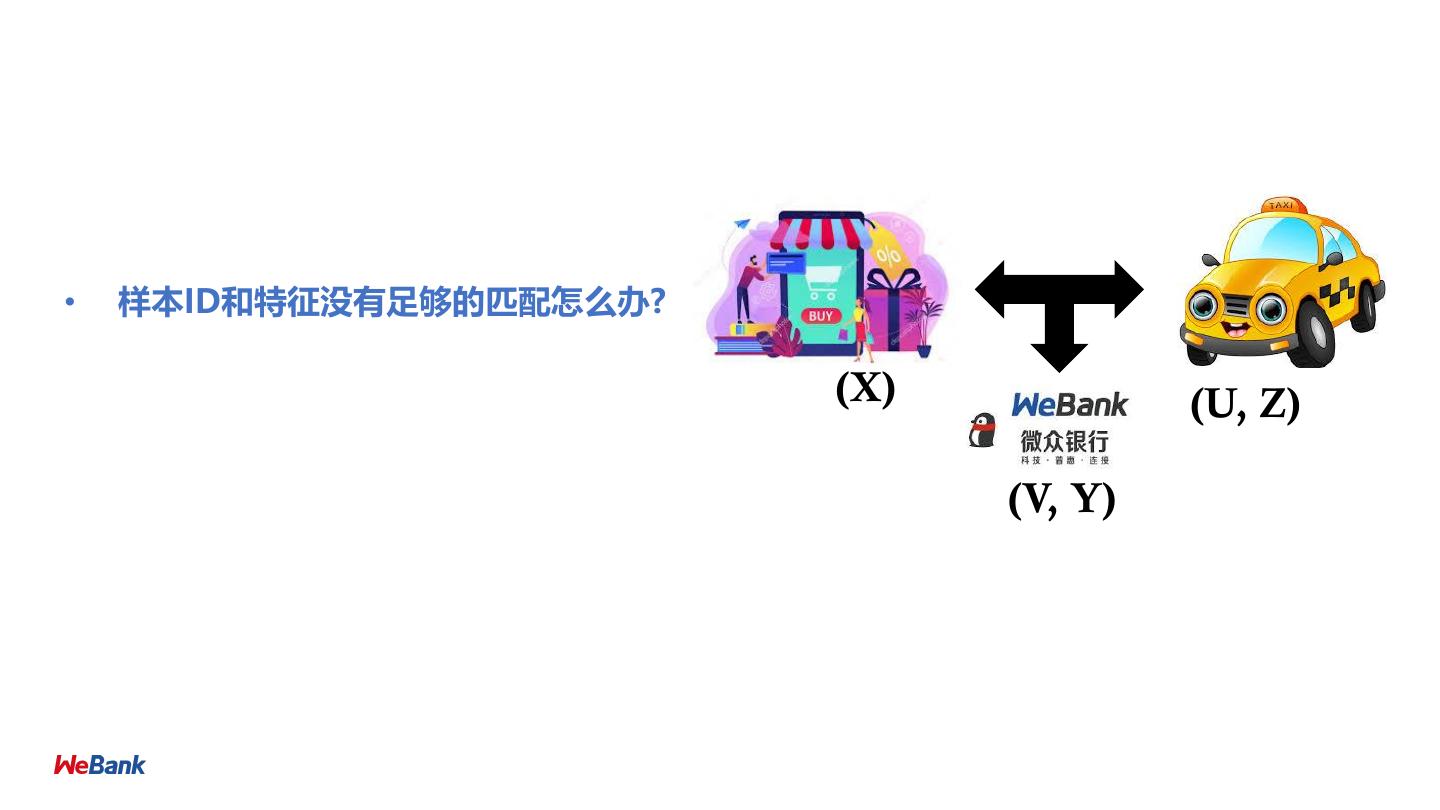9 .纵向联邦学习 Vertical Federated Learning 目标: ➢ A方 和 B 方 联合建立模型 (X) (U, Z) 假设: ➢ 只有一方有标签 Y (V, Y) ➢ 两方均不暴露数据 ID X1 X2 X3 ID X4 X5 Y 挑战: U1 9 80 600 U1 6000 600 No ➢ 只有X的一方没有办法建立模型 U2 4 50 550 U2 5500 500 Yes ➢ 双方不能交换共享数据 U3 2 35 520 U3 7200 500 Yes U4 10 100 600 U4 6000 600 No 预期: U5 5 75 600 U8 6000 600 No ➢ 双方均获得数据保护 U6 5 75 520 U9 4520 500 Yes ➢ 模型无损失 (LOSSLESS) U7 8 80 600 U10 6000 600 No Retail A Data Bank B Data 9
