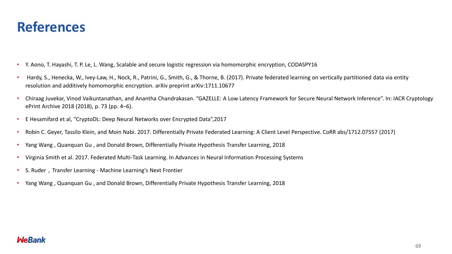 6 . 梯度是否泄露信息? 同态加密保护梯度更新 Le Trieu Phong, Yoshinori Aono, Takuya Hayashi, Lihua Wang, and Shiho Moriai. 2018. Privacy-Preserving Deep Learning via Additively Homomorphic Encryption. IEEE Trans. Information Forensics and Security,13, 5 * Q. Yang, Y. Liu, T. Chen & Y. Tong, Federated machine learning: (2018),1333–1345 Concepts and applications, ACM Transactions on Intelligent Systems and Technology (TIST) 10(2), 12:1-12:19, 2019 6