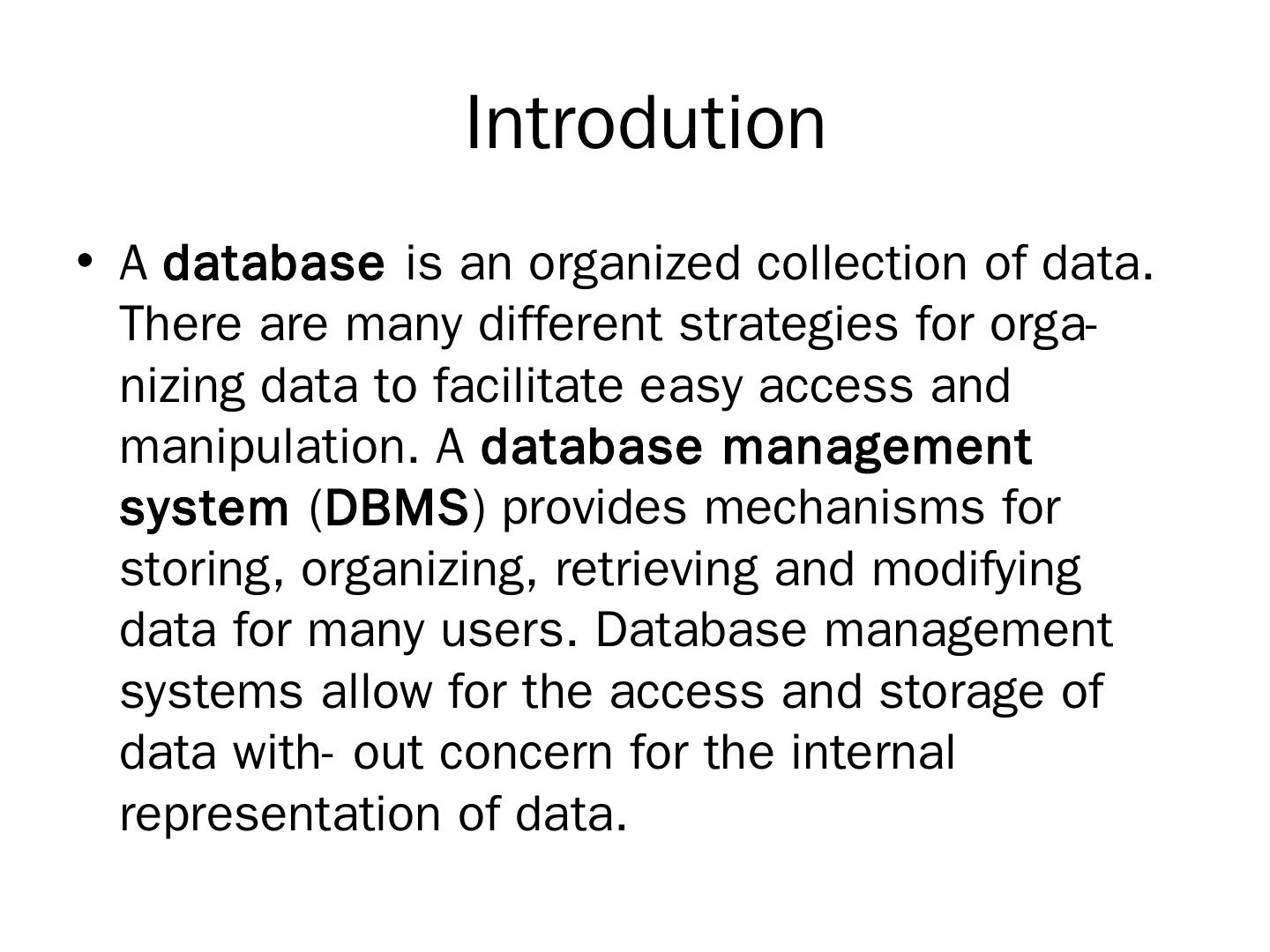 Accessing Databases with JDBC. Introduction. Introdution. A database is an organized collection of data. There are many different strategies for orga- nizing ...