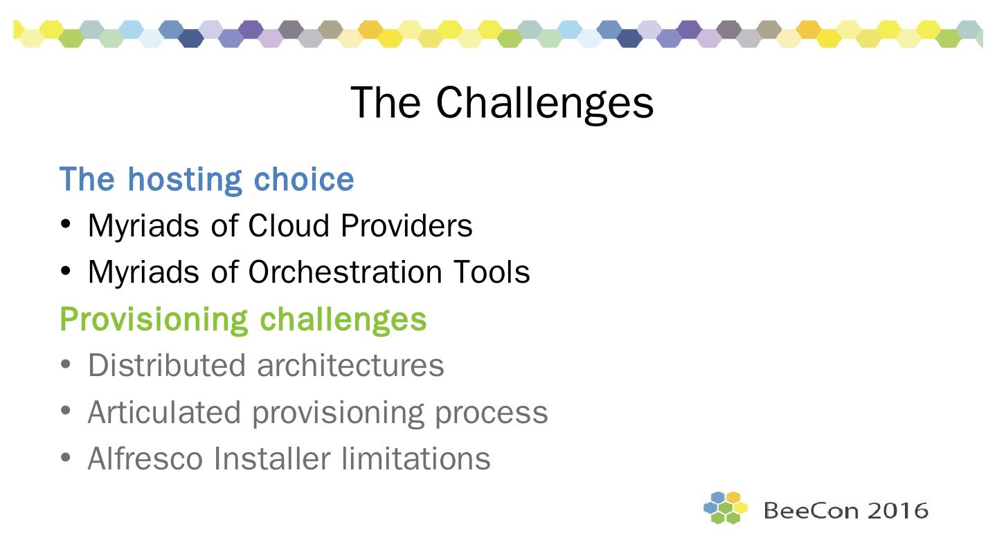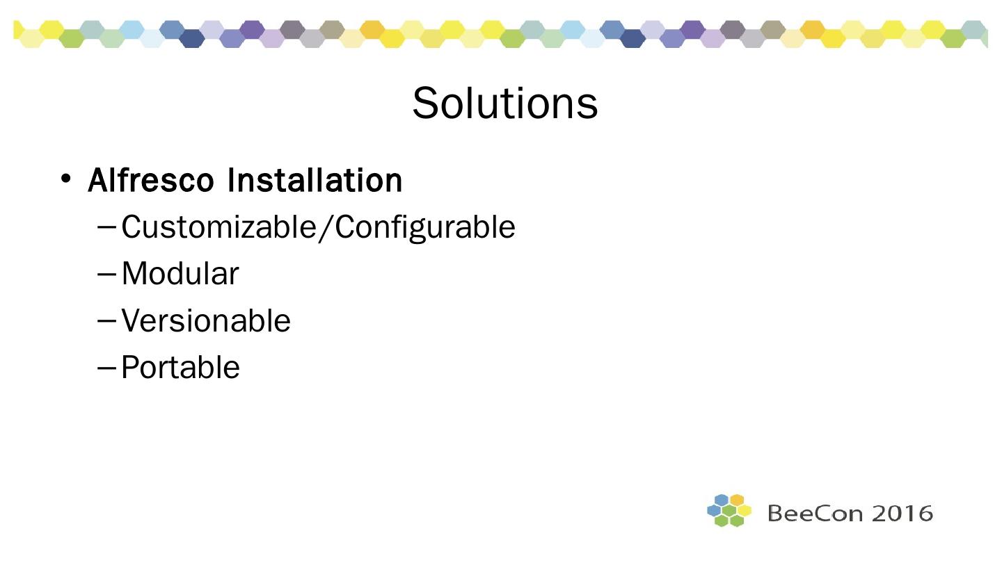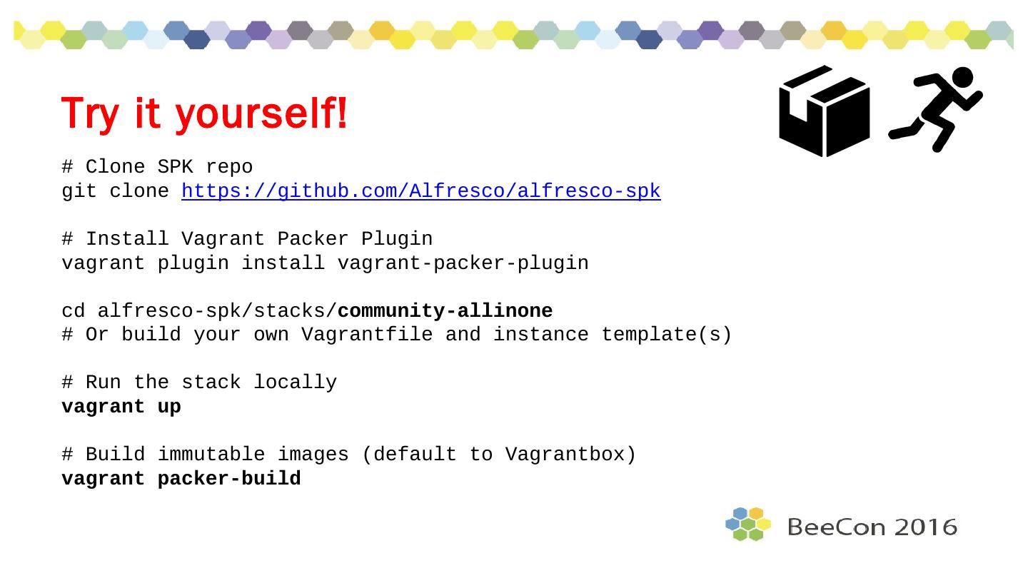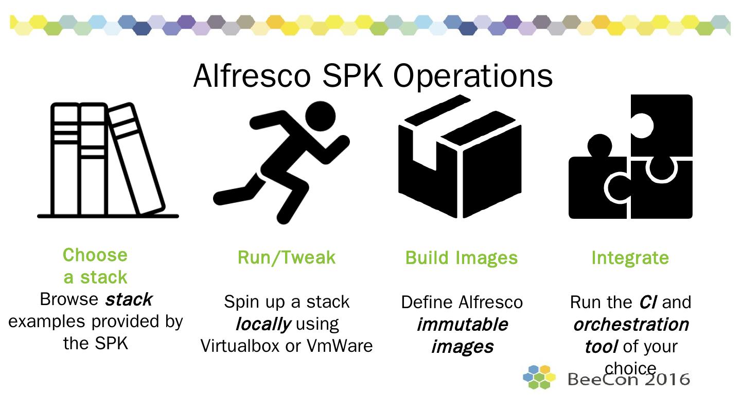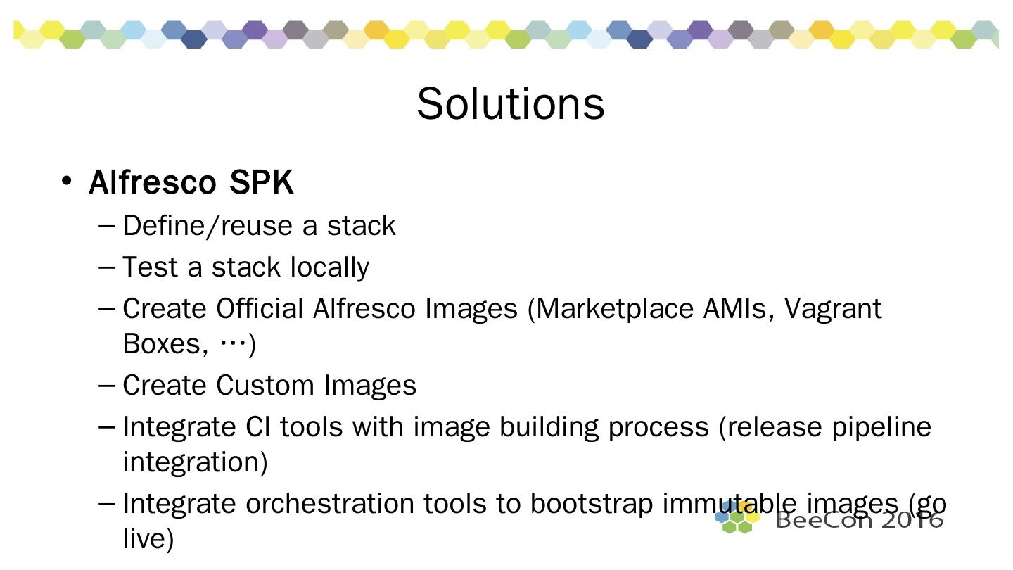 Define/reuse a stack; Test a stack locally; Create Official Alfresco Images (Marketplace AMIs, Vagrant Boxes, …) Create Custom Images; Integrate CI tools with ...