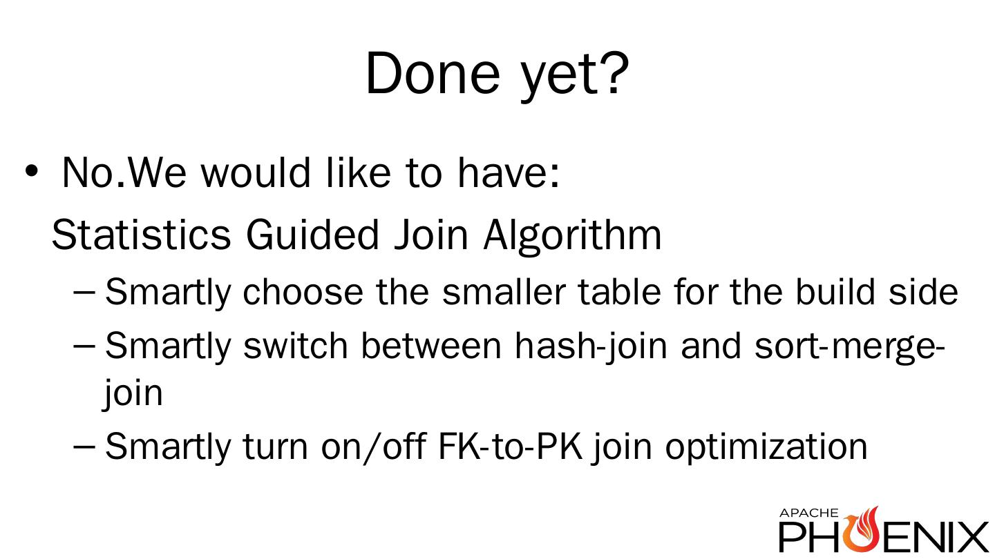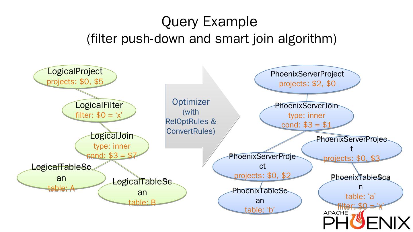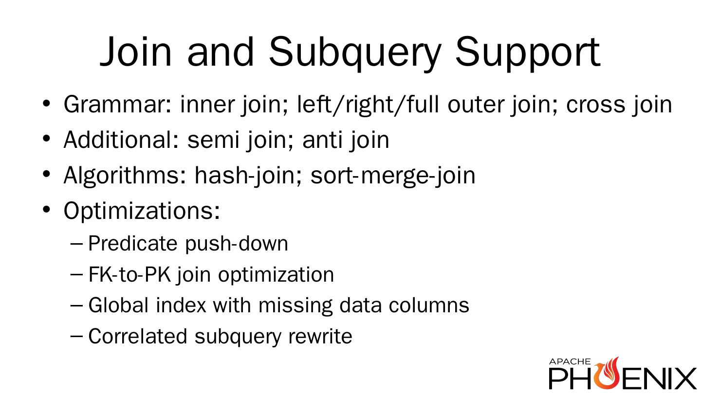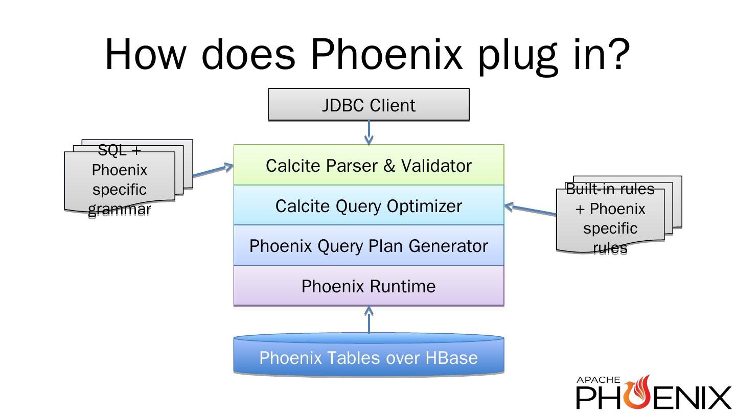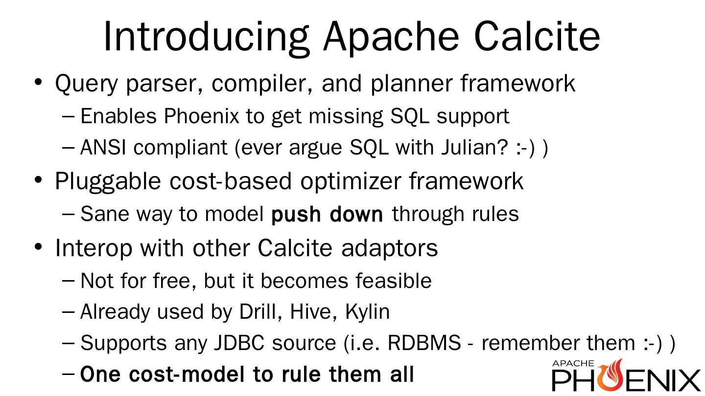 http://phoenix.apache.org/ ... Introducing Apache Calcite ... Not for free, but it becomes feasible; Already used by Drill, Hive, Kylin; Supports any JDBC source (i.e. ...