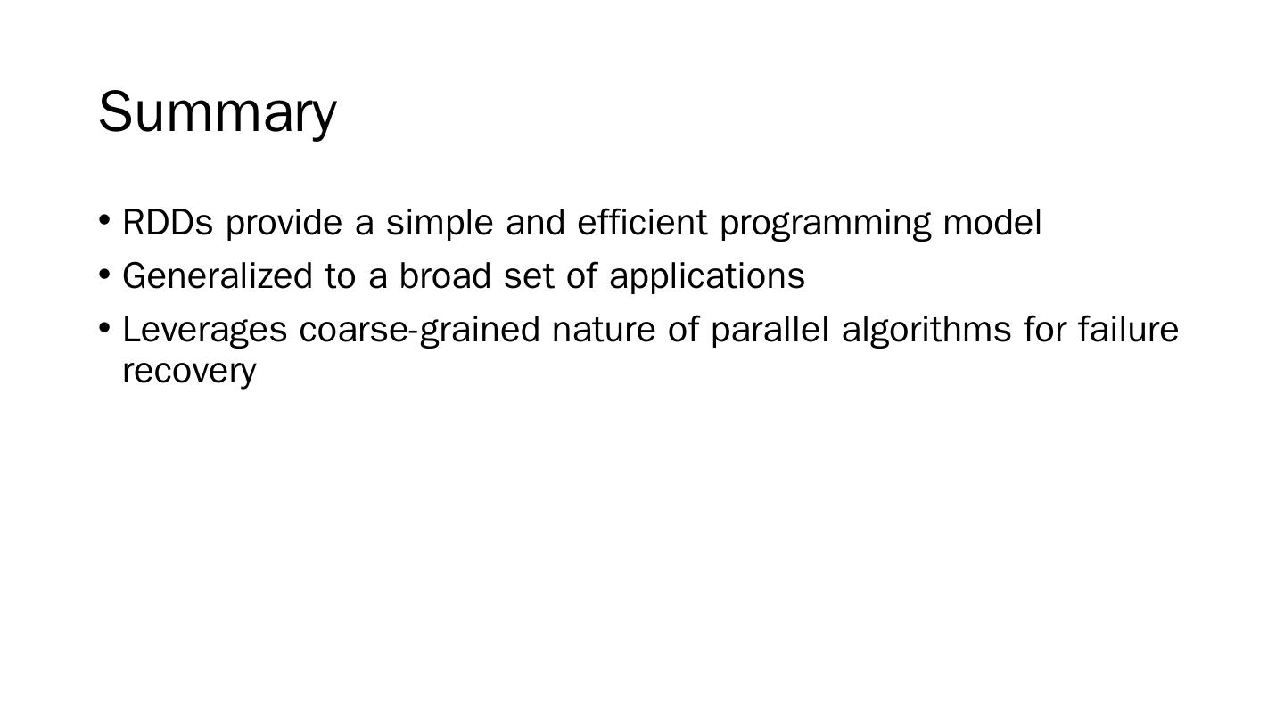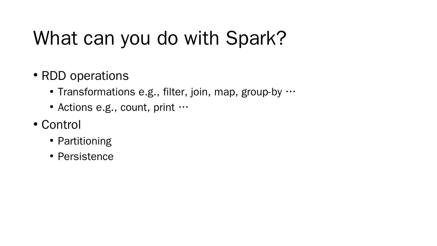 RDDs track the graph of transformations that built them (their lineage) to rebuild lost data. What can you do with Spark? RDD operations. Transformations e.g. ...
