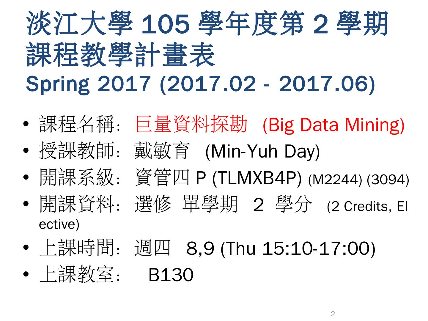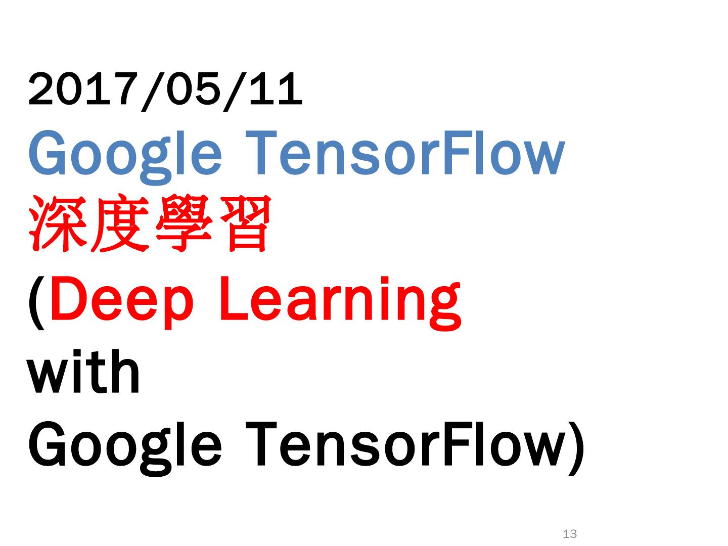 13 2017/05/11 Google TensorFlow 深度學習 (Deep Learning with Google TensorFlow). 14 2017/05/18 期末報告(Final Project Presentation).
