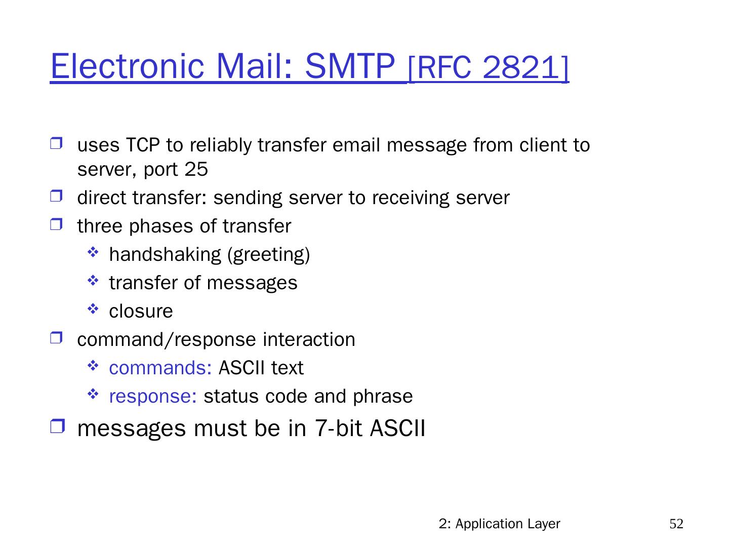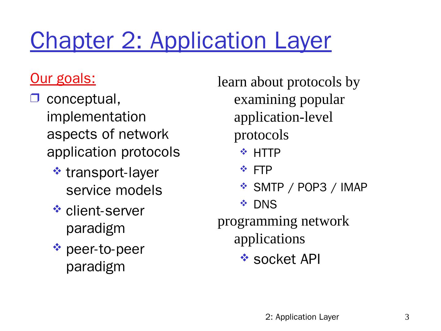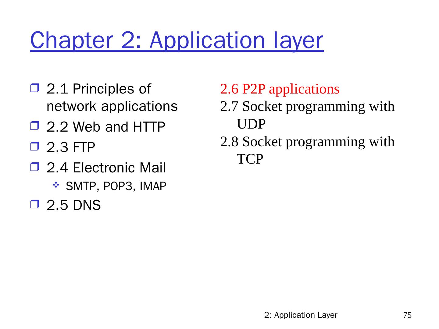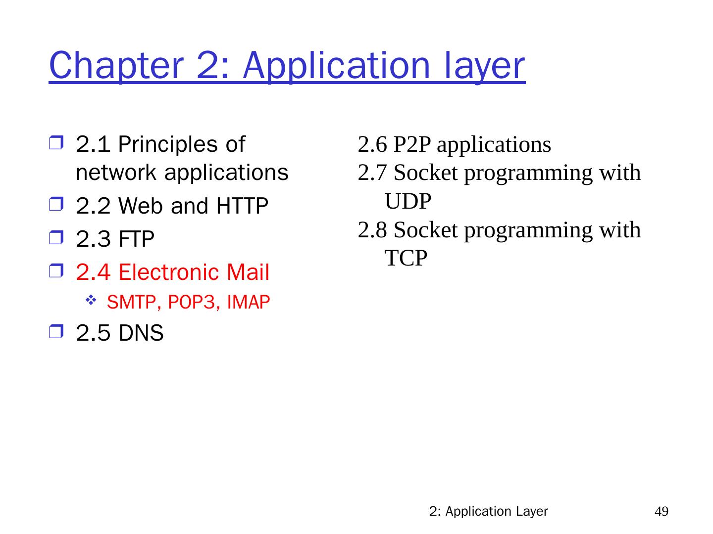 2 .2: Application Layer 2 Chapter 2: Application layer 2.1 Principles of network applications 2.2 Web and HTTP 2.3 FTP 2.4 Electronic Mail SMTP, POP3, IMAP 2.5 DNS 2.6 P2P applications 2.7 Socket programming with UDP 2.8 Socket programming with TCP