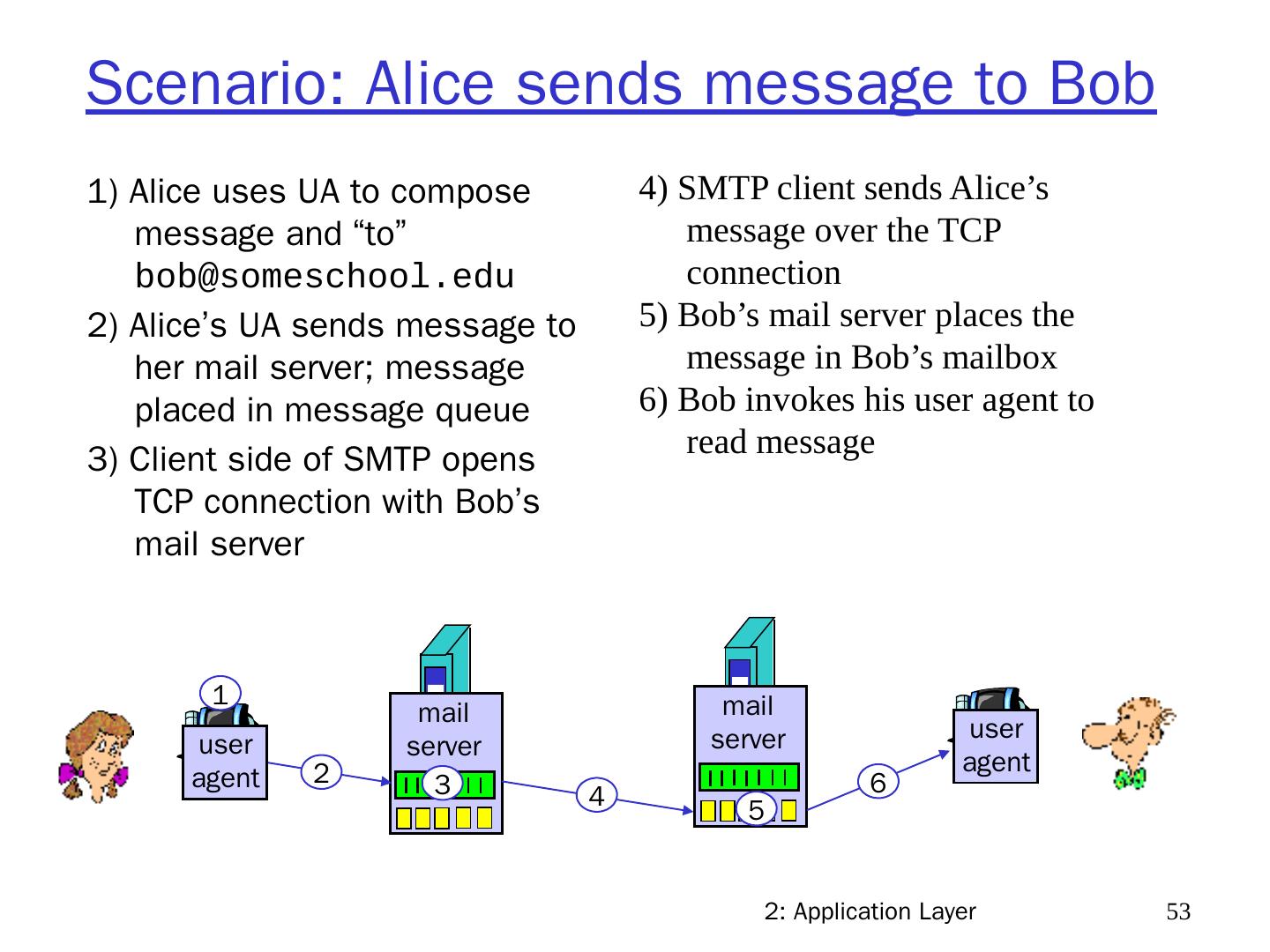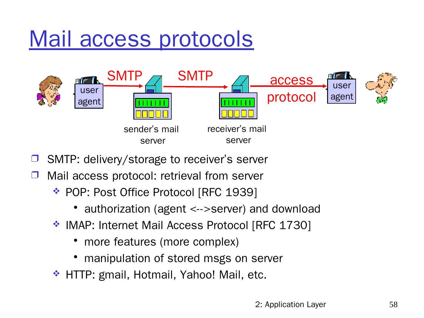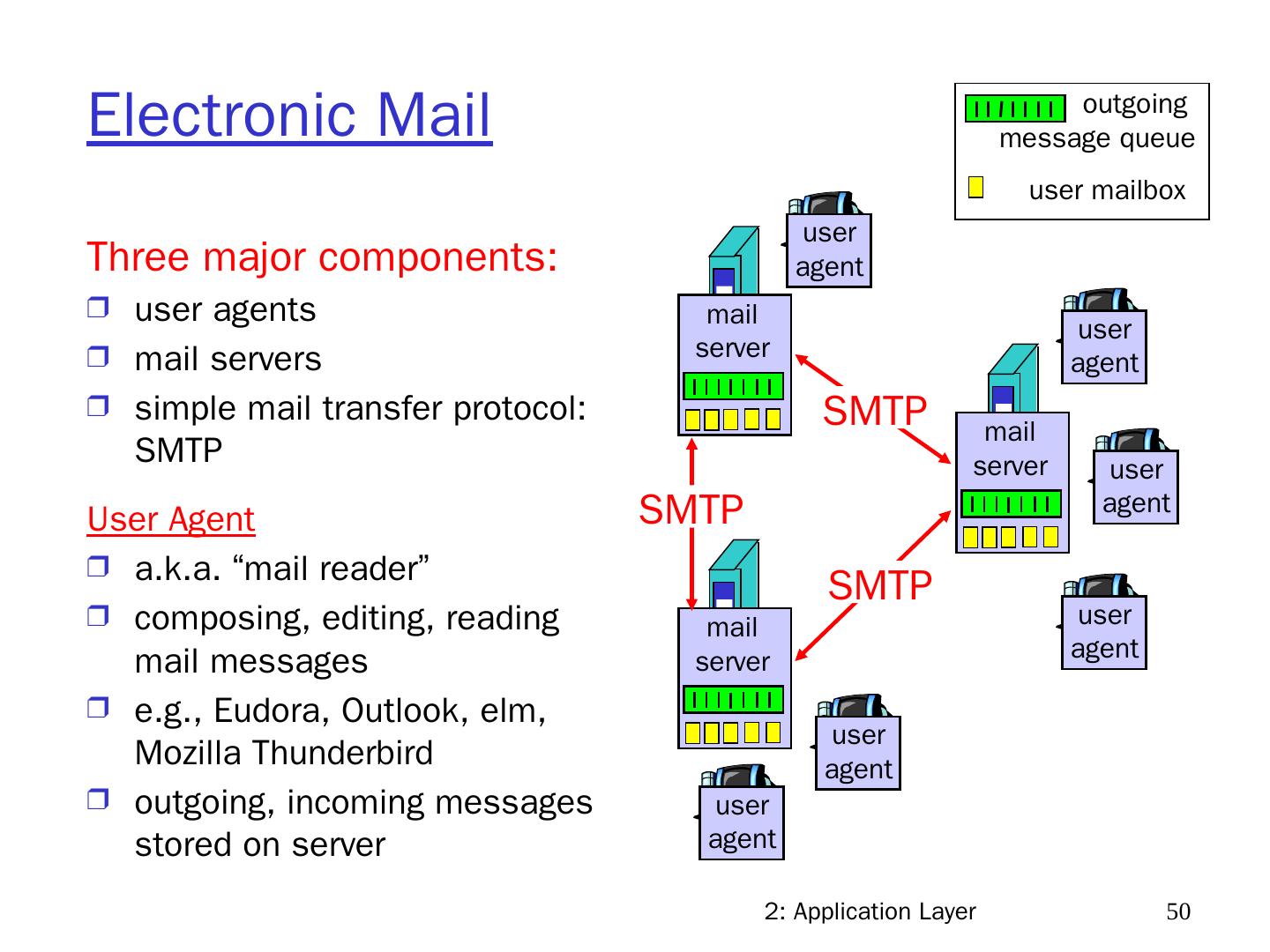 2 .2: Application Layer 2 Chapter 2: Application layer 2.1 Principles of network applications 2.2 Web and HTTP 2.3 FTP 2.4 Electronic Mail SMTP, POP3, IMAP 2.5 DNS 2.6 P2P applications 2.7 Socket programming with UDP 2.8 Socket programming with TCP