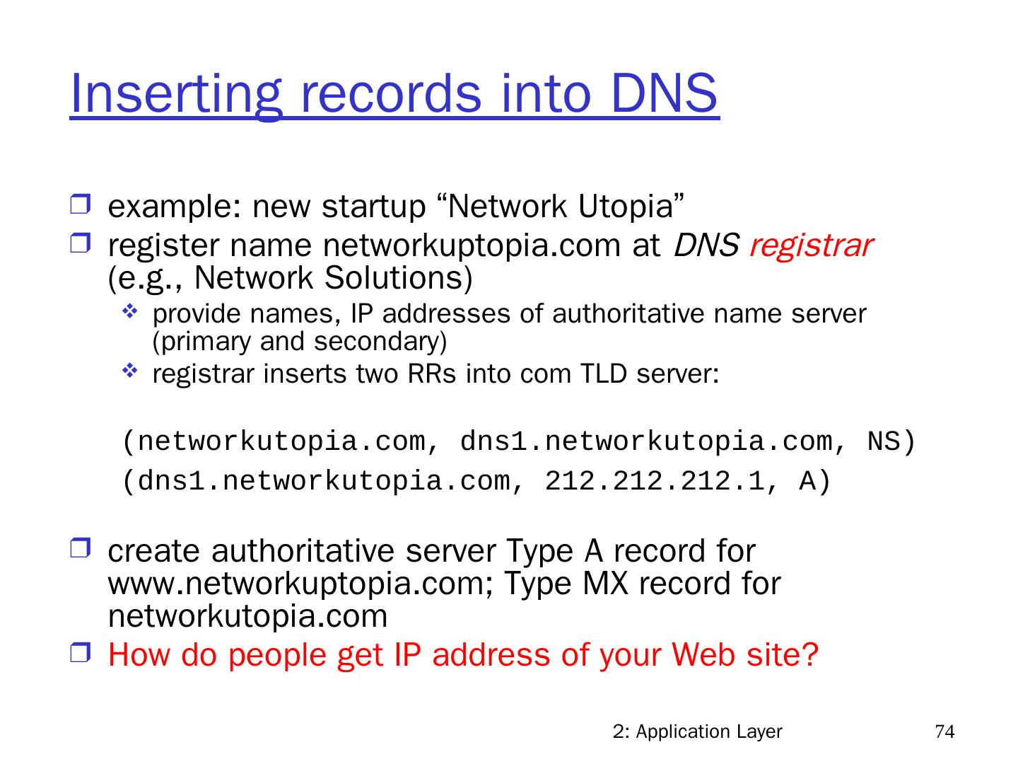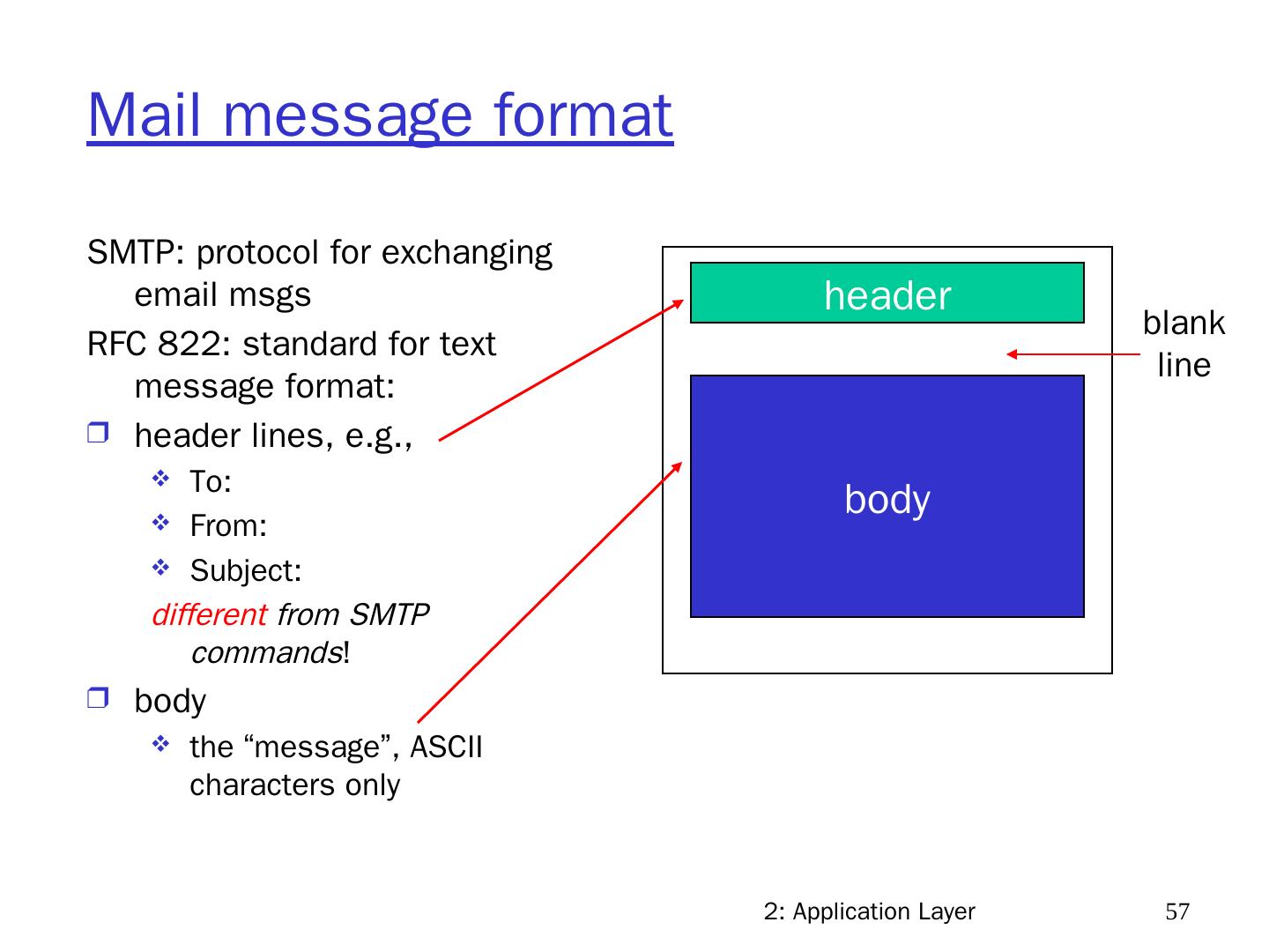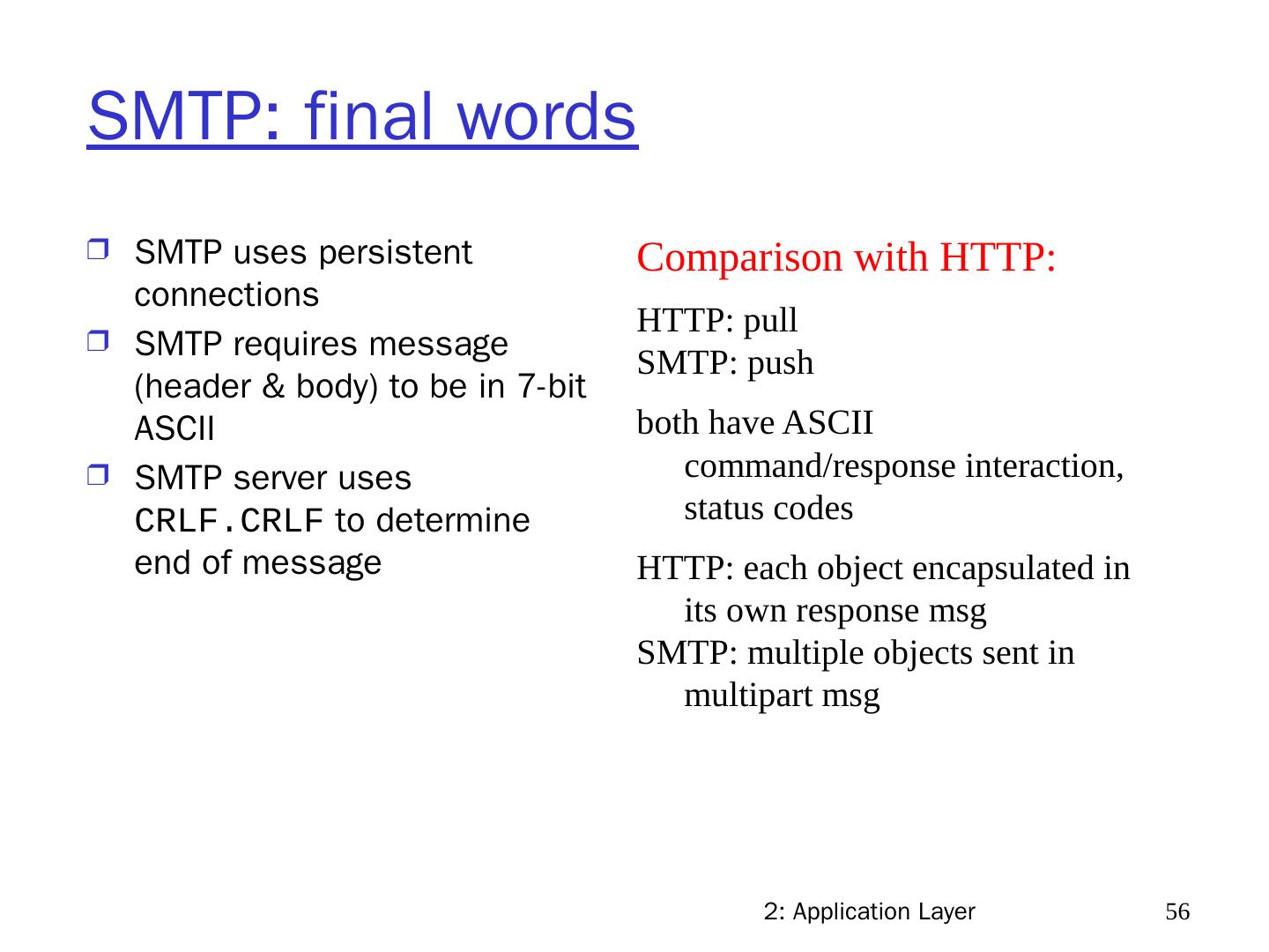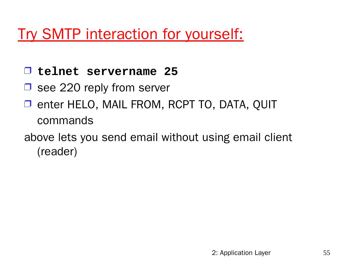 2 .2: Application Layer 2 Chapter 2: Application layer 2.1 Principles of network applications 2.2 Web and HTTP 2.3 FTP 2.4 Electronic Mail SMTP, POP3, IMAP 2.5 DNS 2.6 P2P applications 2.7 Socket programming with UDP 2.8 Socket programming with TCP