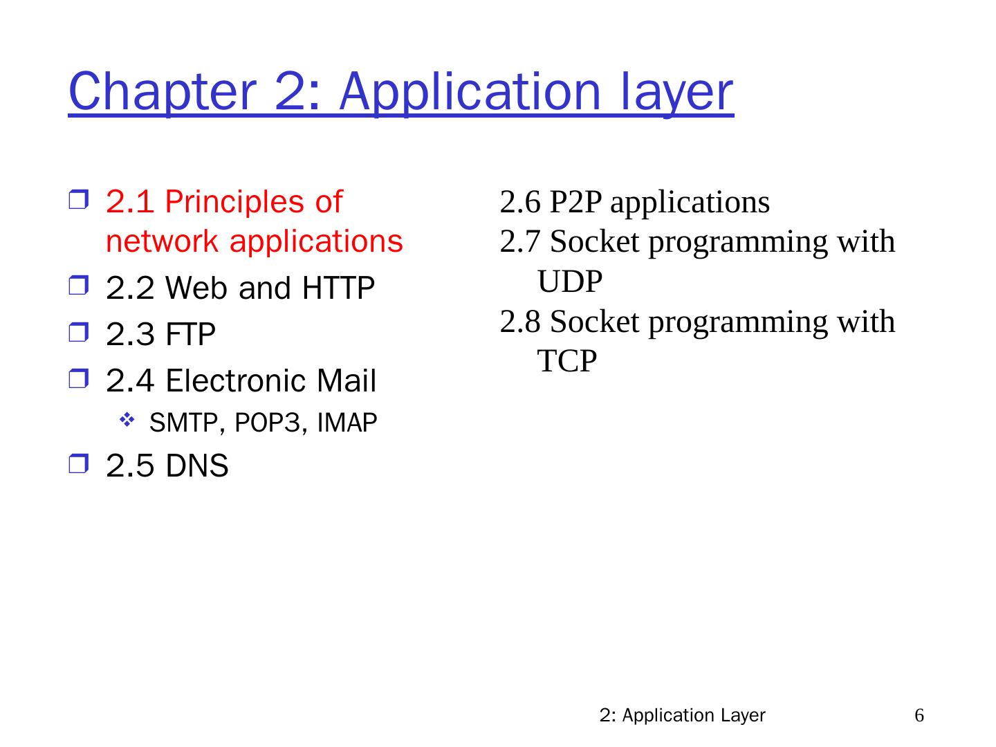 6 .2: Application Layer 6 Chapter 2: Application layer 2.1 Principles of network applications 2.2 Web and HTTP 2.3 FTP 2.4 Electronic Mail SMTP, POP3, IMAP 2.5 DNS 2.6 P2P applications 2.7 Socket programming with UDP 2.8 Socket programming with TCP