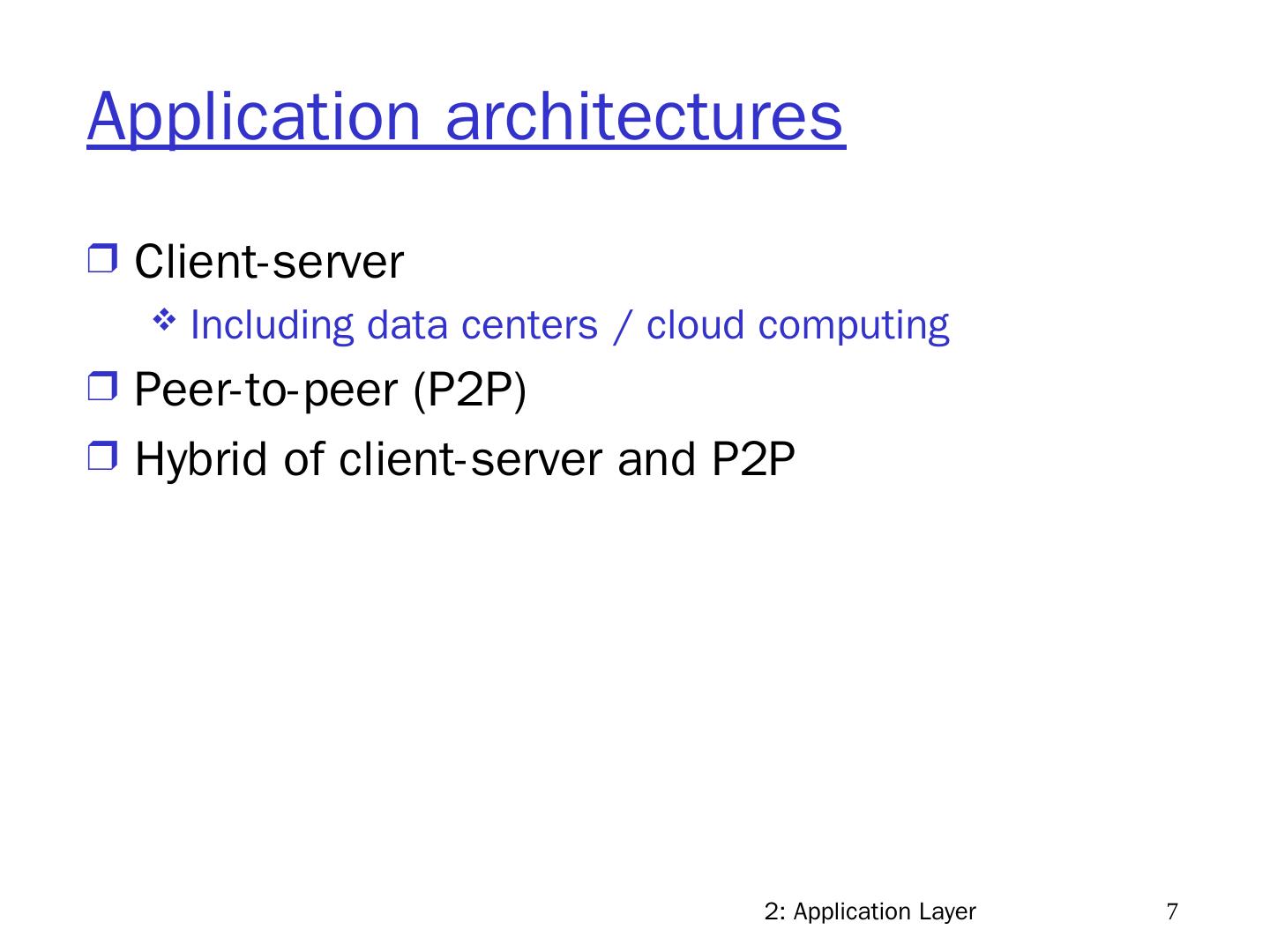 7 .2: Application Layer 7 Application architectures Client-server Including data centers / cloud computing Peer-to-peer (P2P) Hybrid of client-server and P2P