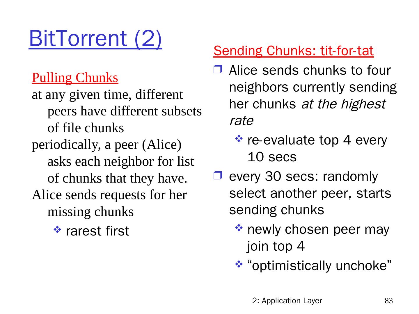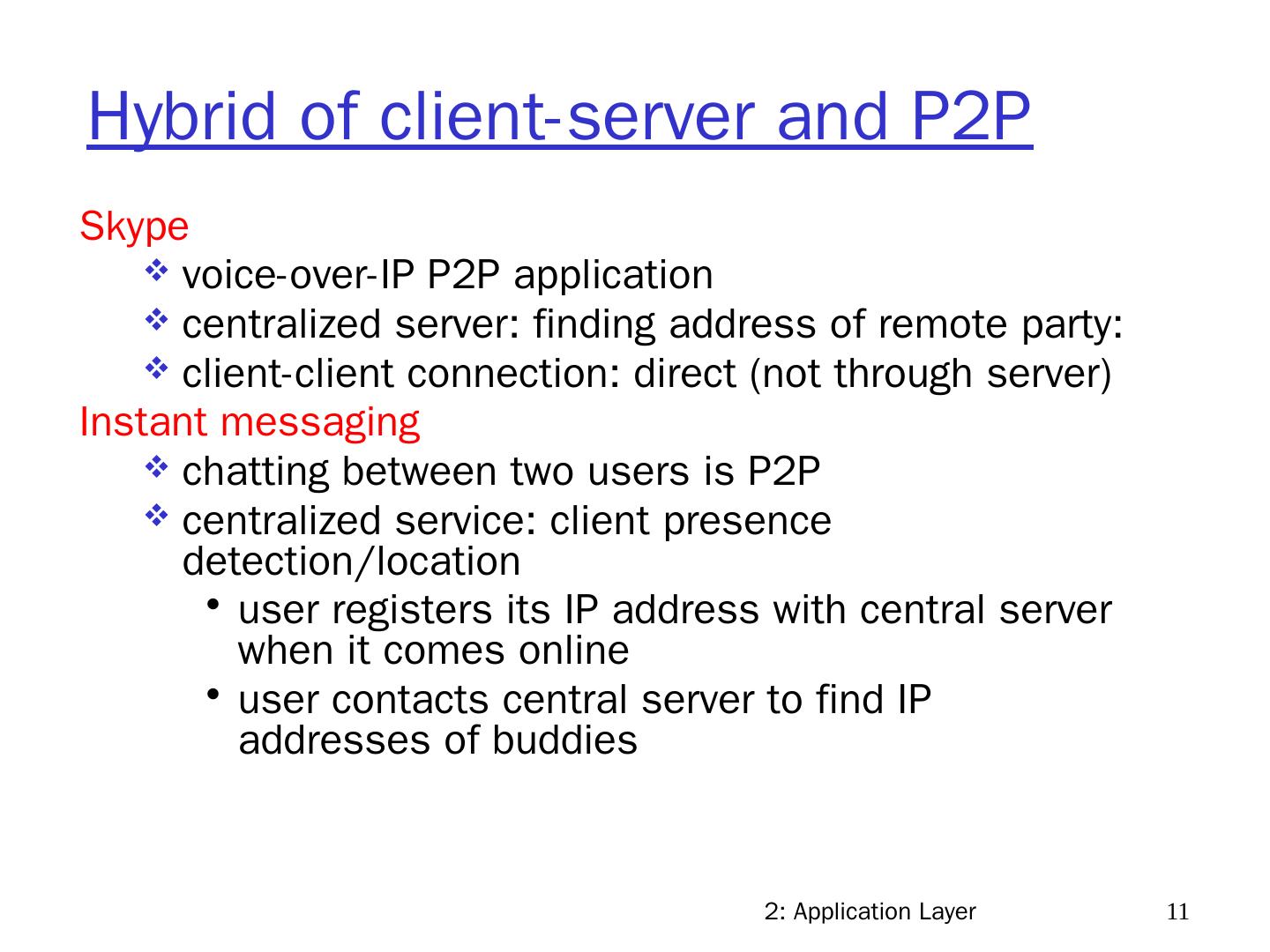 11 .2: Application Layer 11 Hybrid of client-server and P2P Skype voice-over-IP P2P application centralized server: finding address of remote party: client-client connection: direct (not through server) Instant messaging chatting between two users is P2P centralized service: client presence detection/location user registers its IP address with central server when it comes online user contacts central server to find IP addresses of buddies