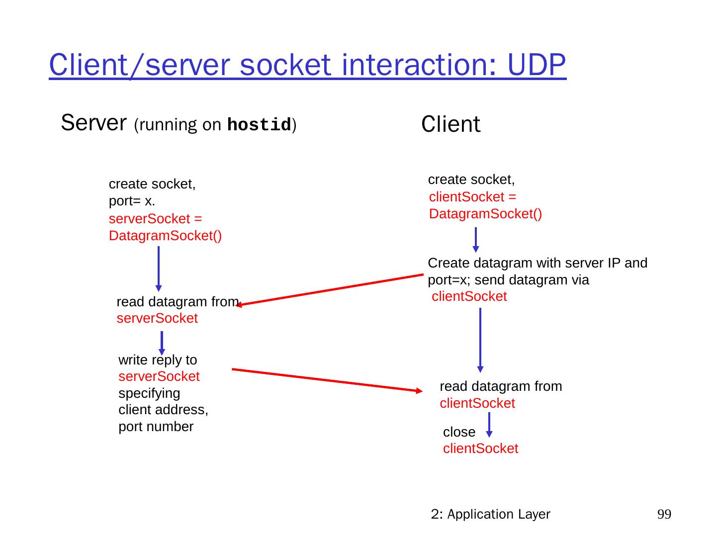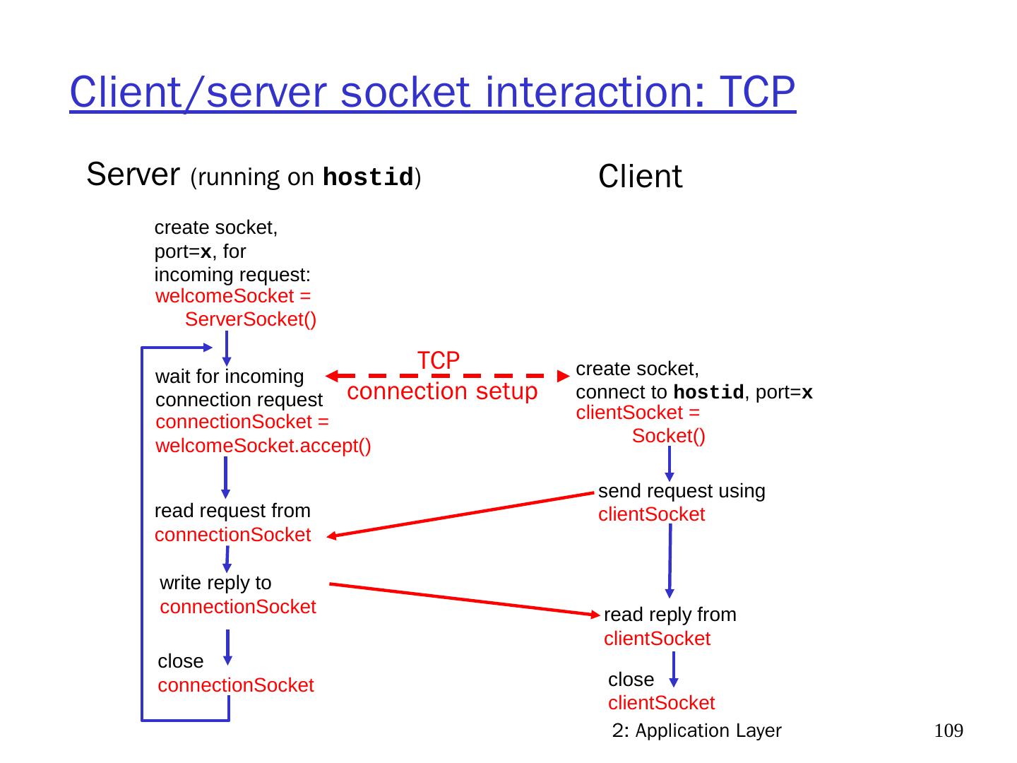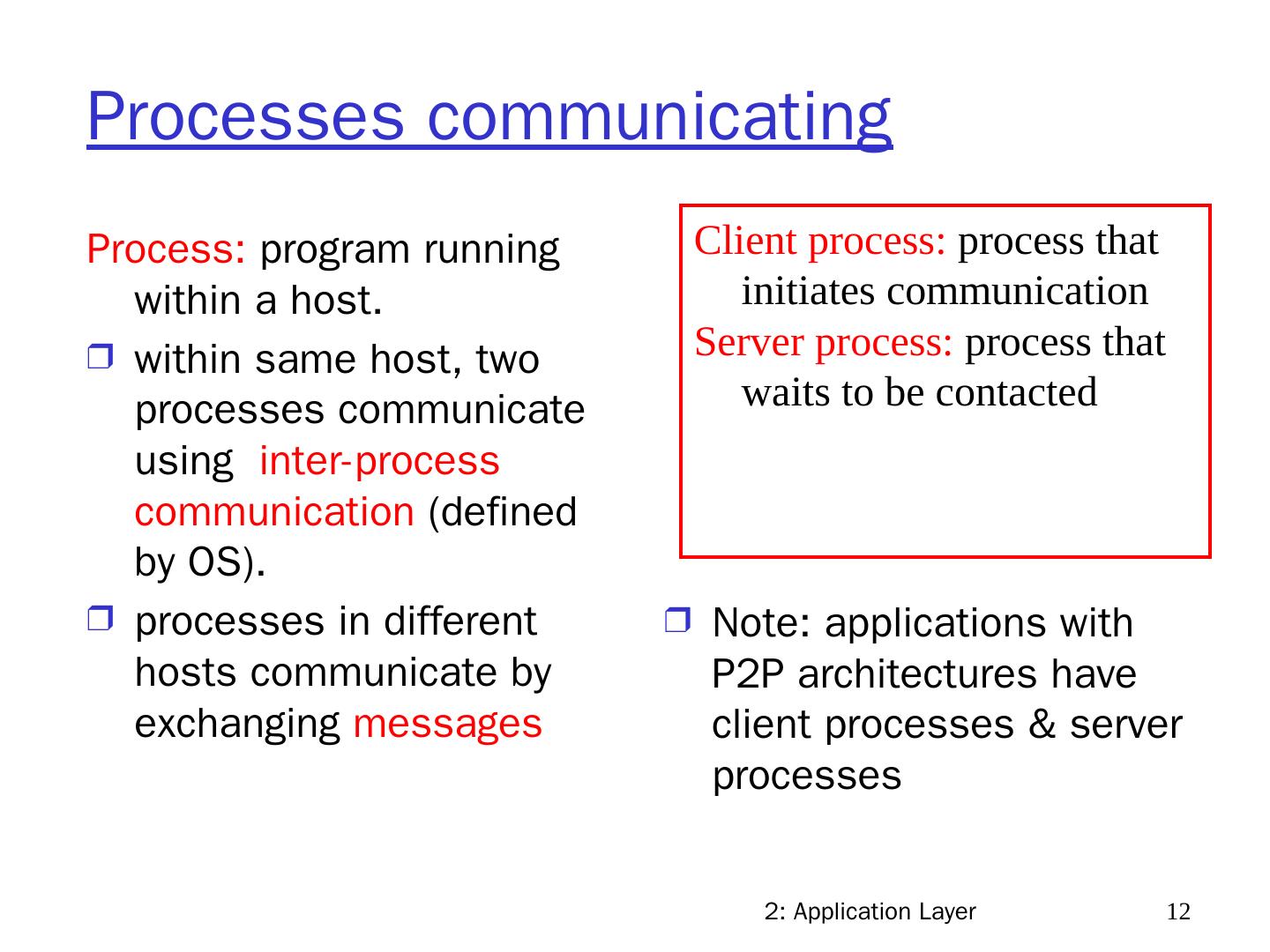 12 .2: Application Layer 12 Processes communicating Process: program running within a host. within same host, two processes communicate using inter-process communication (defined by OS). processes in different hosts communicate by exchanging messages Client process: process that initiates communication Server process: process that waits to be contacted Note: applications with P2P architectures have client processes & server processes