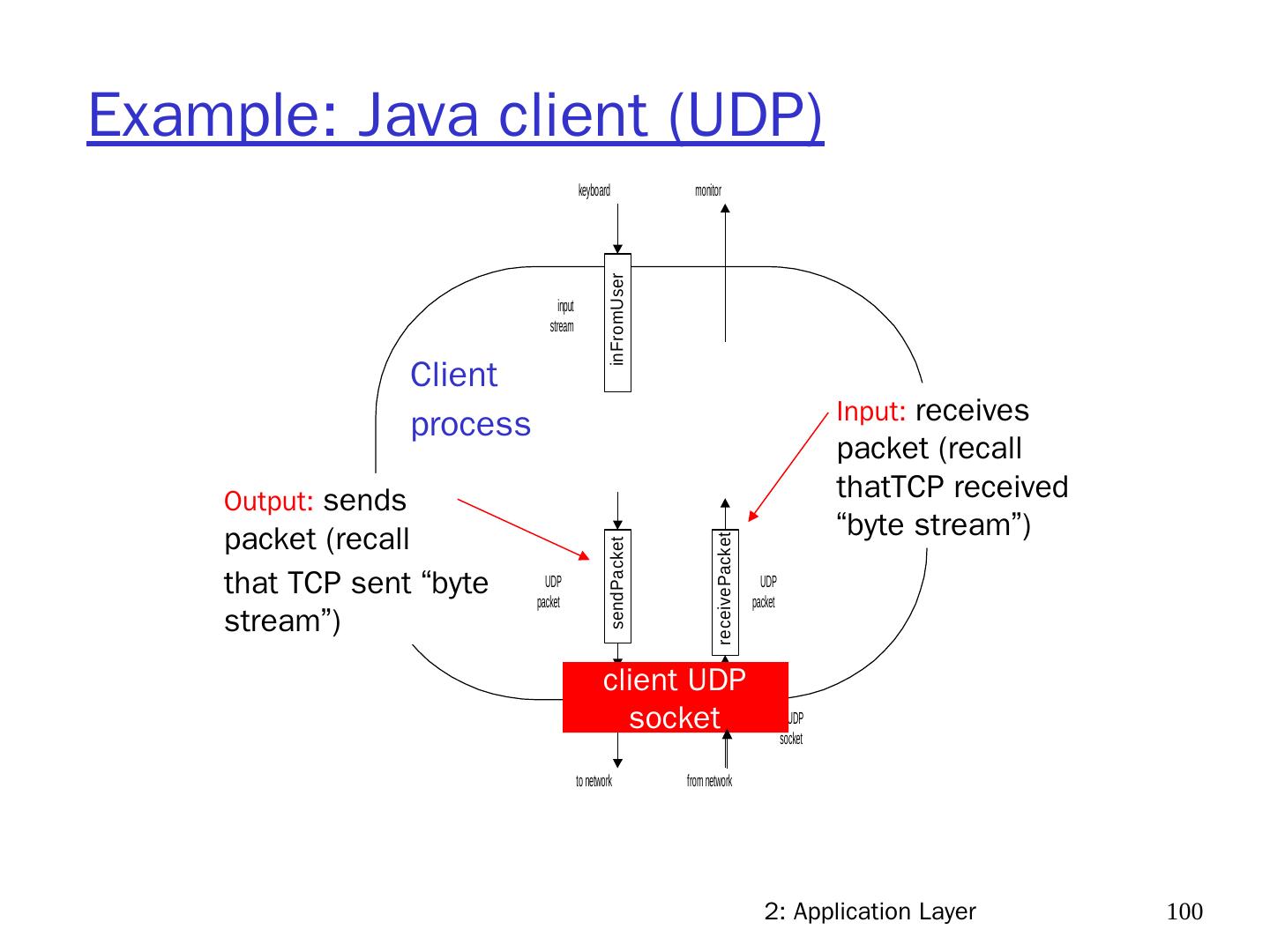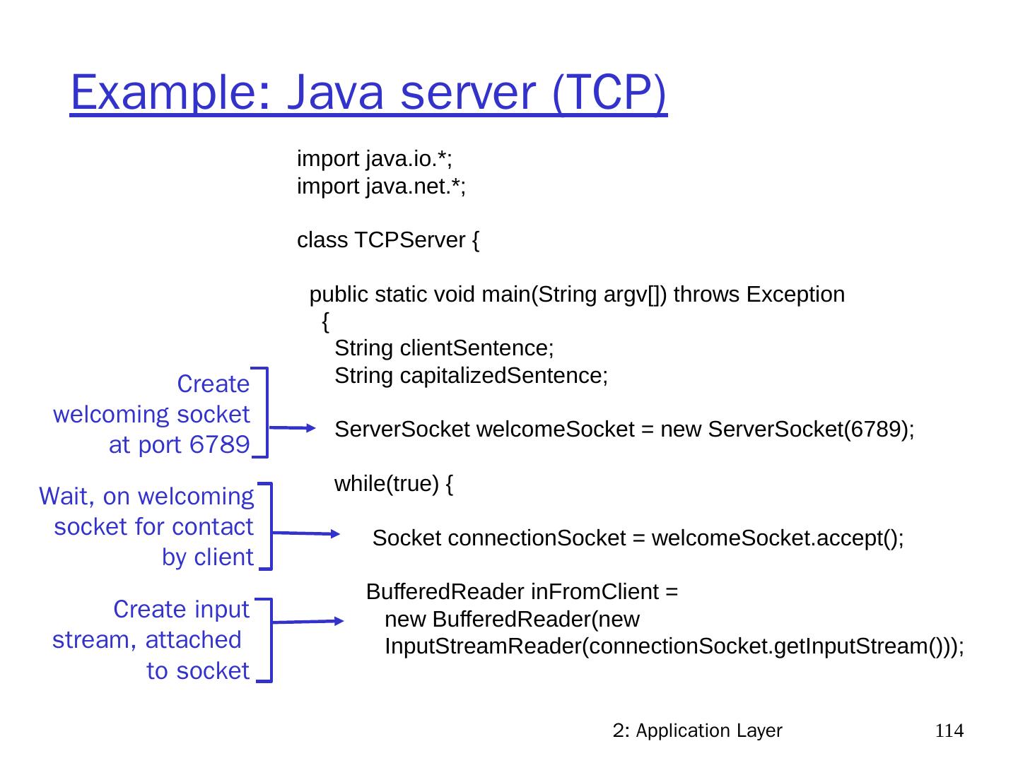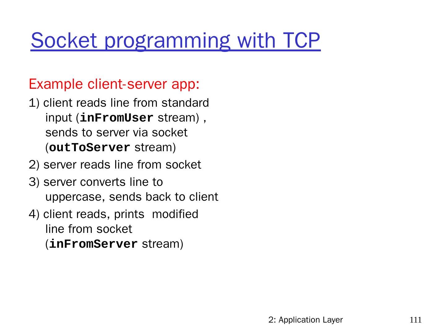 12 .2: Application Layer 12 Processes communicating Process: program running within a host. within same host, two processes communicate using inter-process communication (defined by OS). processes in different hosts communicate by exchanging messages Client process: process that initiates communication Server process: process that waits to be contacted Note: applications with P2P architectures have client processes & server processes