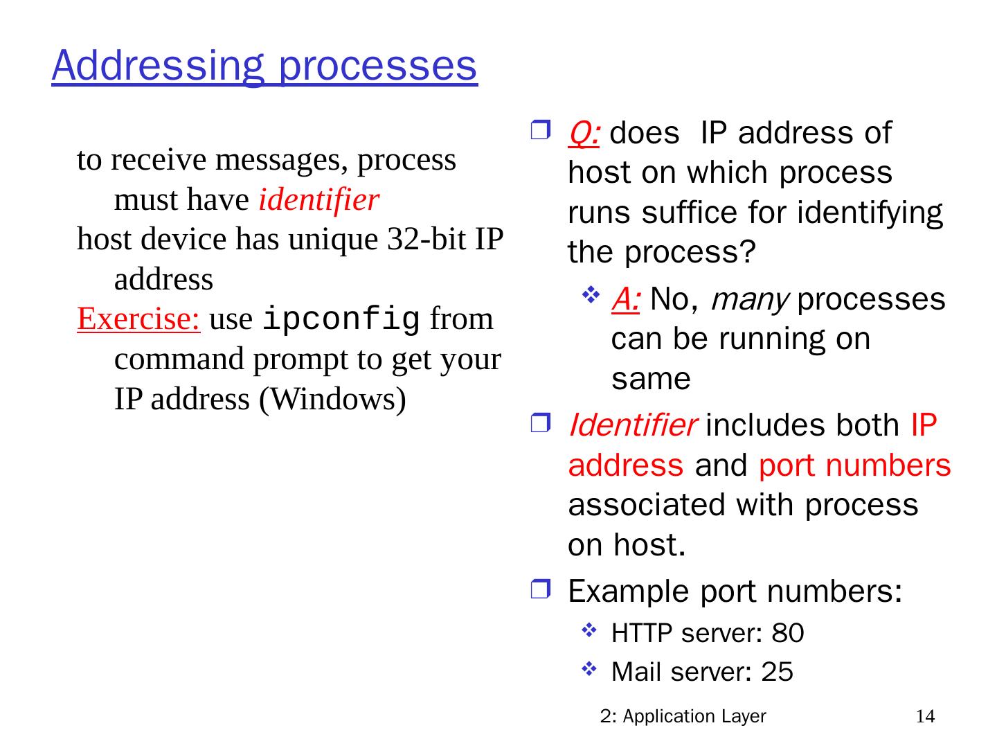 14 .2: Application Layer 14 Addressing processes to receive messages, process must have identifier host device has unique 32-bit IP address Exercise: use ipconfig from command prompt to get your IP address (Windows) Q: does IP address of host on which process runs suffice for identifying the process? A: No, many processes can be running on same Identifier includes both IP address and port numbers associated with process on host. Example port numbers: HTTP server: 80 Mail server: 25