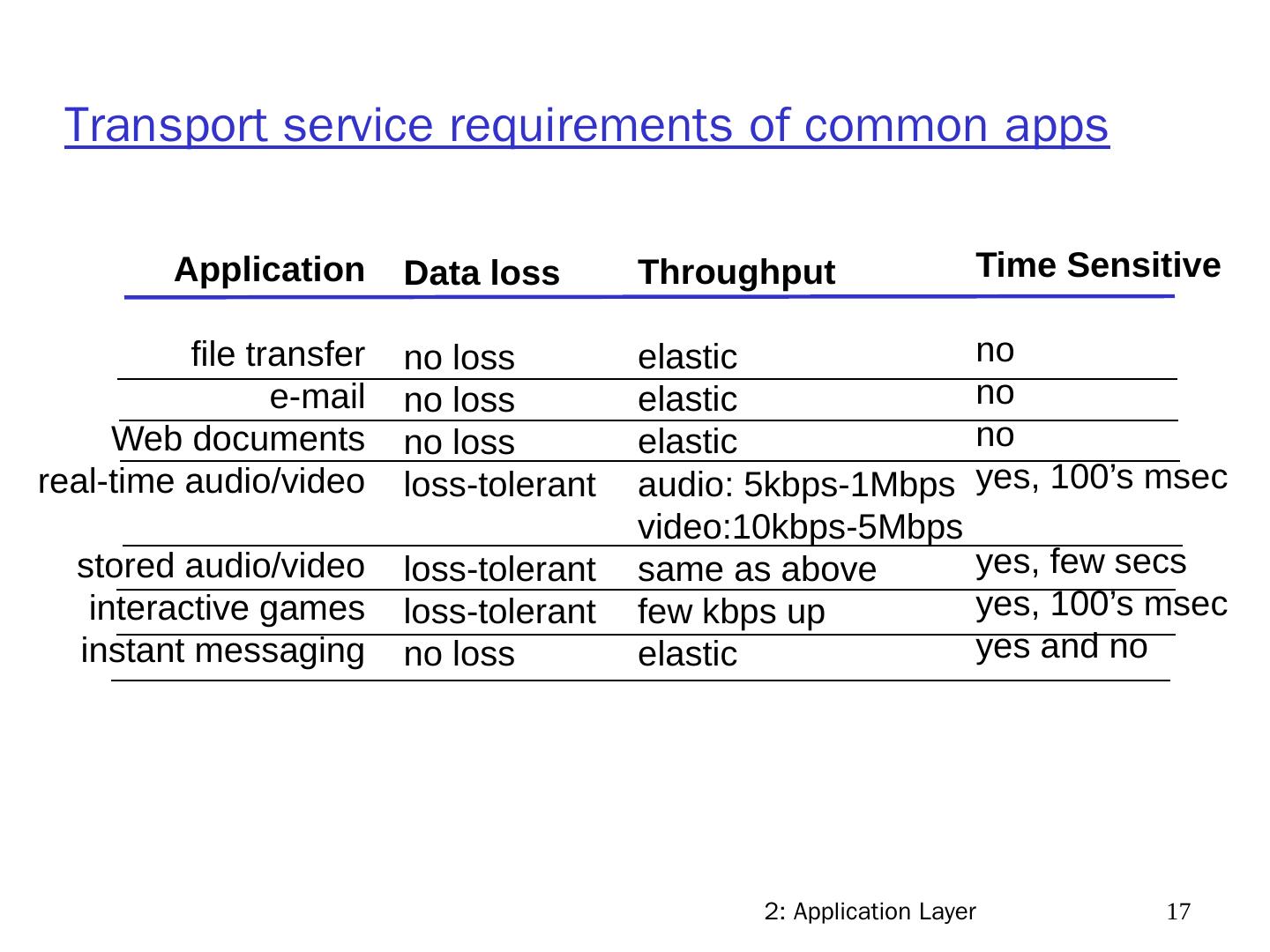 16 .2: Application Layer 16 What transport service does an app need? Data loss some apps (e.g., audio) can tolerate some loss other apps (e.g., file transfer, telnet) require 100% reliable data transfer Timing some apps (e.g., Internet telephony, interactive games) require low delay to be “effective” Throughput some apps (e.g., multimedia) require minimum amount of throughput to be “effective” other apps (“elastic apps”) make use of whatever throughput they get Security Encryption, data integrity, …