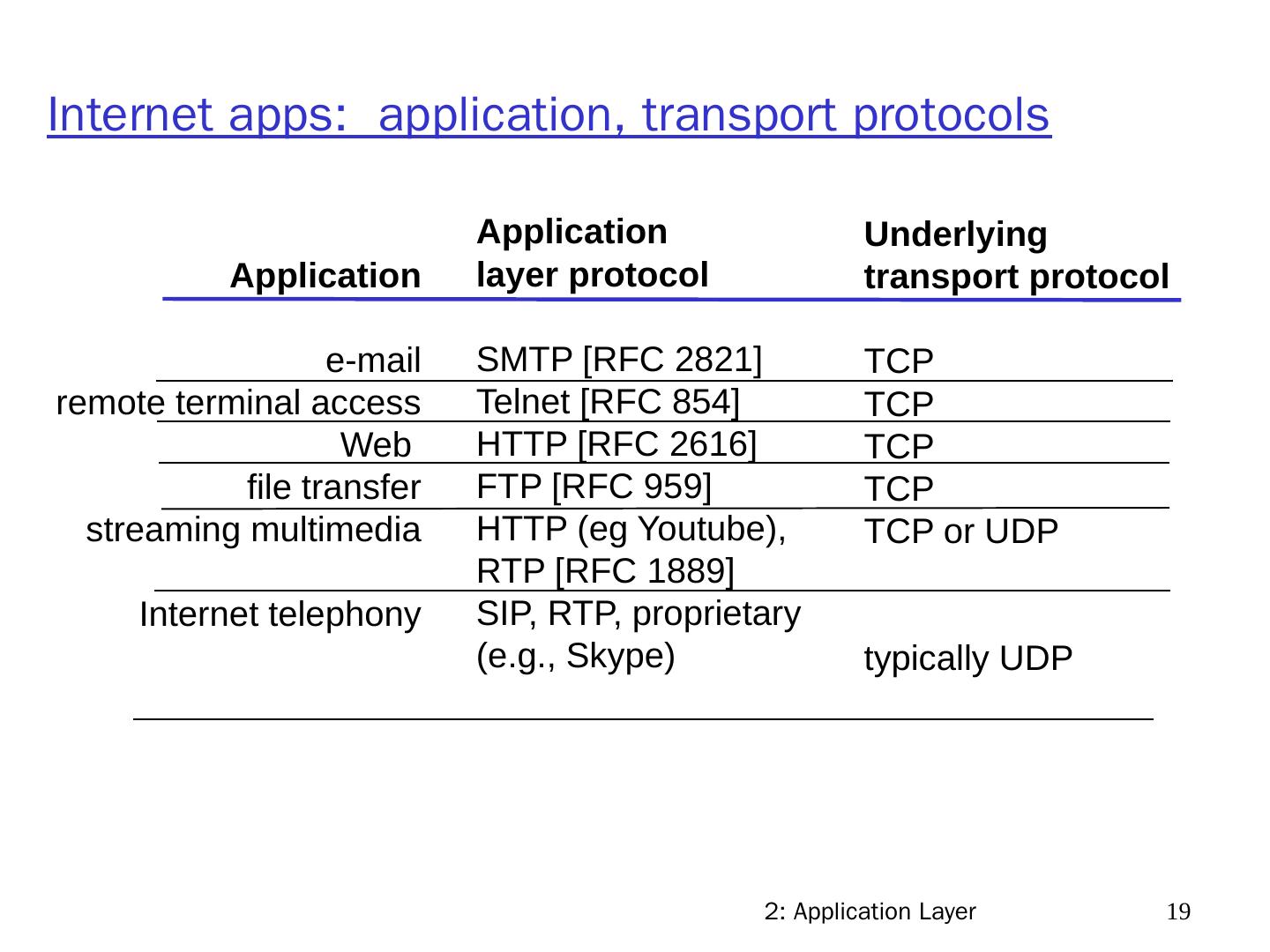 19 .2: Application Layer 19 Internet apps: application, transport protocols Application e-mail remote terminal access Web file transfer streaming multimedia Internet telephony Application layer protocol SMTP [RFC 2821] Telnet [RFC 854] HTTP [RFC 2616] FTP [RFC 959] HTTP (eg Youtube), RTP [RFC 1889] SIP, RTP, proprietary (e.g., Skype) Underlying transport protocol TCP TCP TCP TCP TCP or UDP typically UDP