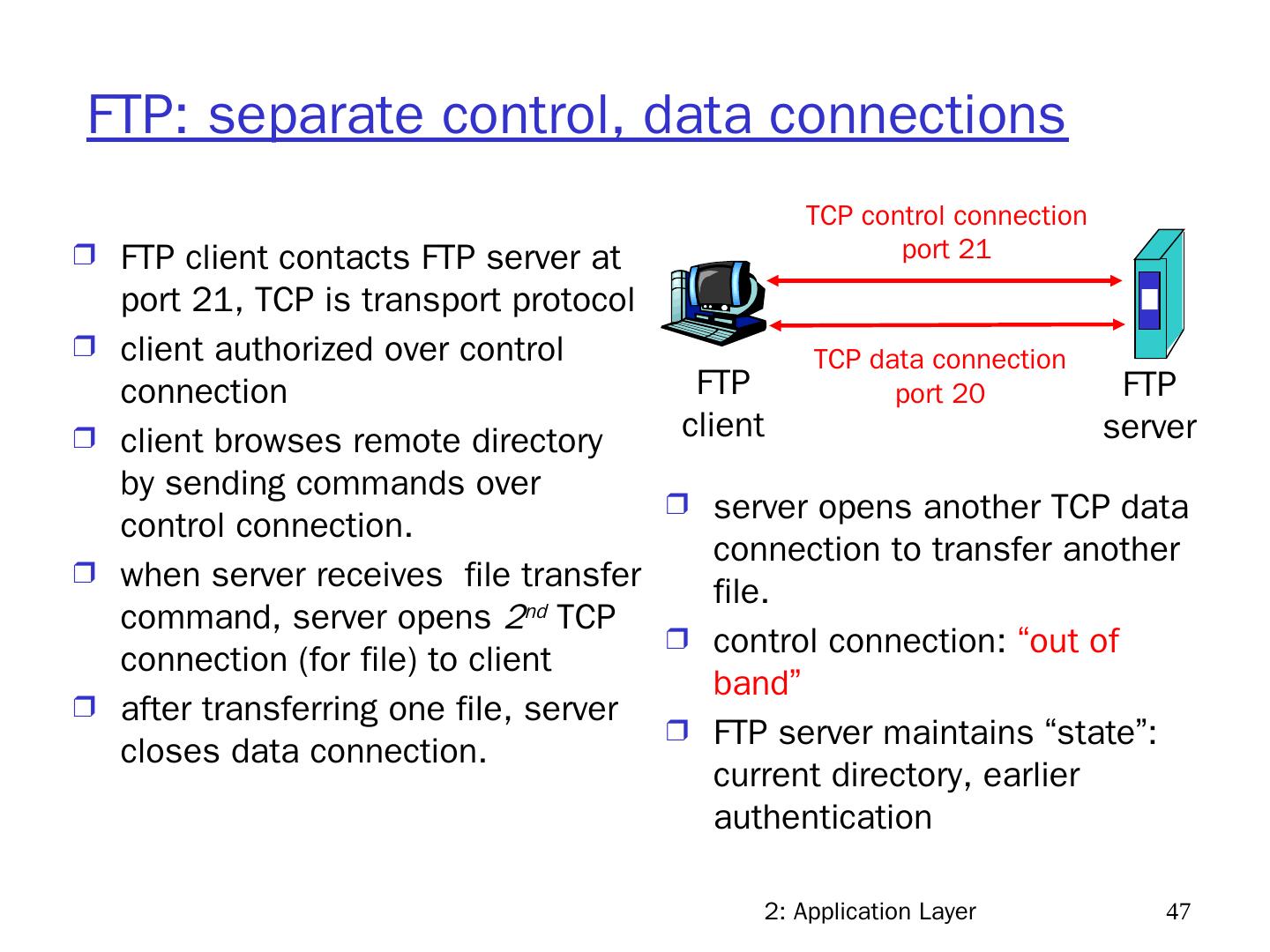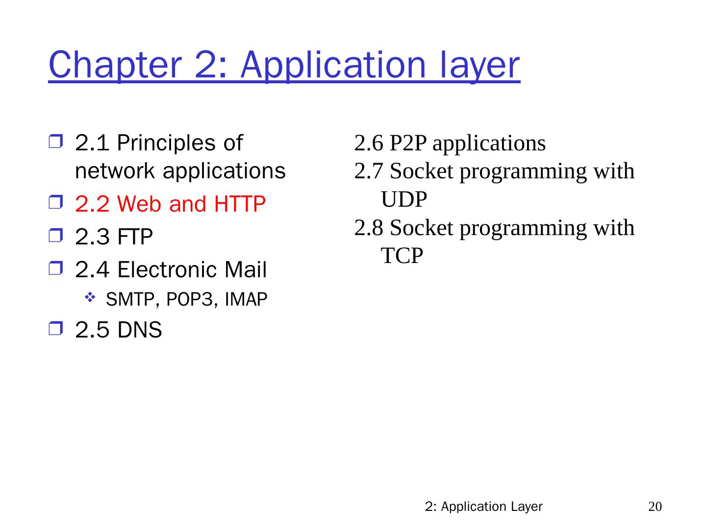 20 .2: Application Layer 20 Chapter 2: Application layer 2.1 Principles of network applications 2.2 Web and HTTP 2.3 FTP 2.4 Electronic Mail SMTP, POP3, IMAP 2.5 DNS 2.6 P2P applications 2.7 Socket programming with UDP 2.8 Socket programming with TCP