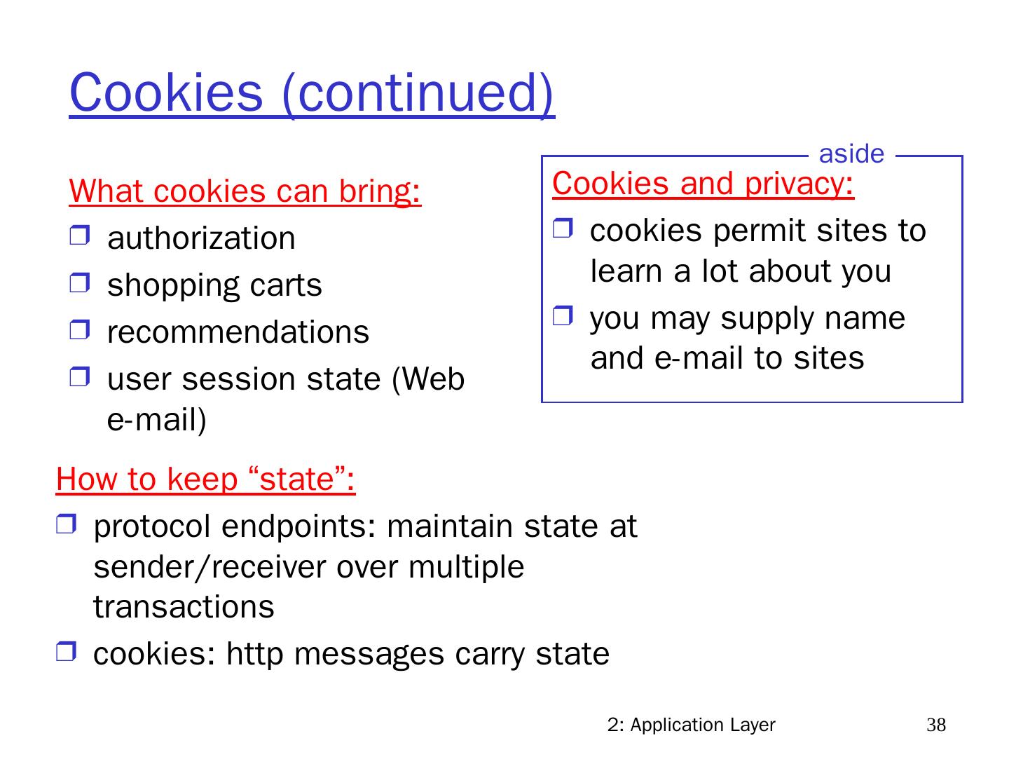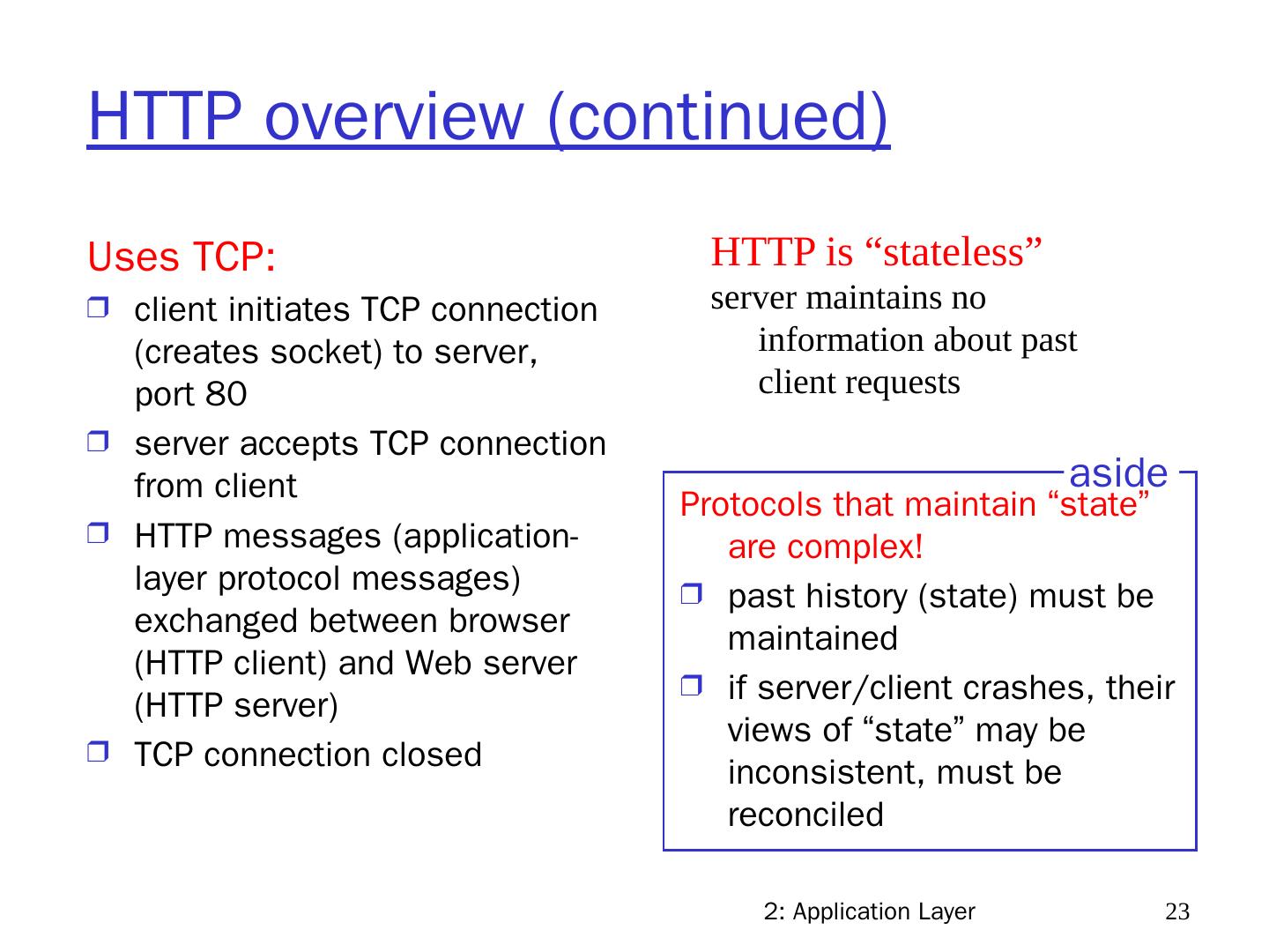 23 .2: Application Layer 23 HTTP overview (continued) Uses TCP: client initiates TCP connection (creates socket) to server, port 80 server accepts TCP connection from client HTTP messages (application-layer protocol messages) exchanged between browser (HTTP client) and Web server (HTTP server) TCP connection closed HTTP is “stateless” server maintains no information about past client requests Protocols that maintain “state” are complex! past history (state) must be maintained if server/client crashes, their views of “state” may be inconsistent, must be reconciled aside
