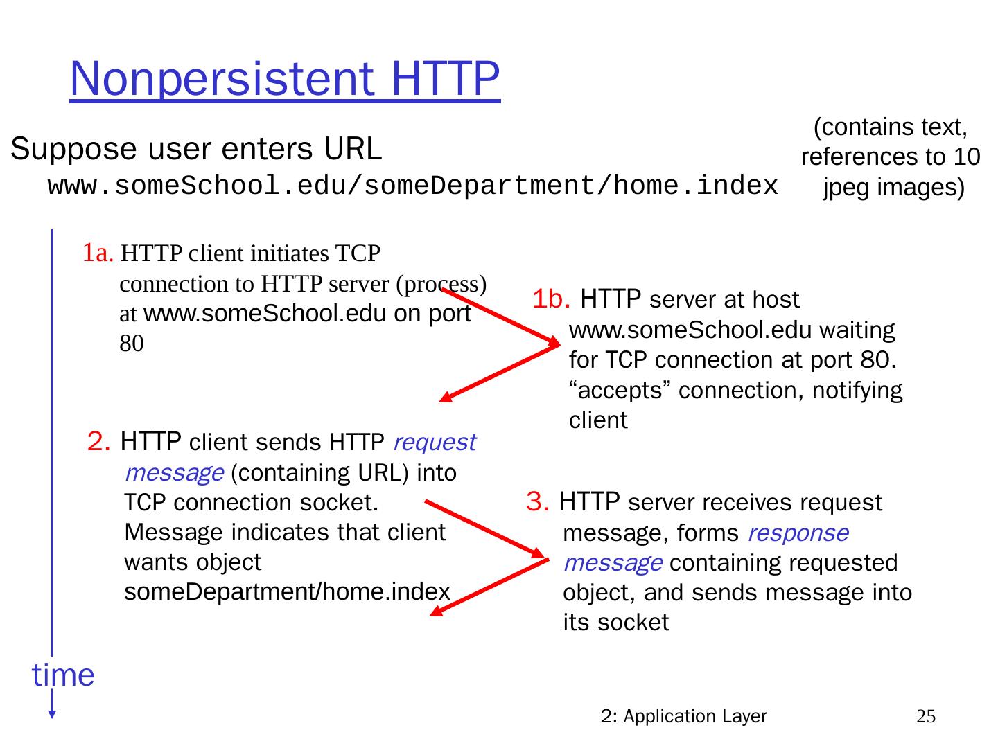25 .2: Application Layer 25 Nonpersistent HTTP Suppose user enters URL www.someSchool.edu/someDepartment/home.index 1a . HTTP client initiates TCP connection to HTTP server (process) at www.someSchool.edu on port 80 2. HTTP client sends HTTP request message (containing URL) into TCP connection socket. Message indicates that client wants object someDepartment/home.index 1b. HTTP server at host www.someSchool.edu waiting for TCP connection at port 80. “accepts” connection, notifying client 3. HTTP server receives request message, forms response message containing requested object, and sends message into its socket time (contains text, references to 10 jpeg images)
