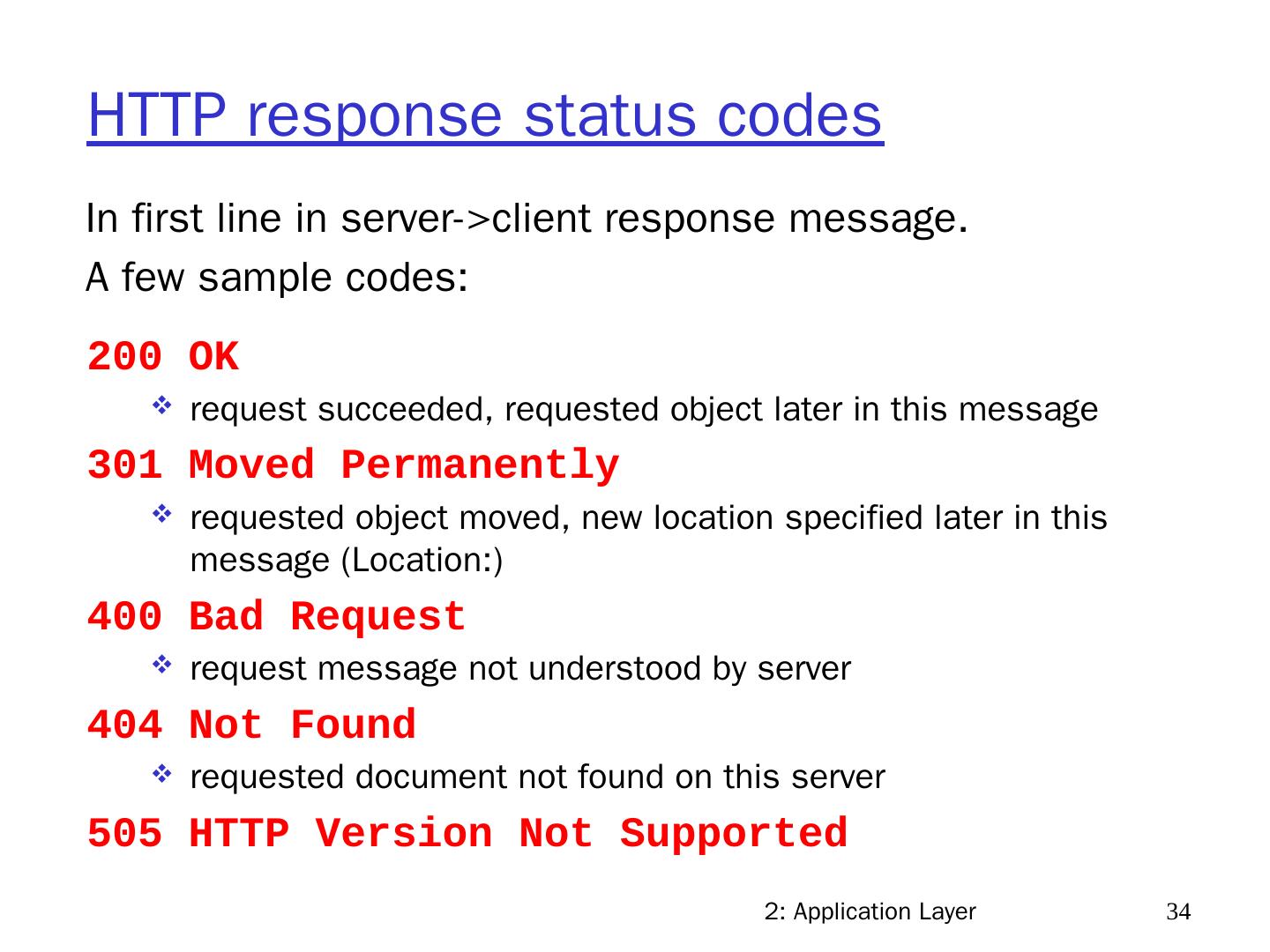 29 .2: Application Layer 29 HTTP request message two types of HTTP messages: request , response HTTP request message: ASCII (human-readable format) GET /somedir/page.html HTTP/1.1 Host: www.someschool.edu User-agent: Mozilla/4.0 Connection: close Accept-language:fr (extra carriage return, line feed) request line (GET, POST, HEAD commands) header lines Carriage return, line feed indicates end of message