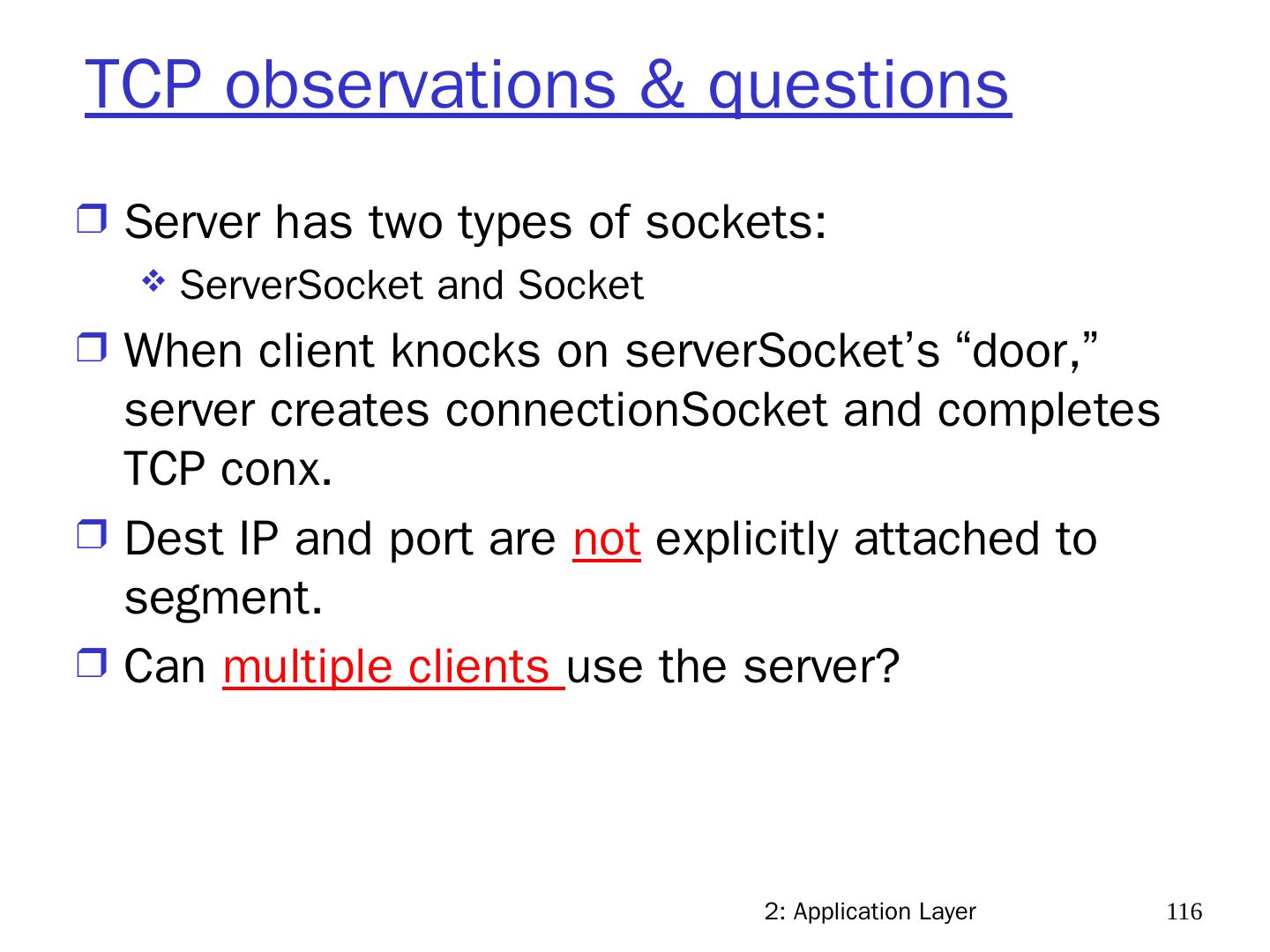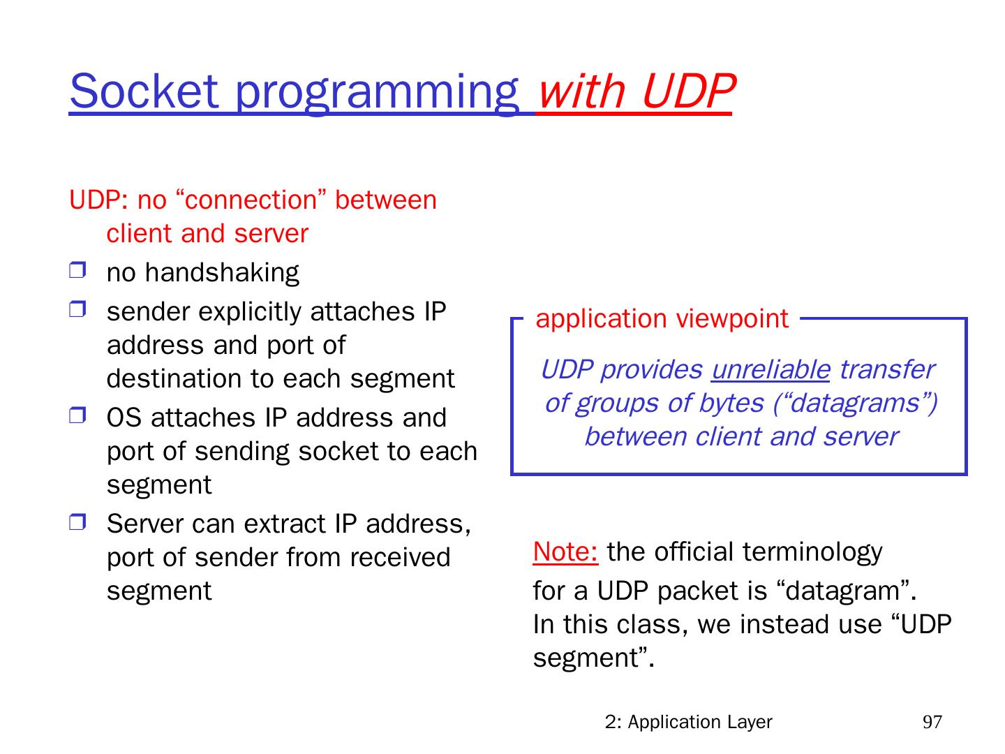 13 .2: Application Layer 13 Sockets process sends/receives messages to/from its socket socket analogous to door sending process shoves message out door sending process relies on transport infrastructure on other side of door which brings message to socket at receiving process process TCP with buffers, variables socket host or server process TCP with buffers, variables socket host or server Internet controlled by OS controlled by app developer API: (1) choice of transport protocol; (2) ability to fix a few parameters (lots more on this later)