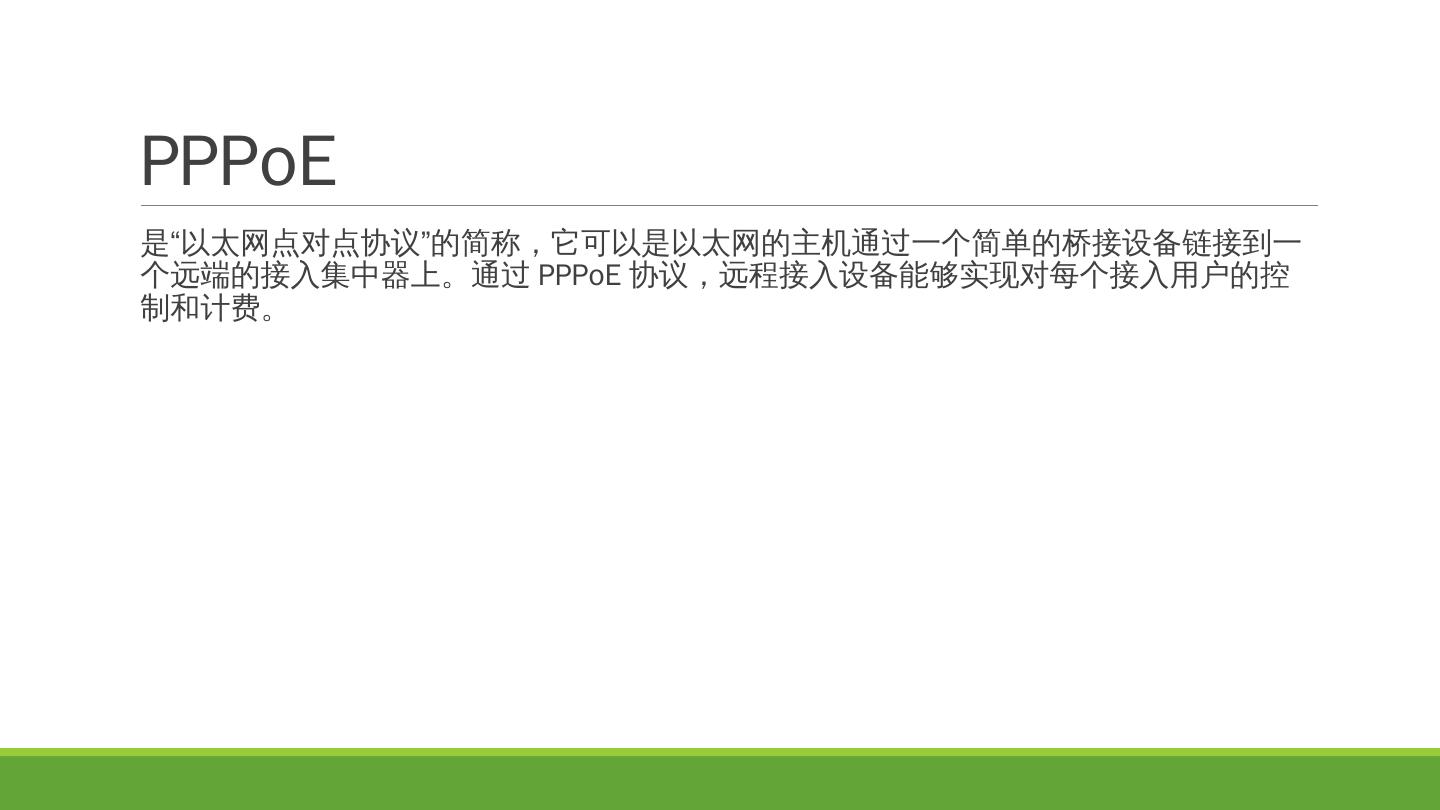 是“以太网点对点协议”的简称,它可以是以太网的主机通过一个简单的桥接设备链接到一个远端的接入集中器上。通过PPPoE协议,远程接入设备能够实现对每个接入 ...