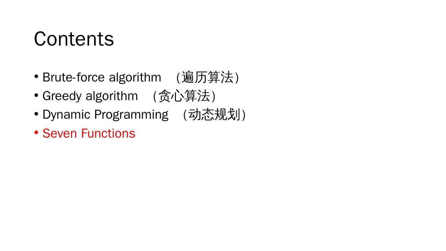 Brute-force algorithm (遍历算法); Greedy algorithm (贪心算法); Dynamic Programming (动态规划); Seven Functions. Brute-force algorithm.