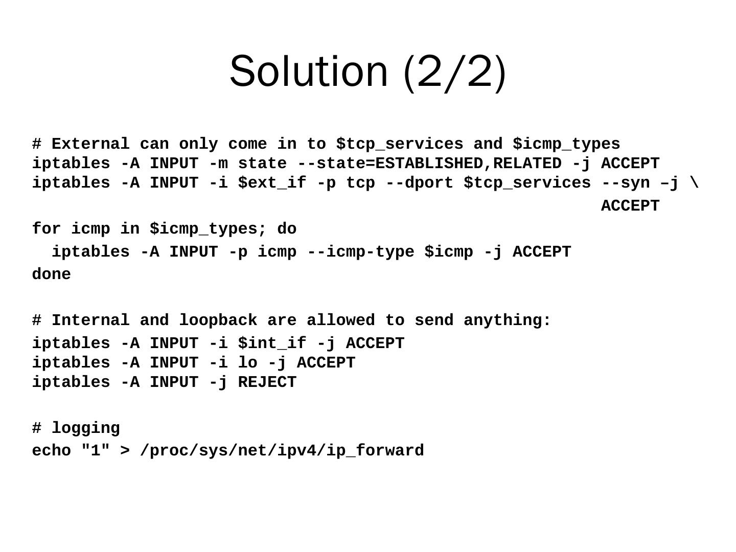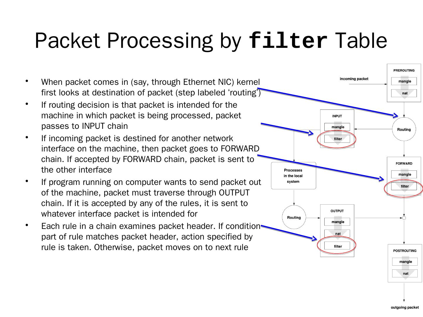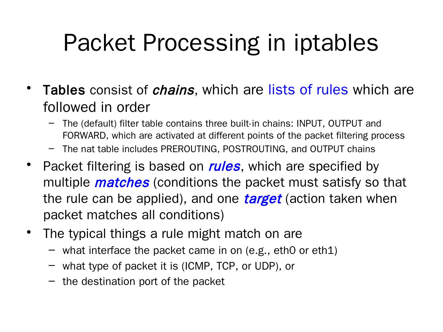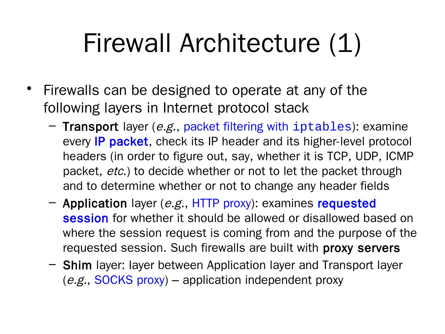 Transport layer (e.g., packet filtering with iptables): examine every IP packet, check its IP header and its higher-level protocol headers (in order to figure out, say, ...