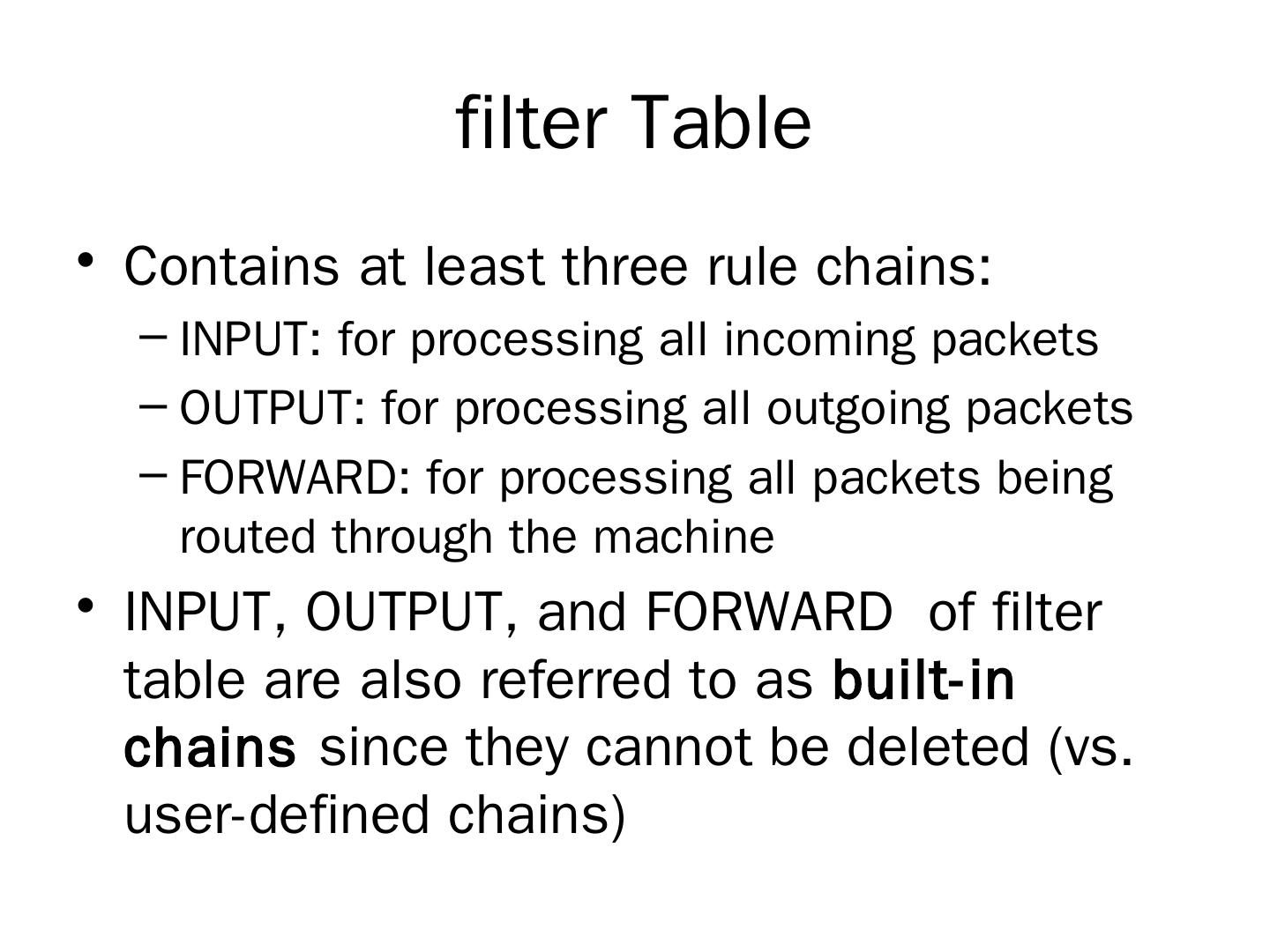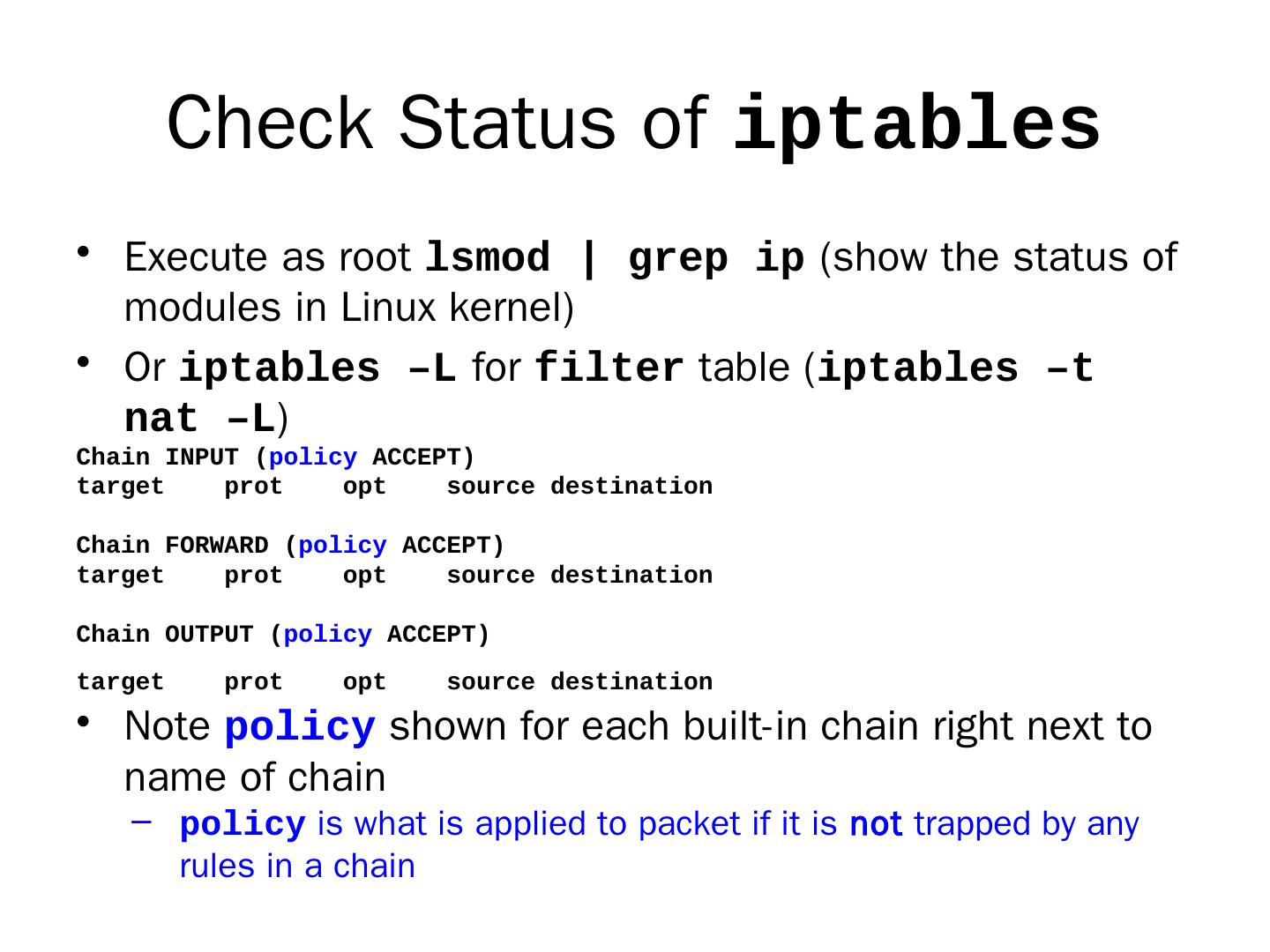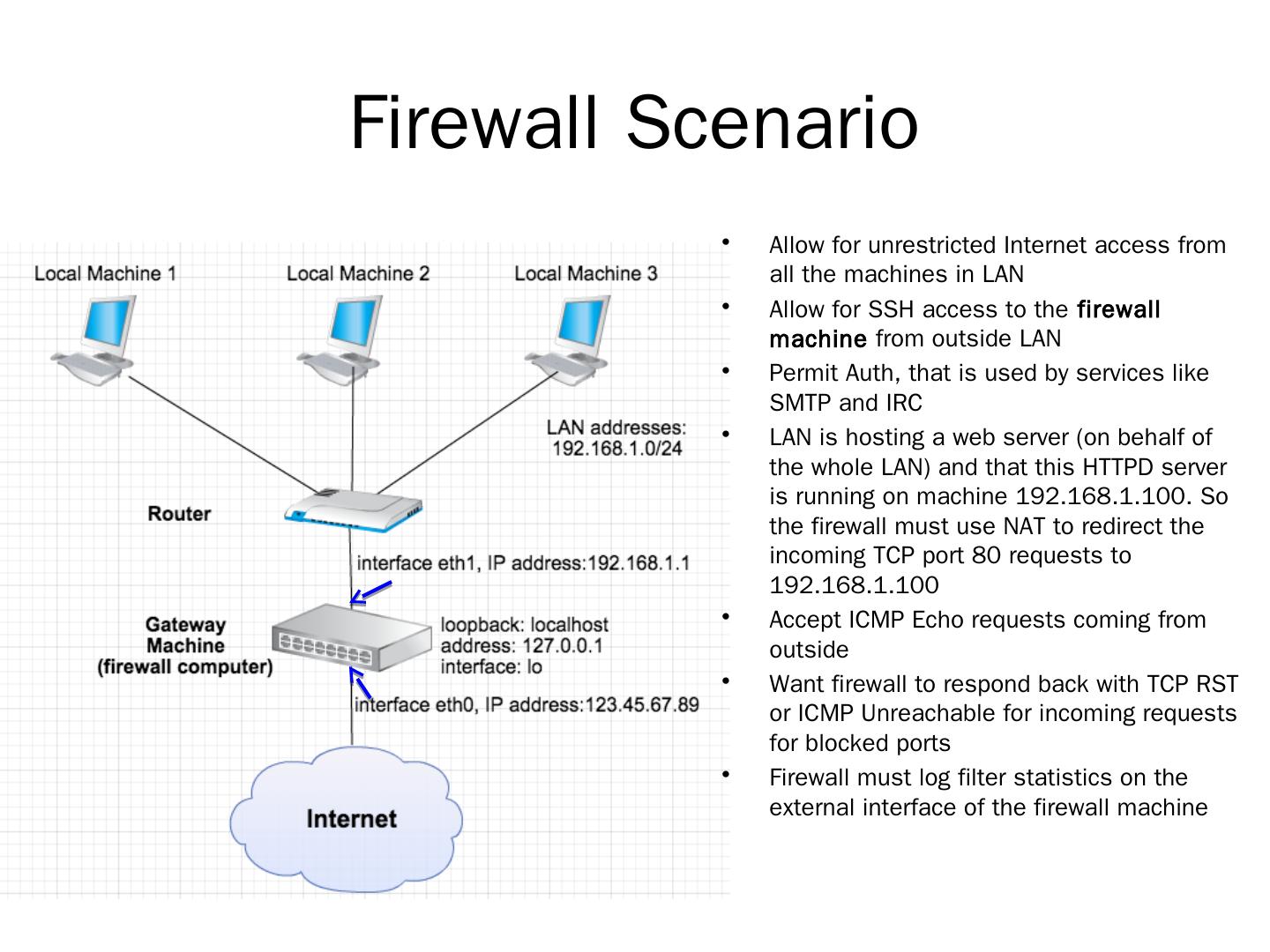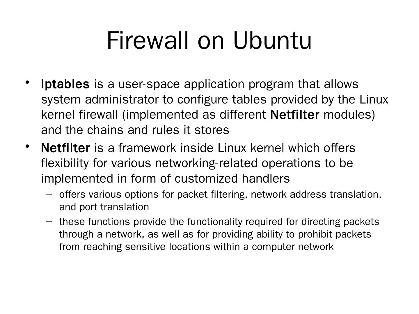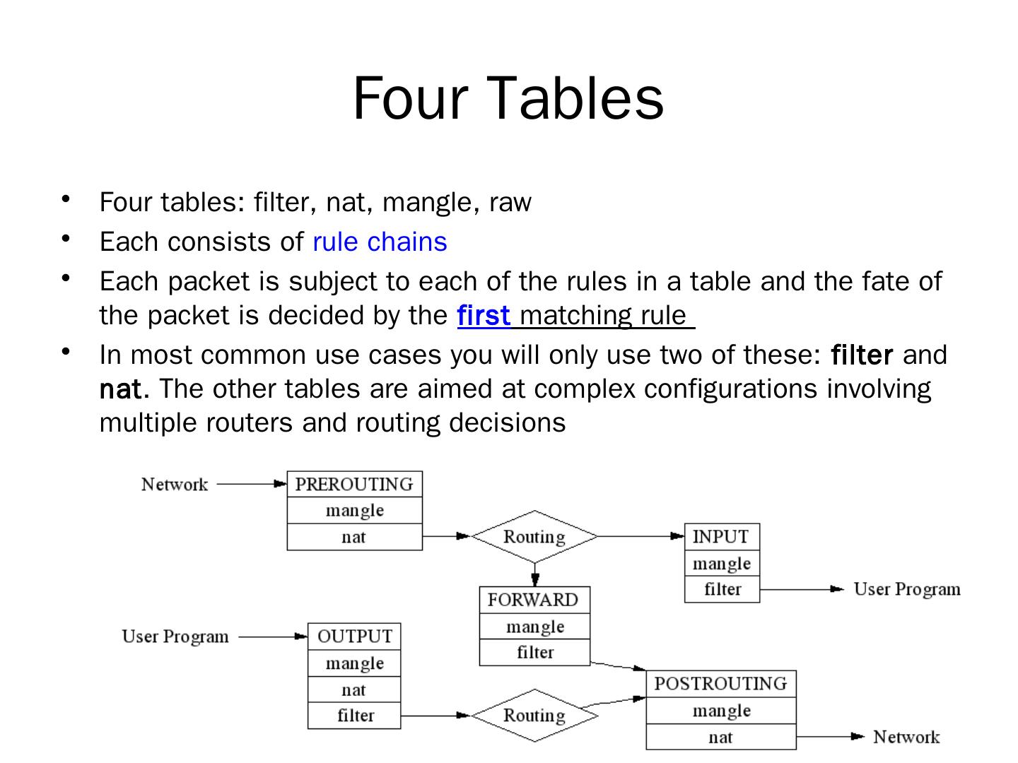 Transport layer (e.g., packet filtering with iptables): examine every IP packet, check its IP header and its higher-level protocol headers (in order to figure out, say, ...