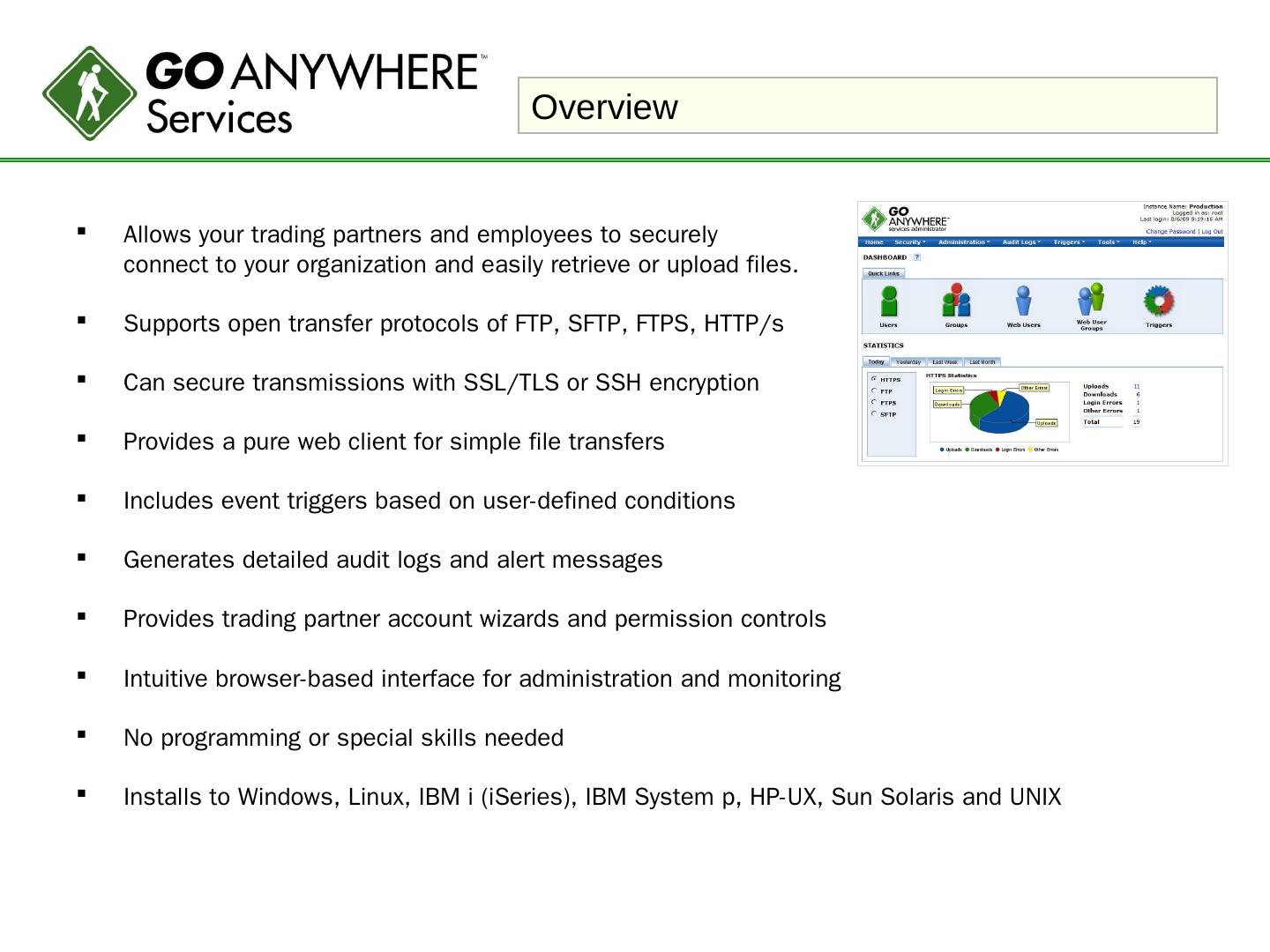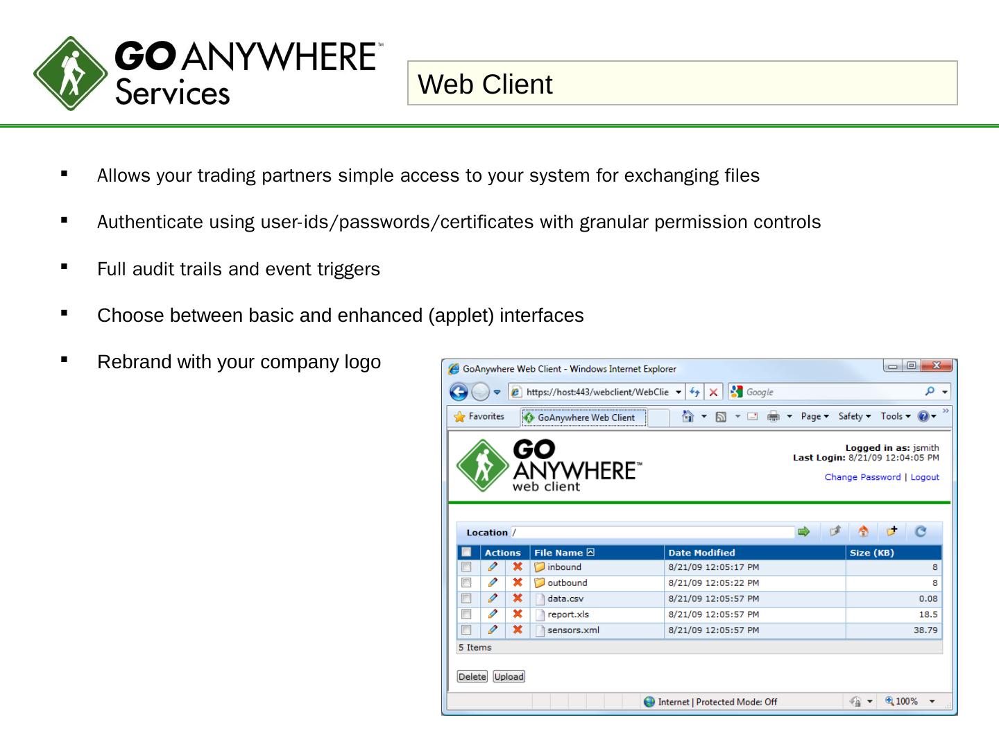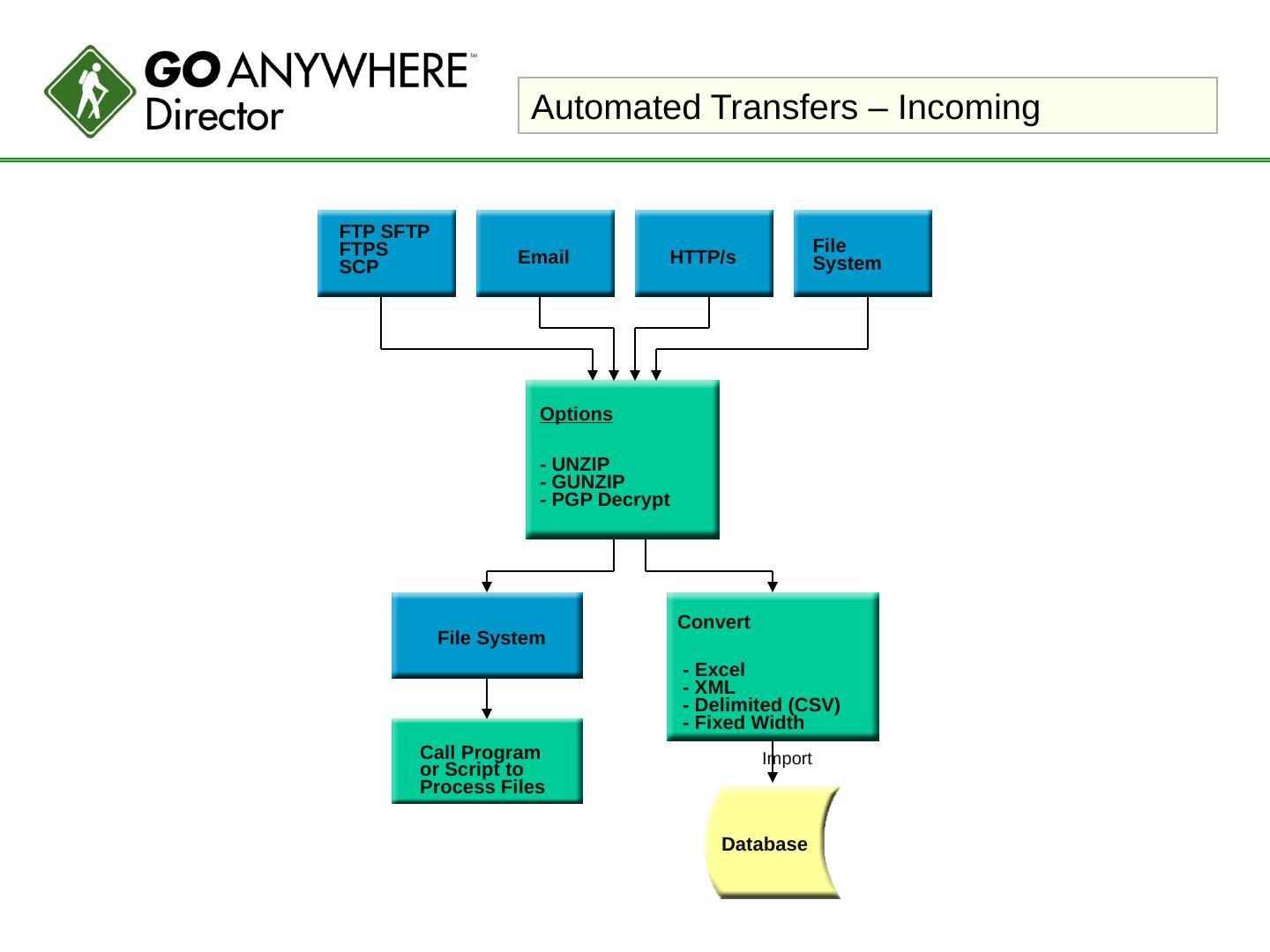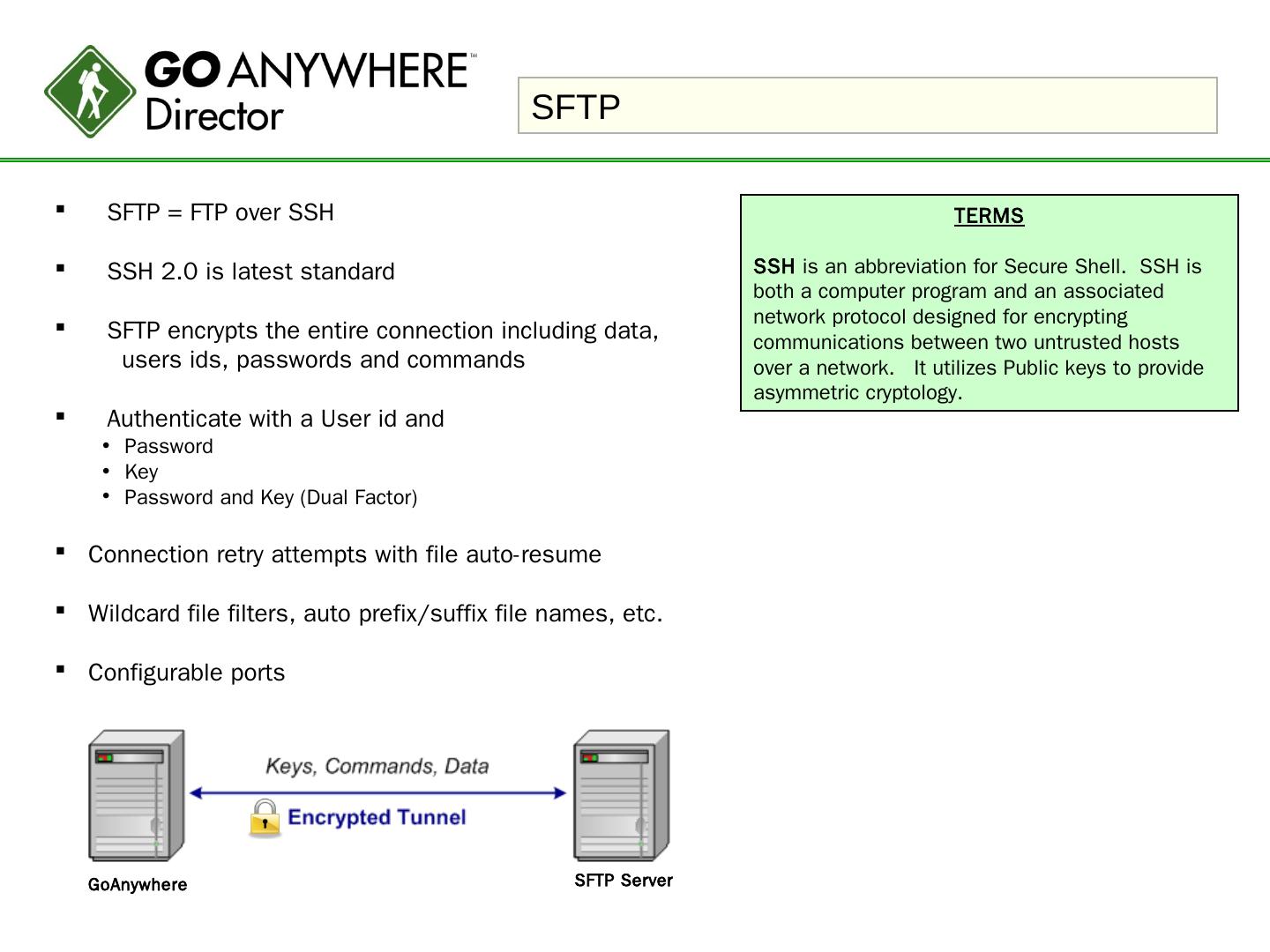 SFTP (FTP over SSH) - FTPS (FTP over SSL) - SCP (Secure Copy); Web Sites - HTTP - HTTPS (HTTP over SSL) - Web Services - AS2; Email - POP3 - IMAP